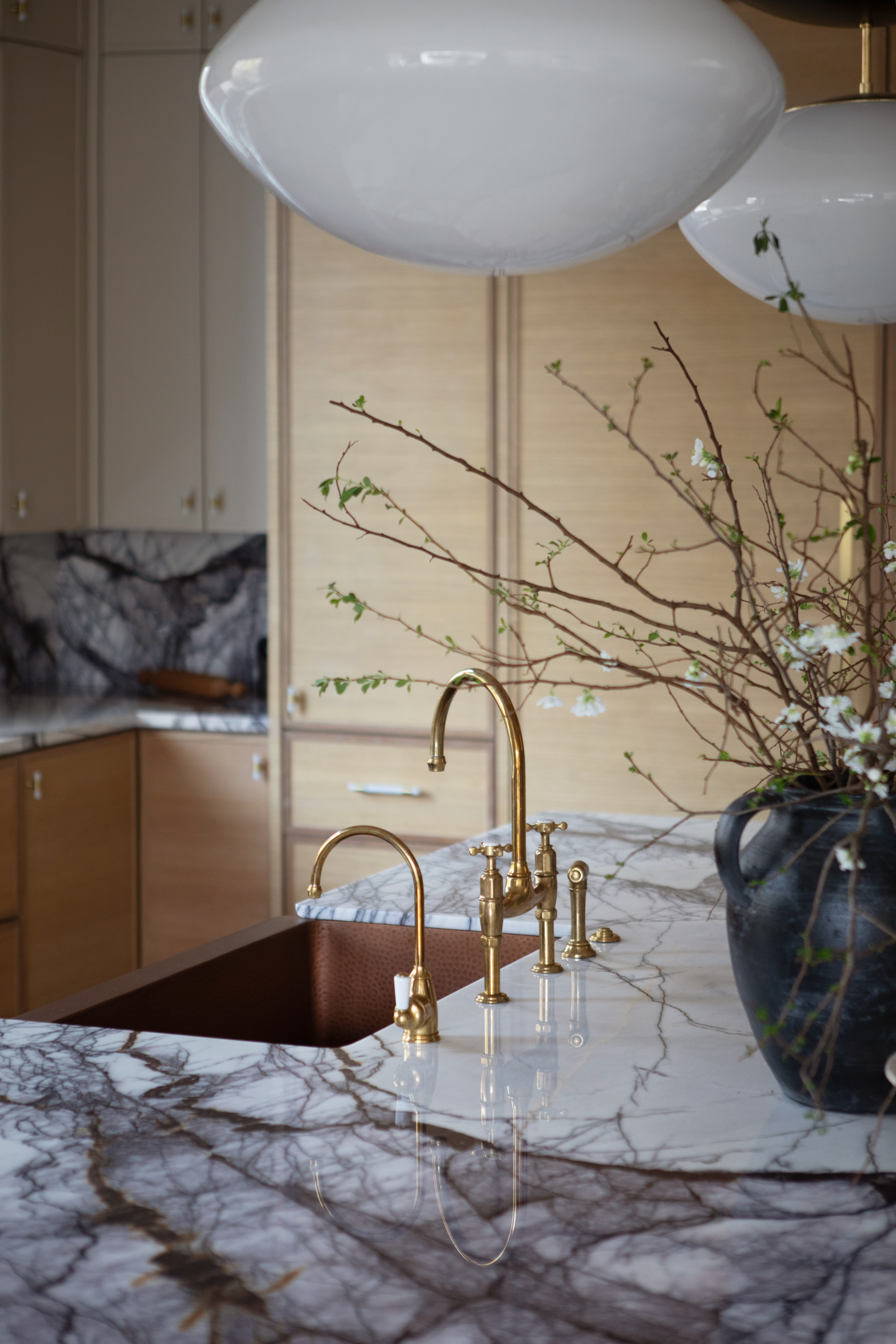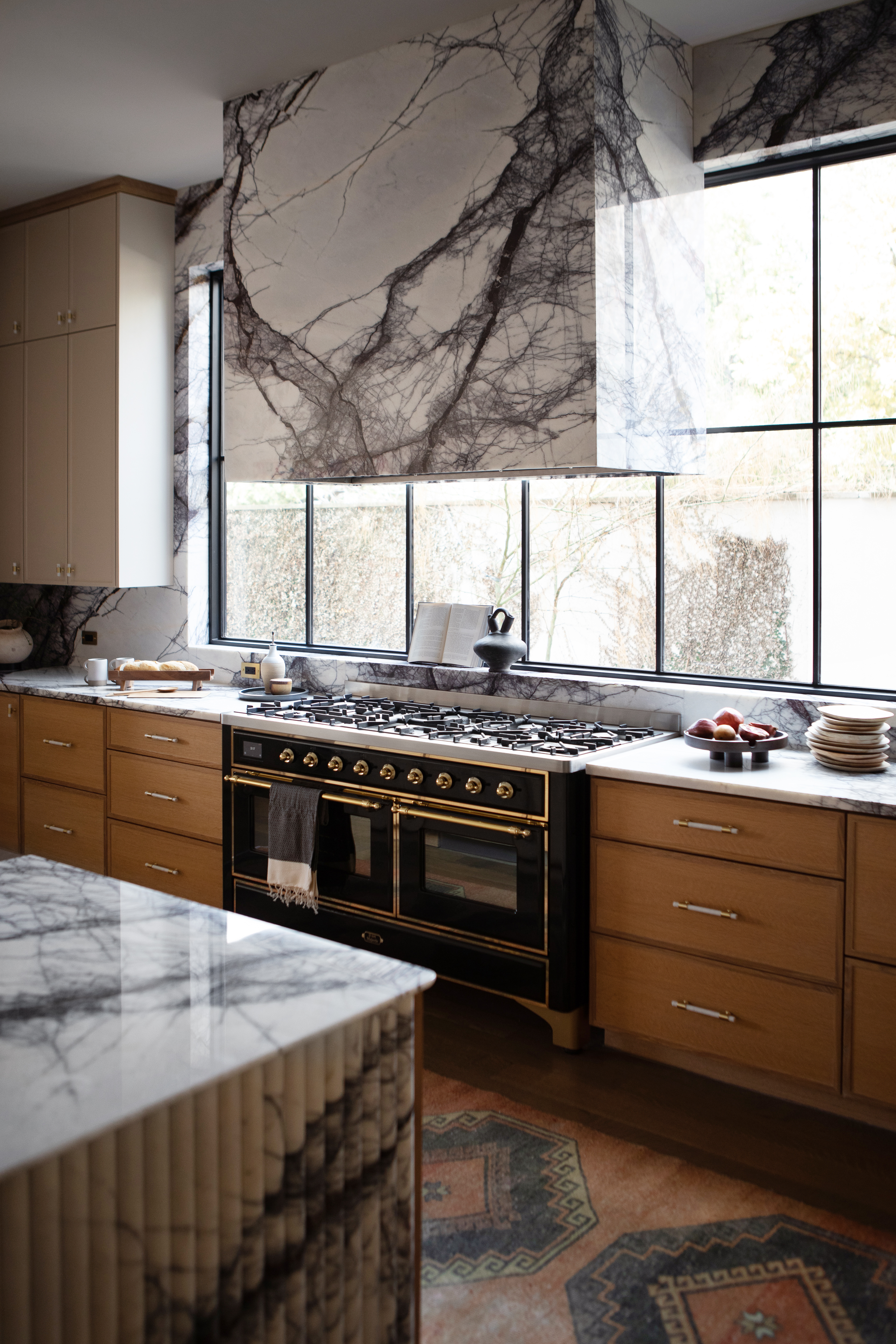 A more recent trend that you’ve no doubt seen all over TikTok is mob wife. The Sopranos-inspired aesthetic has mainly been covered in fashion, but as with all things in design, it’s also making its way into the kitchen. Specifically, in bringing back the early 2000s Tuscan style—which was huge with boomers of a certain suburban ilk—and giving it a modern Mediterranean makeover. A classically Tuscan kitchen has three elements that bring the look together: 1) brick, 2) dark wood and 3) granite. The color palette involves lots of brown and terracotta tones with honeyed/copper accents—mostly to replicate the sunshine and soil in Tuscan wineries. So now, we’re seeing a coastal version of Tuscan with an emphasis on the lighter, more airy Mediterranean Sea (as opposed to the deep and vibrant colors of the rolling hills). Instead of brick backsplashes and granite countertops, modern Med uses limestone on the walls and classic Calcutta marble or travertine on the surfaces. This makes it feel current without sacrificing rustic charm, perfectly in line with the updated farmhouse theme we’re seeing in interiors right now.