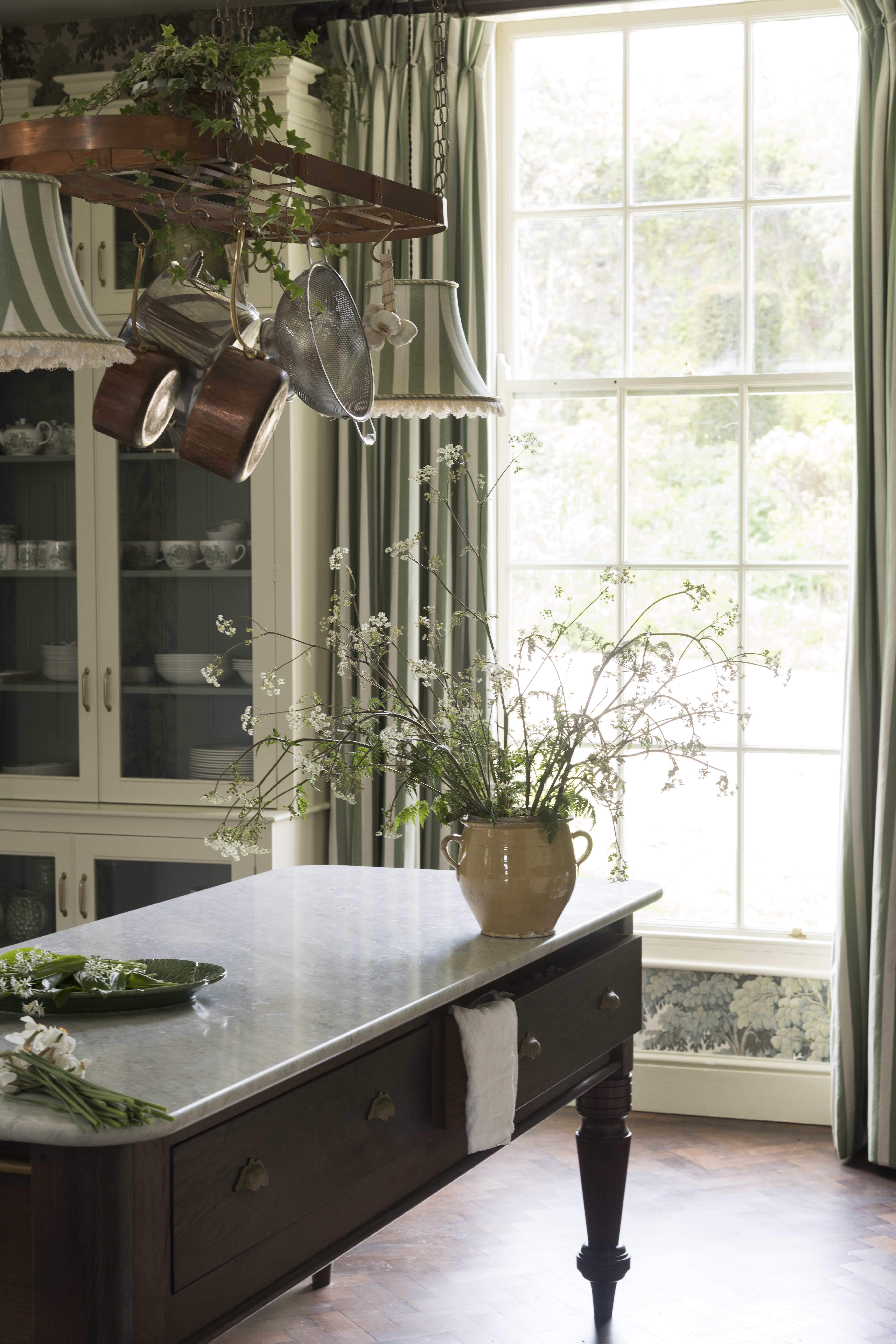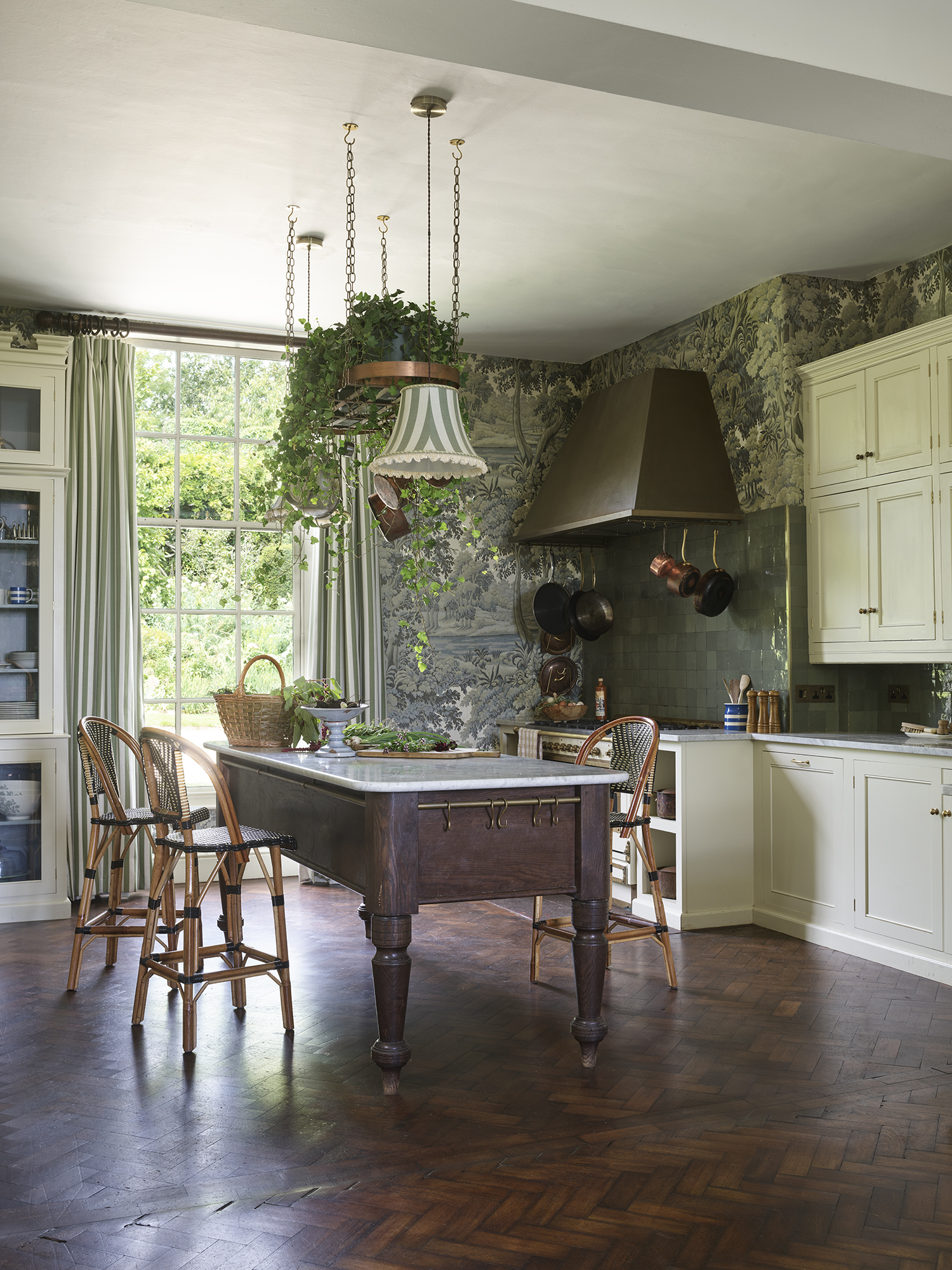 Around that time, we were introduced to the cottagecore trend: A cross between shabby chic and your favorite childhood fairy tale. It was an English cottage aesthetic that boasted everything from embroidered linens to antique frogs and floral teapots—all of which offered us an escape into pastoral-perfect living as we withered away in quarantine. In 2022, however, cottagecore’s kitsch seemed to lose its charm. What felt sentimental and nostalgic during lockdown became juvenile and tacky in the real world. So then, with the emergence of quiet luxury in 2023, the English cottage got a high-end makeover, paving the way for a more sophisticated take: English country kitchens. Instead of quaint ruffled valences and cluttered farmhouse tables, the look was elevated with timeless floral wallpaper, sprawling butcher block islands and glittering crystal chandeliers.