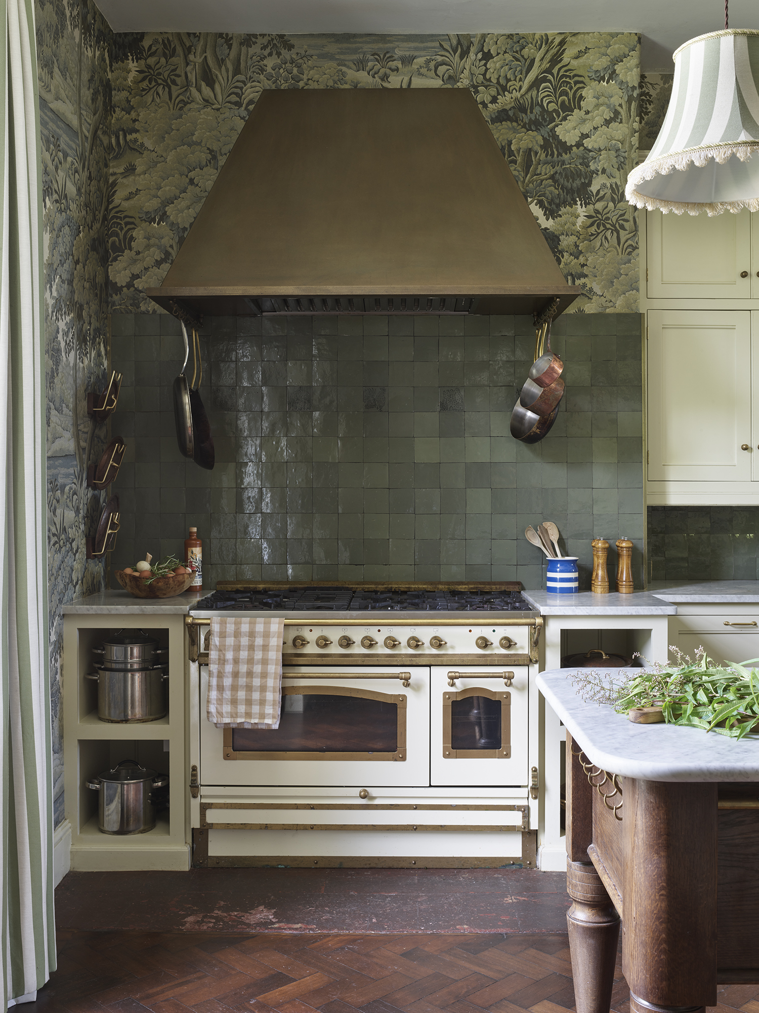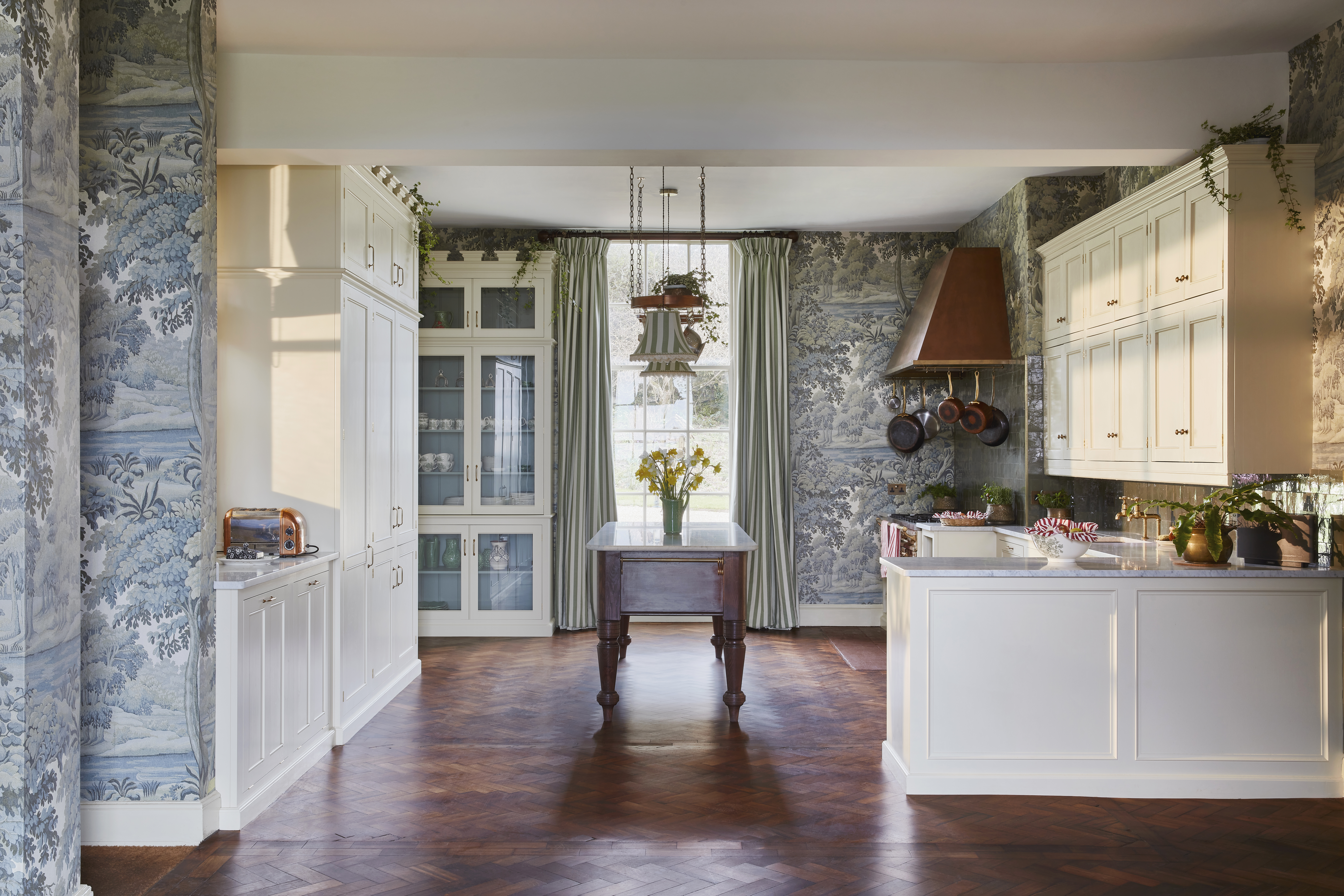 Naturally, Joanna Gaines’ farmhouse style mushroomed kitchen design for a reason. It not only mixed rustic wood with new materials—think quartzite and ceramic subway tile—but it felt inconspicuous enough to endure over time. However, as the HGTV star became a household name, so did the style she helped coin, becoming so ubiquitous that it started to feel stale. Around that time, we were introduced to the cottagecore trend: A cross between shabby chic and your favorite childhood fairy tale. It was an English cottage aesthetic that boasted everything from embroidered linens to antique frogs and floral teapots—all of which offered us an escape into pastoral-perfect living as we withered away in quarantine. In 2022, however, cottagecore’s kitsch seemed to lose its charm. What felt sentimental and nostalgic during lockdown became juvenile and tacky in the real world. So then, with the emergence of quiet luxury in 2023, the English cottage got a high-end makeover, paving the way for a more sophisticated take: English country kitchens. Instead of quaint ruffled valences and cluttered farmhouse tables, the look was elevated with timeless floral wallpaper, sprawling butcher block islands and glittering crystal chandeliers.