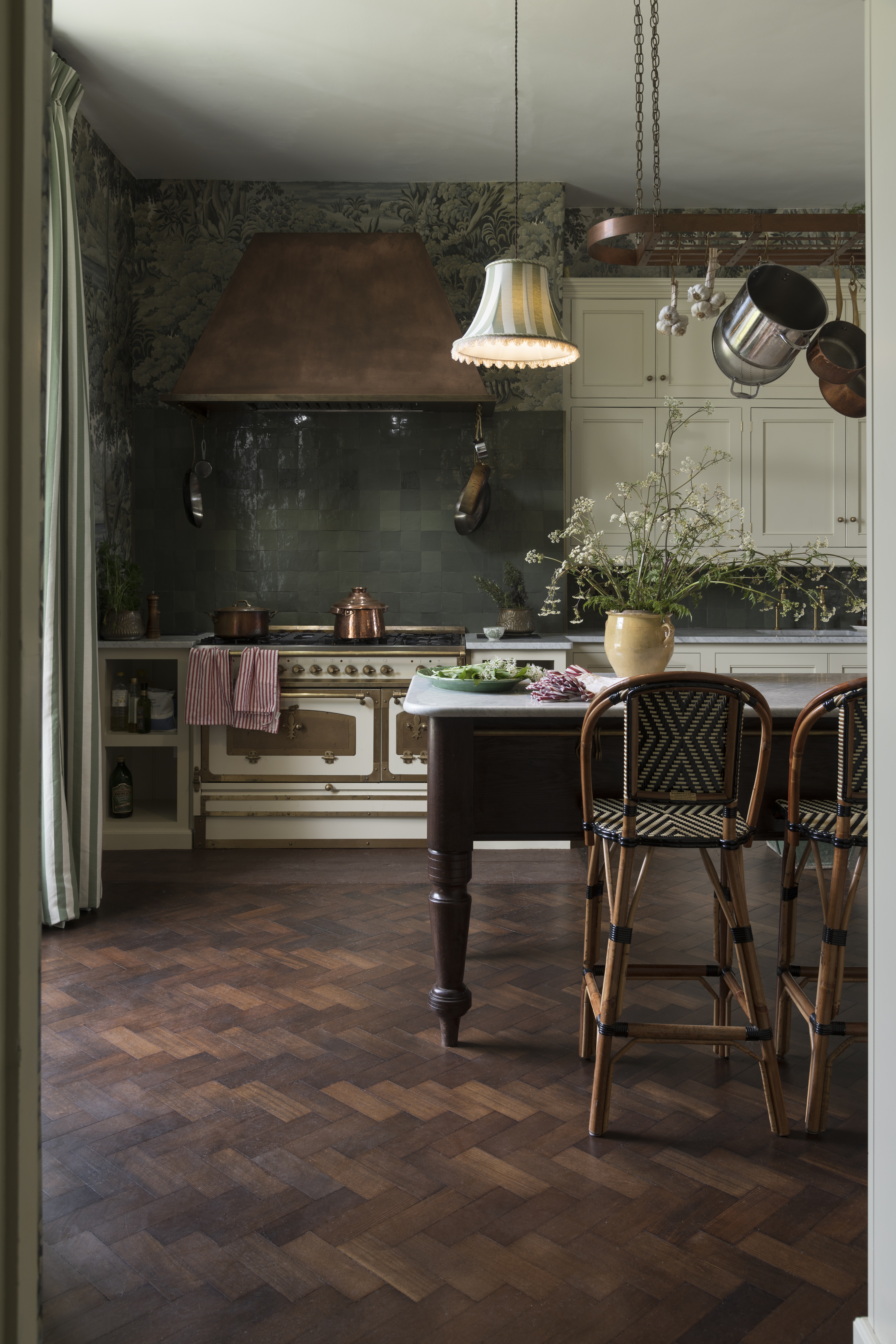Still, while English country kitchens have been around for centuries, this year’s rendition takes a more contemporary approach to age-old European design. Think traditional details like ornate ceiling moldings and herringbone hardwood floors with upgraded materials like copper and zellige. Basically, it keeps the silhouettes clean-lined and classic and updates everything with finishes that make it feel current. It has the same classic-yet-cozy draw as farmhouse, but the design toes the line between royal Bridgerton and posh Victoria Beckham townhouse.