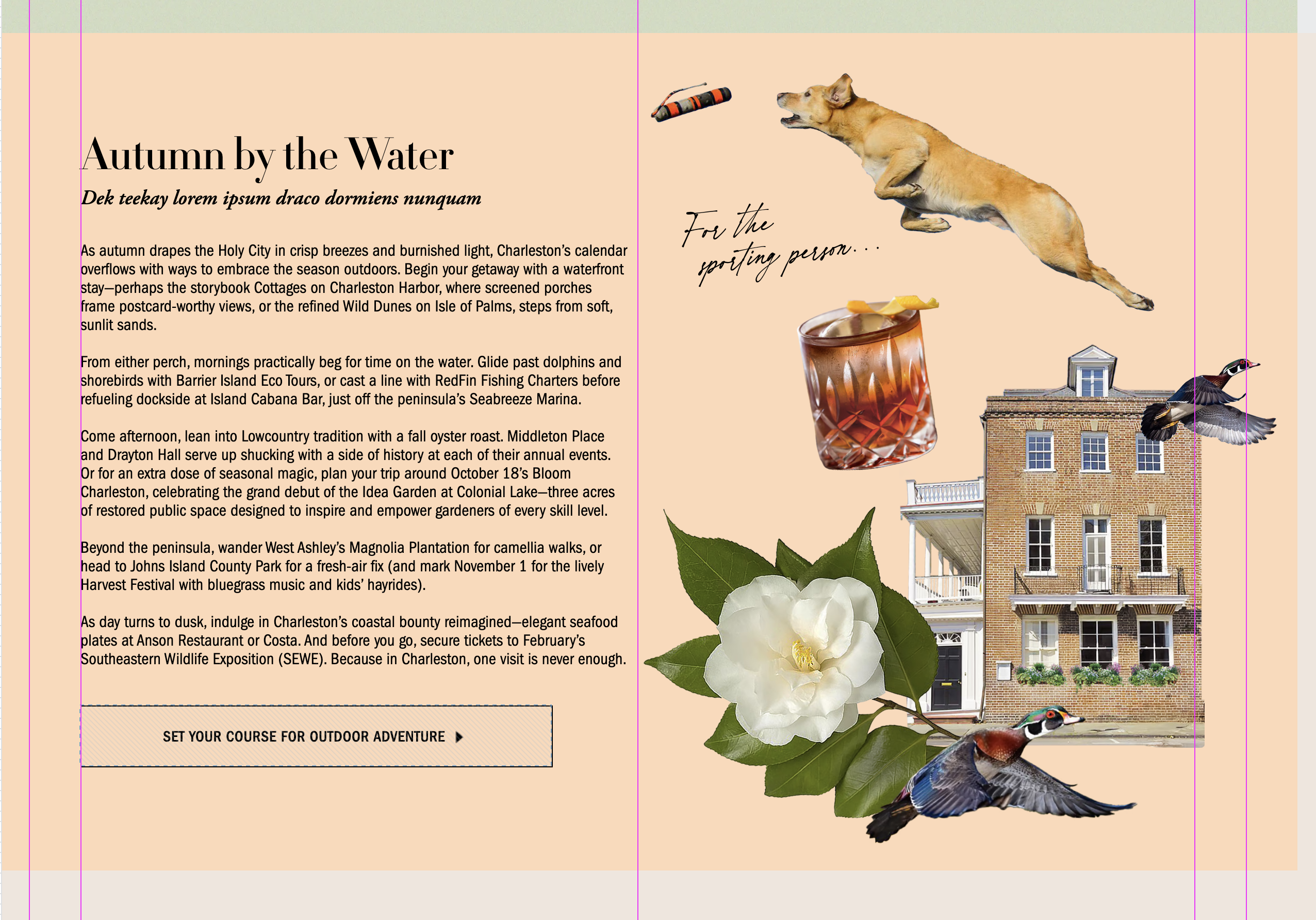 Start by booking a waterfront stay—perhaps at the storybook Cottages on Charleston Harbor, where screened porches frame postcard-worthy views, or the refined Wild Dunes on Isle of Palms, located just steps from the soft sand. From either perch, the allure of spending time on the water is undeniable. Glide past dolphins and shorebirds with Barrier Island Eco Tours, or cast a line with RedFin Fishing Charters before refueling dockside at Island Cabana Bar just off the Seabreeze Marina.