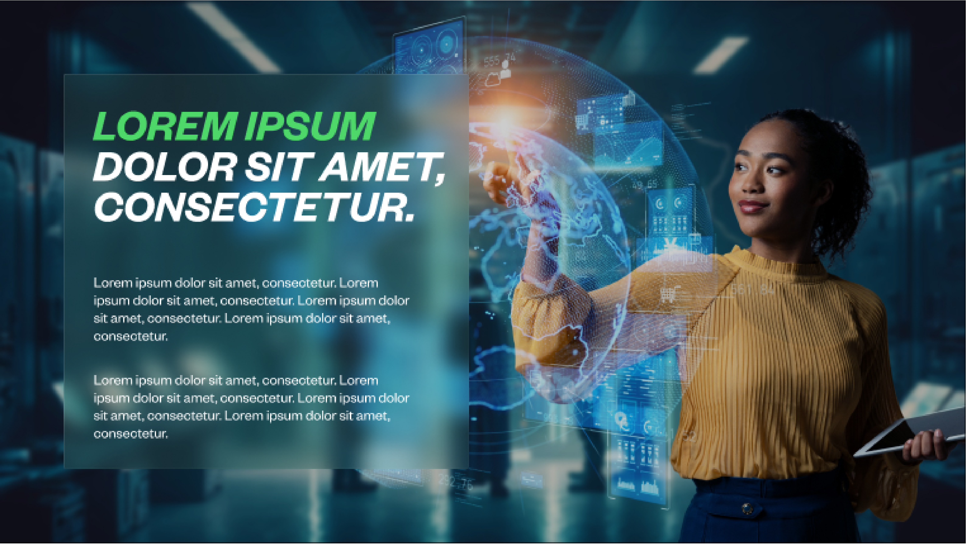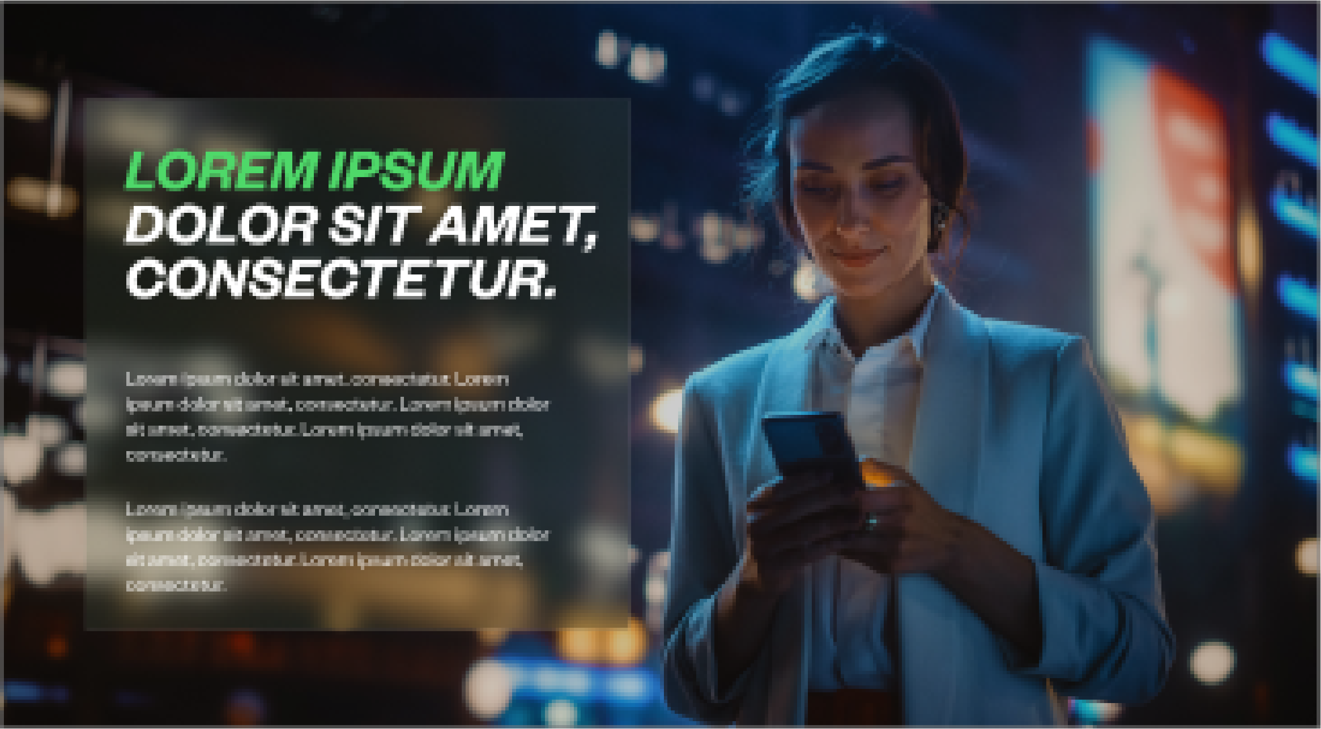 We add sophistication to the new visual style for GTT and expand its creative vision further by introducing the blur effect for the creative assets.It’s a smart, sophisticated and unique approach to highlight details while maintaining clarity and cohesion and provides a unique combination to show details. Blur effects can be applied across different visuals to create a background that enhances text legibility when placed over images. Blur boxes can also be used in designs to provide a clear visual structure for the text, ensuring it stands out effectively.The overlay effect serves the same purpose as the blur, providing a background that enhances text legibility, but it is primarily used in PowerPoint presentations or other designs where the blur function is not available (seen on the next page).Text box style will vary from print to digital/web. For use on the web, we will also incorporate a radius to soften the look and improve engagement.