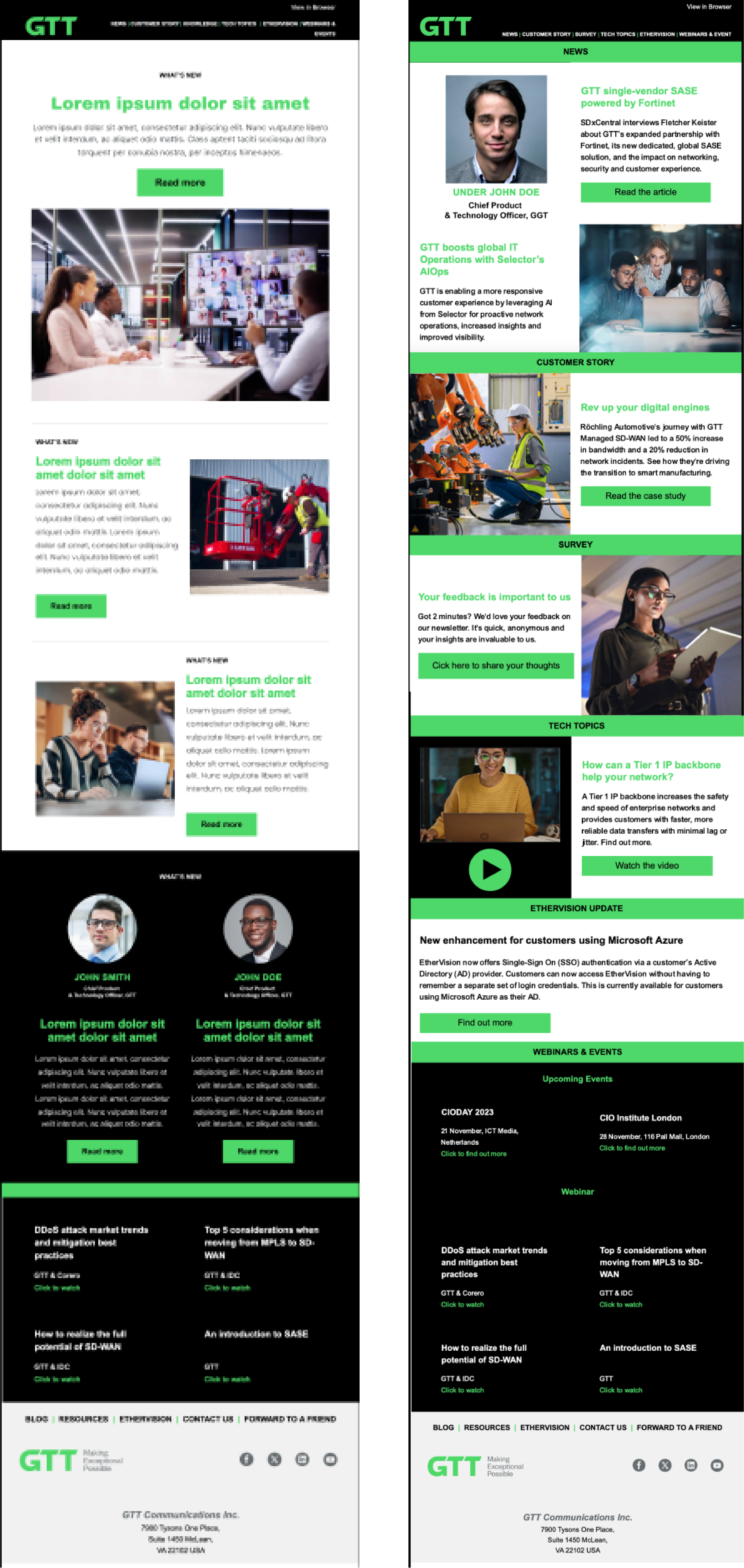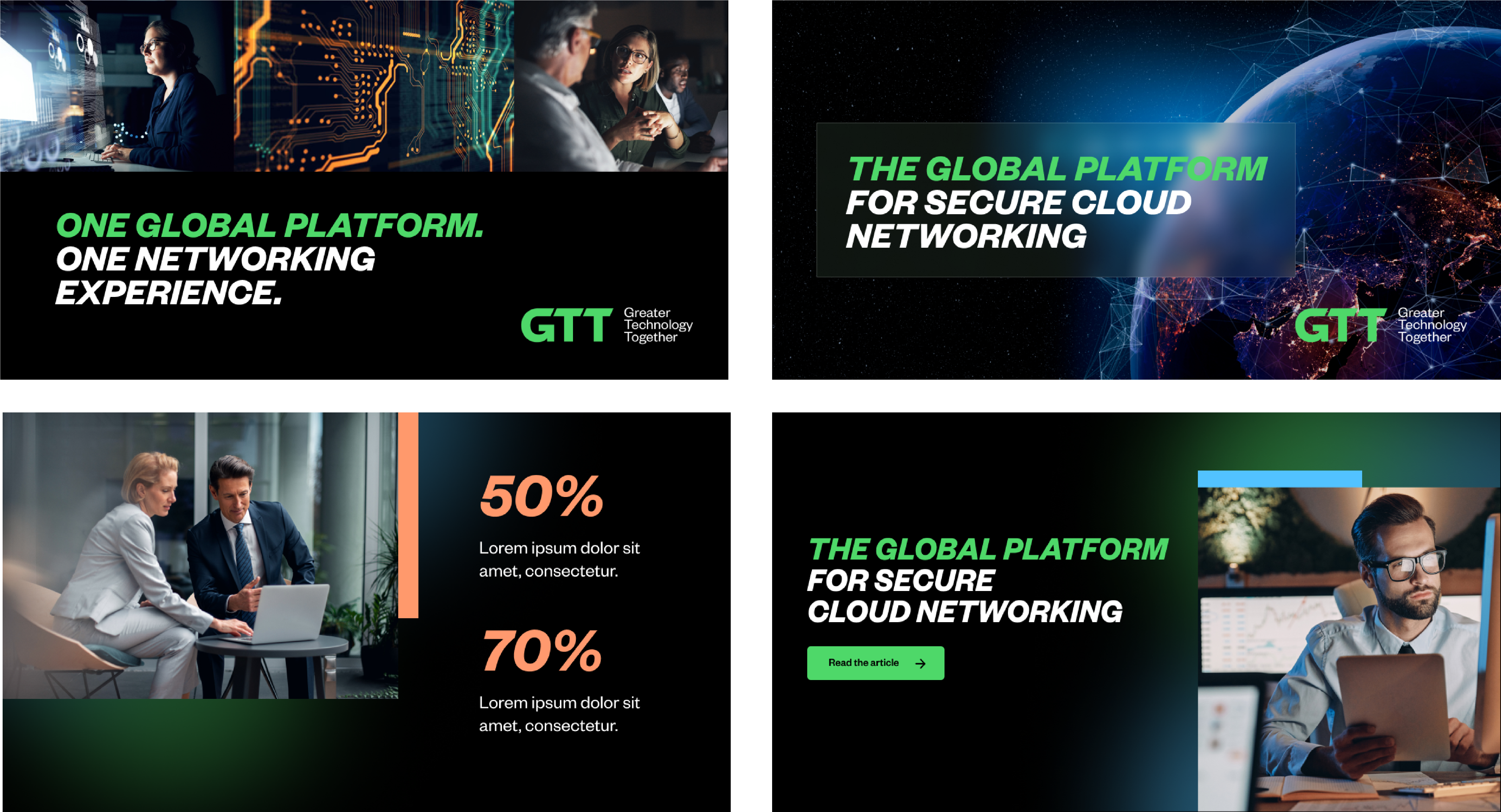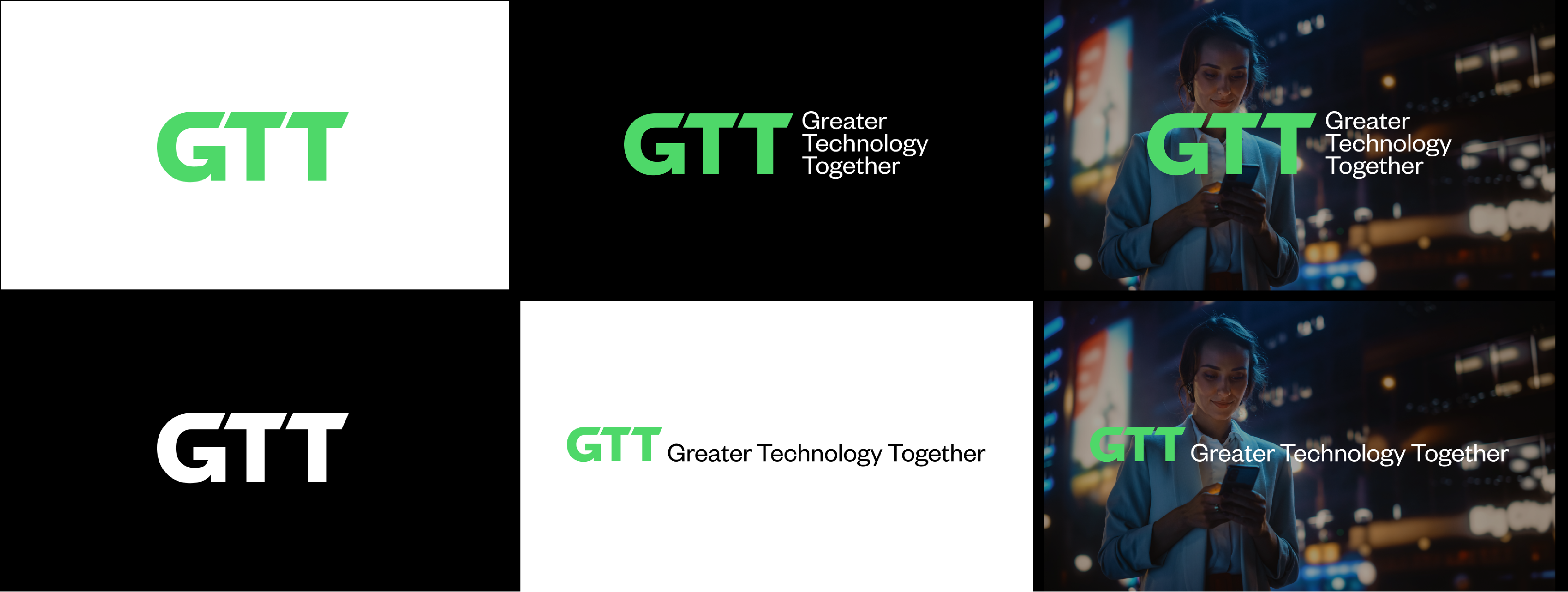 GTT Green, black and white is a key feature of our brand recognition and should be always present across all visuals. When designing, always consider starting with black as the background. It serves as a strong backdrop that enhances the visibility of our logo and messaging. However, if the design involves a large amount of text, using white may be more appropriate to improve readability.