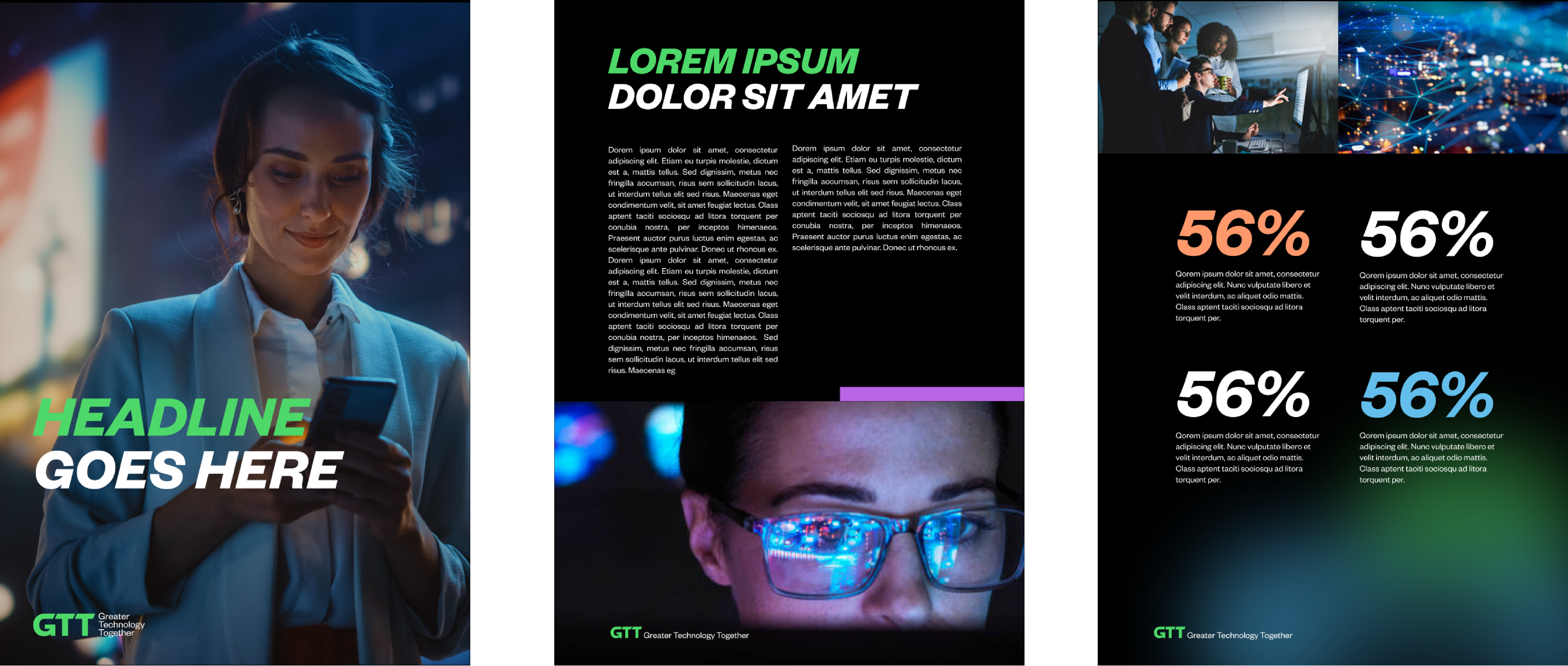 For brochures and print materials, prioritize a clear and engaging layout that combines striking headlines with easily readable body text. Incorporate color strategically, using secondary colors to create emphasis and distinguish key points, while keeping the overall layout clean and professional. Shapes should complement images, positioned subtly to avoid overpowering the content, preserving the clean, sharp aesthetic that characterizes GTT’s brand.
