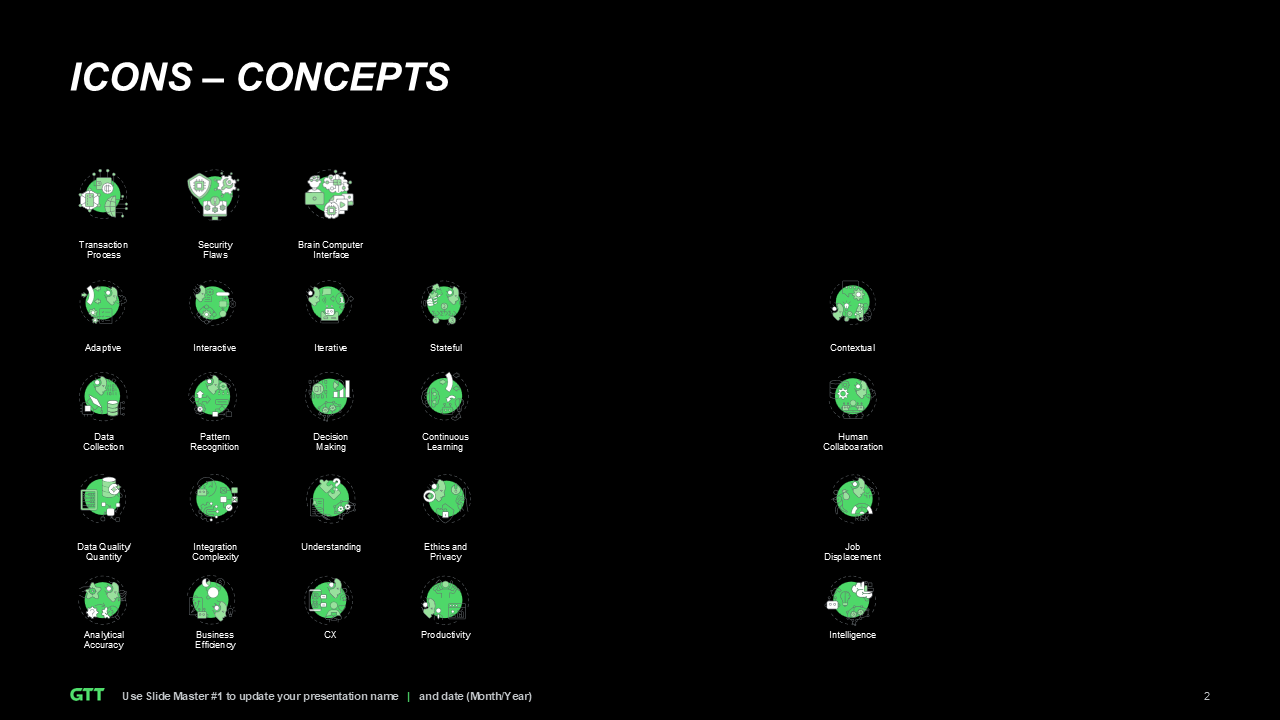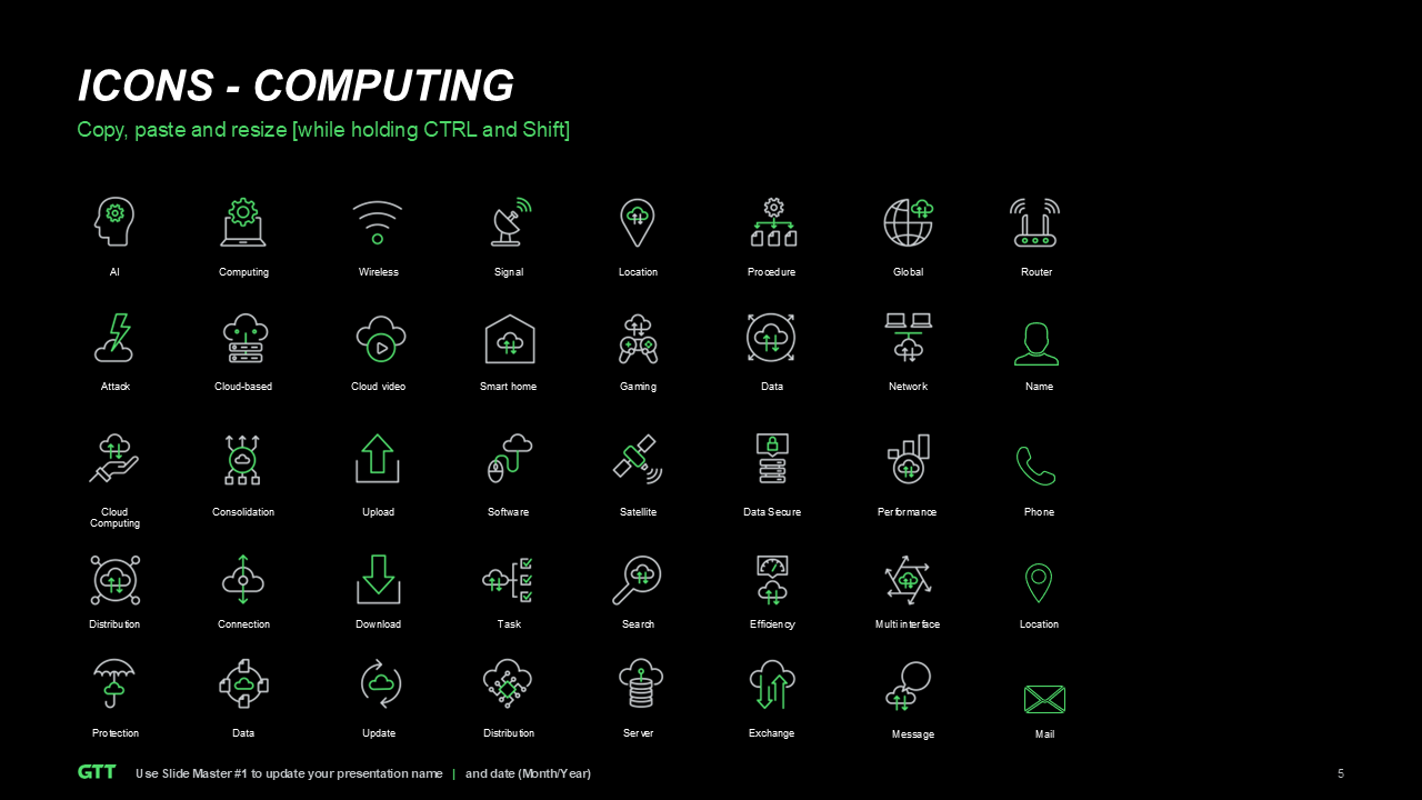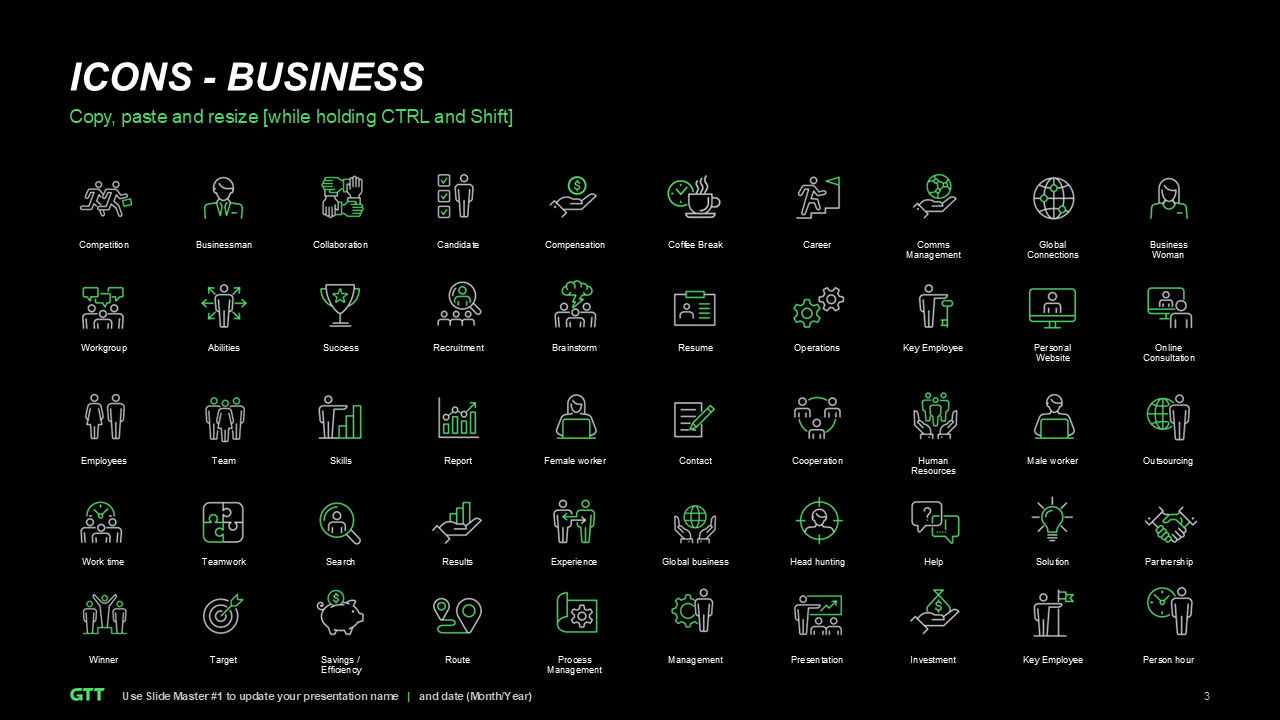 Our icon style uses black or white line punctuated with GTT Green and secondary color details. This combination of black or white and color highlights can be applied to create multiple icon colorways while still keeping the overall styling on brand.Outline thickness of these icons should always be consistent. Icons help enhance the information you're presenting by adding visual context and emphasis. They should always complement and support the accompanying text.Ensure that the icons' colors align with the color scheme of the visual assets within the text. When using multiple icons on a page, limit the palette to a maximum of three colors to maintain a cohesive and polished appearance, avoiding a cluttered or overly colorful design.