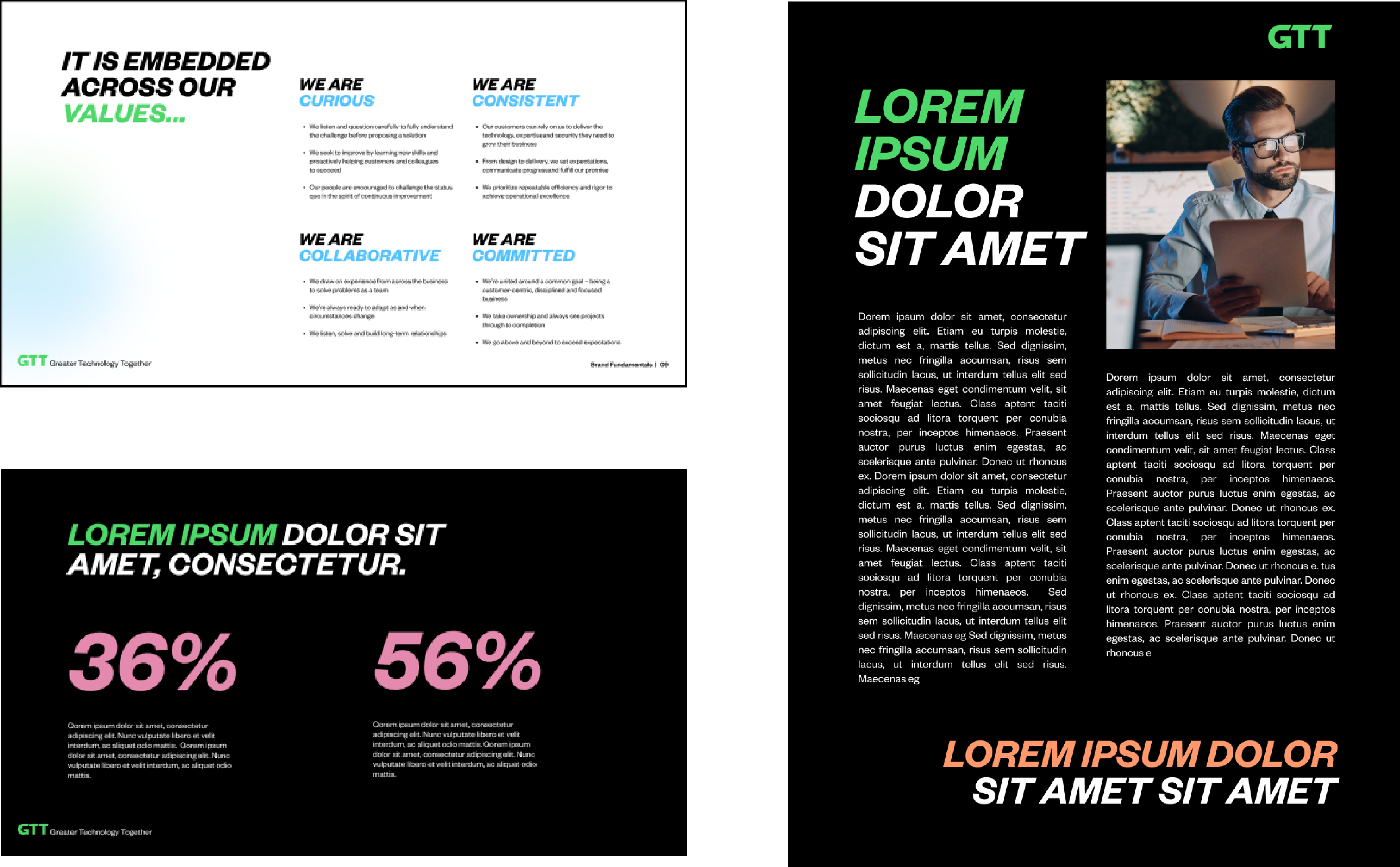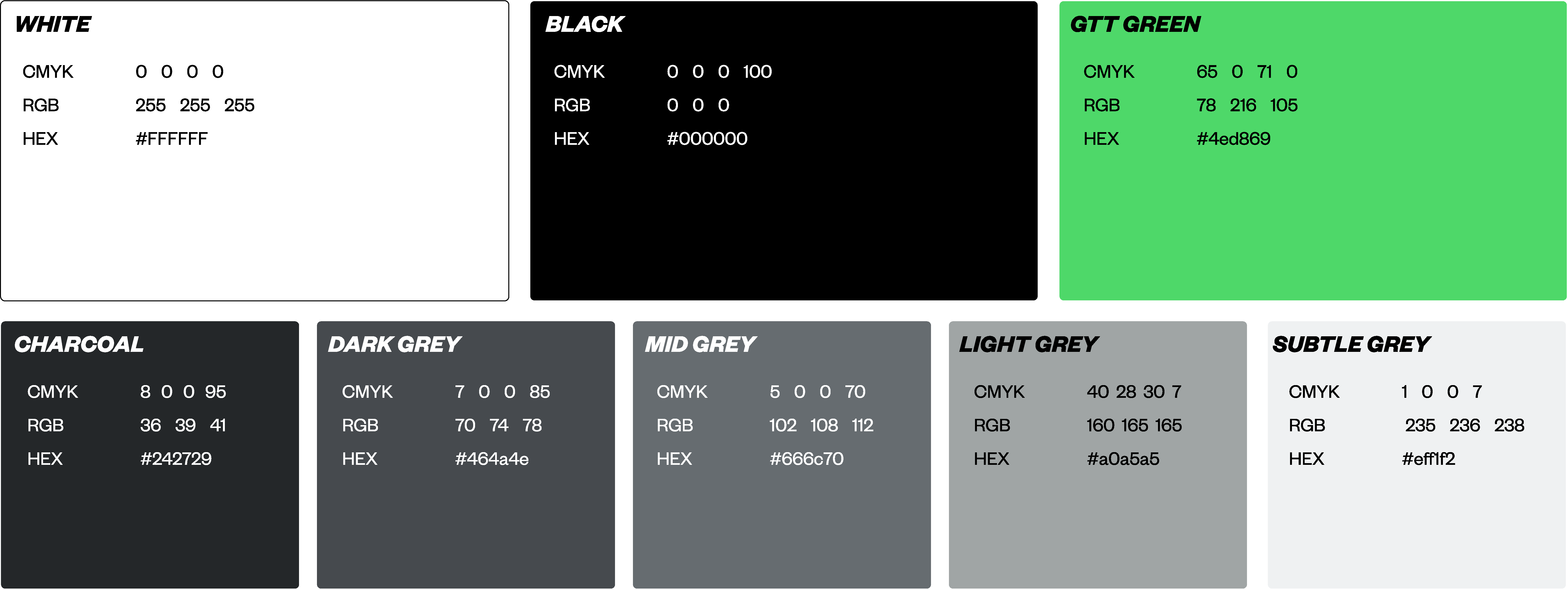 By combining regular and italic typography with a color palette of black, white, GTT Green and secondary colors, we achieve a cohesive and recognizable brand identity while maintaining flexibility in design. This approach allows for the creation of engaging layouts with eye-catching taglines that stand out, all while keeping the design clean and uncluttered. The result is a visually appealing and versatile style that supports brand consistency without sacrificing creativity.Secondary colors should be used strategically across visual assets to enhance emphasis and support text hierarchy without overwhelming the design.