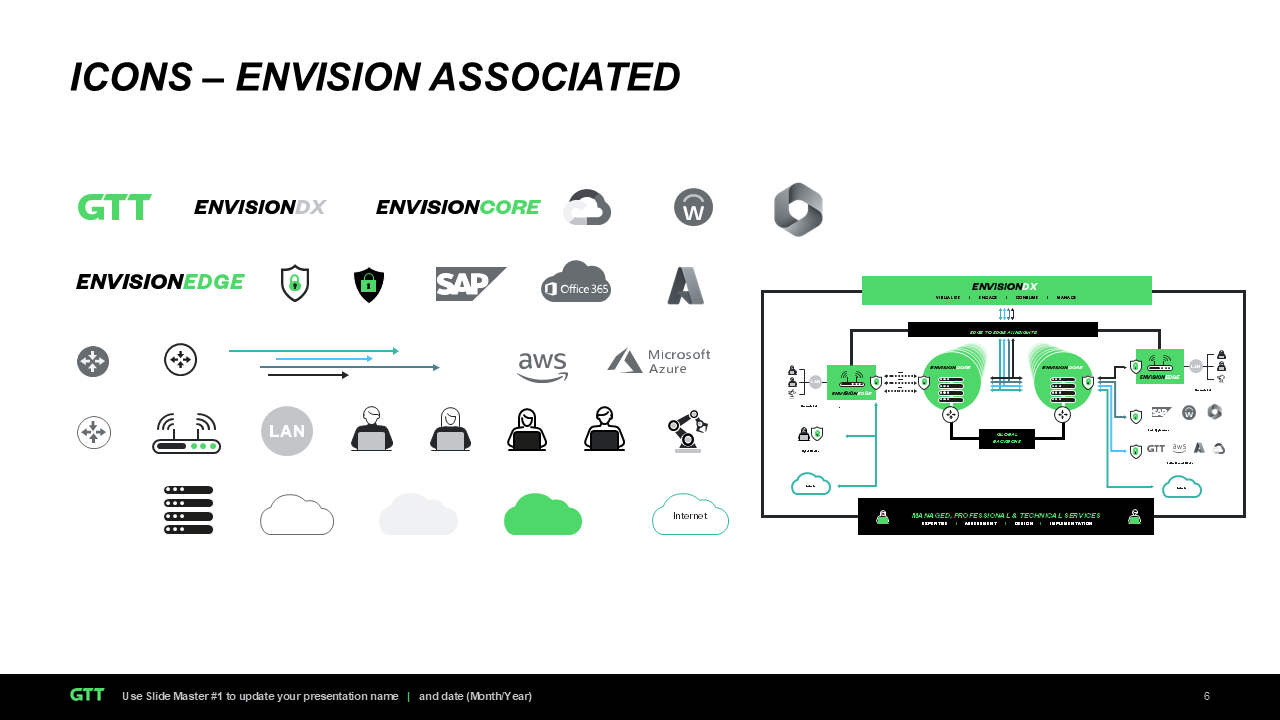 Headings: Use capitalized text for headings Maintain the color scheme consistent with the brand (e.g., GTT Green, white and secondary color) and avoid any additional spacing between GTTEnvision and CORE/DX/EDGE Example: GTTENVISIONEDGE or GTTENVISIONDX Body Copy: In body text, write “GTTEnvision” in title case, capitalizing the component name.I n body copy, do not use colours. Words shouldbe the same colour as body copy. Example: GTTEnvisionEDGE or GTTEnvisionDX Logo Usage: For branding consistency, utilize the official Envision logo when presenting marketing materials or PowerPoint presentations. Additionally, apply a secondary color for the component names to distinguish between them, providing clear visual guidance for users. This approach not only enhances brand recognition but also helps users quickly identify and differentiate the various Envision components.