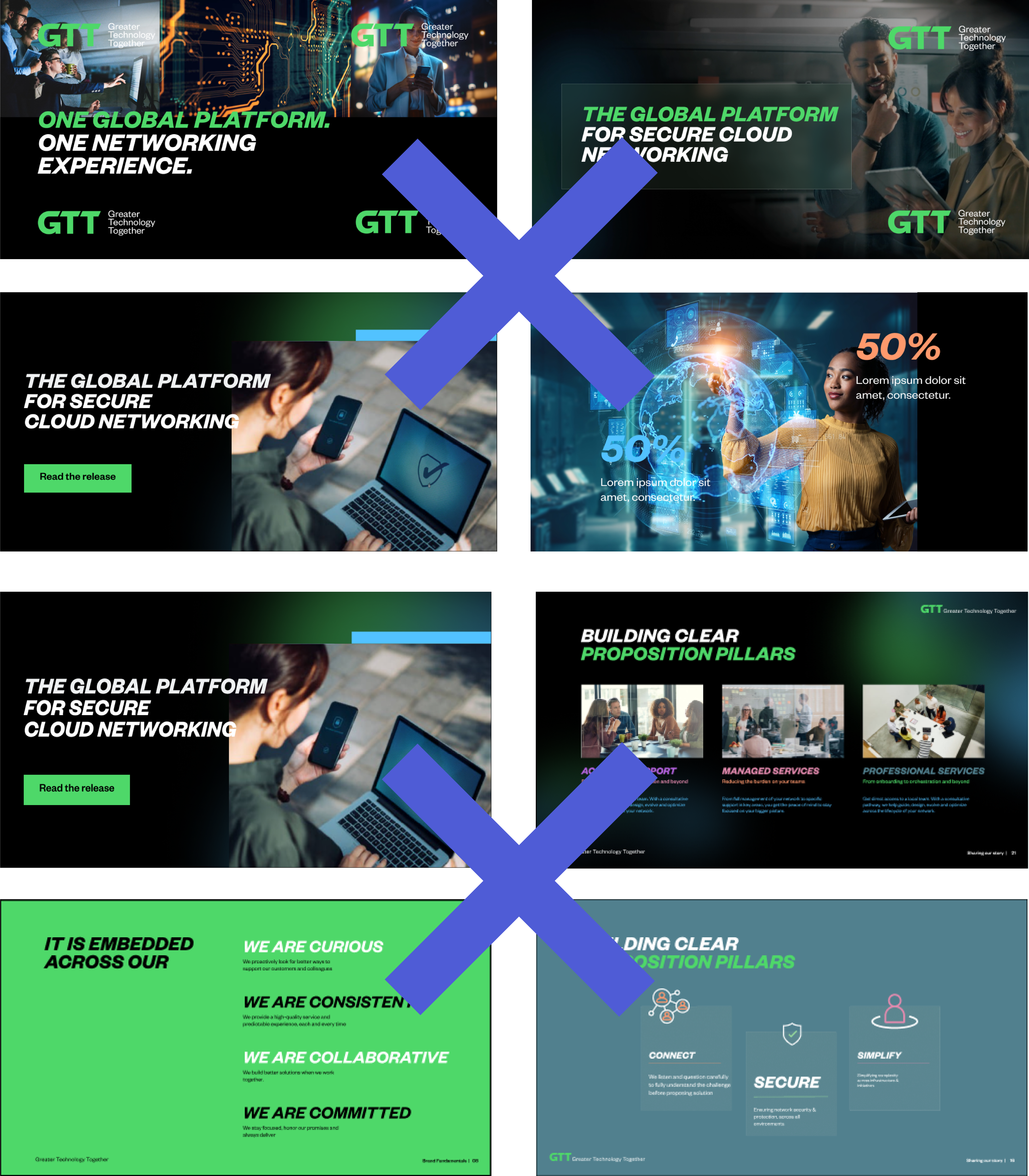 Use multiple GTT logos on one visual Overlap text over images Use heading all in one color Randomly place text and images on the grid Run text or icons over background imagery of the same color or not enough contrast so all or part of the text or icon is illegible Add a lot of text on one slide Use colored backgrounds anywhere except divider slides Use all secondary colors on one slide Use color on the body copy Use inconsistent font sizes across the pages Use "Envision" in any fomr