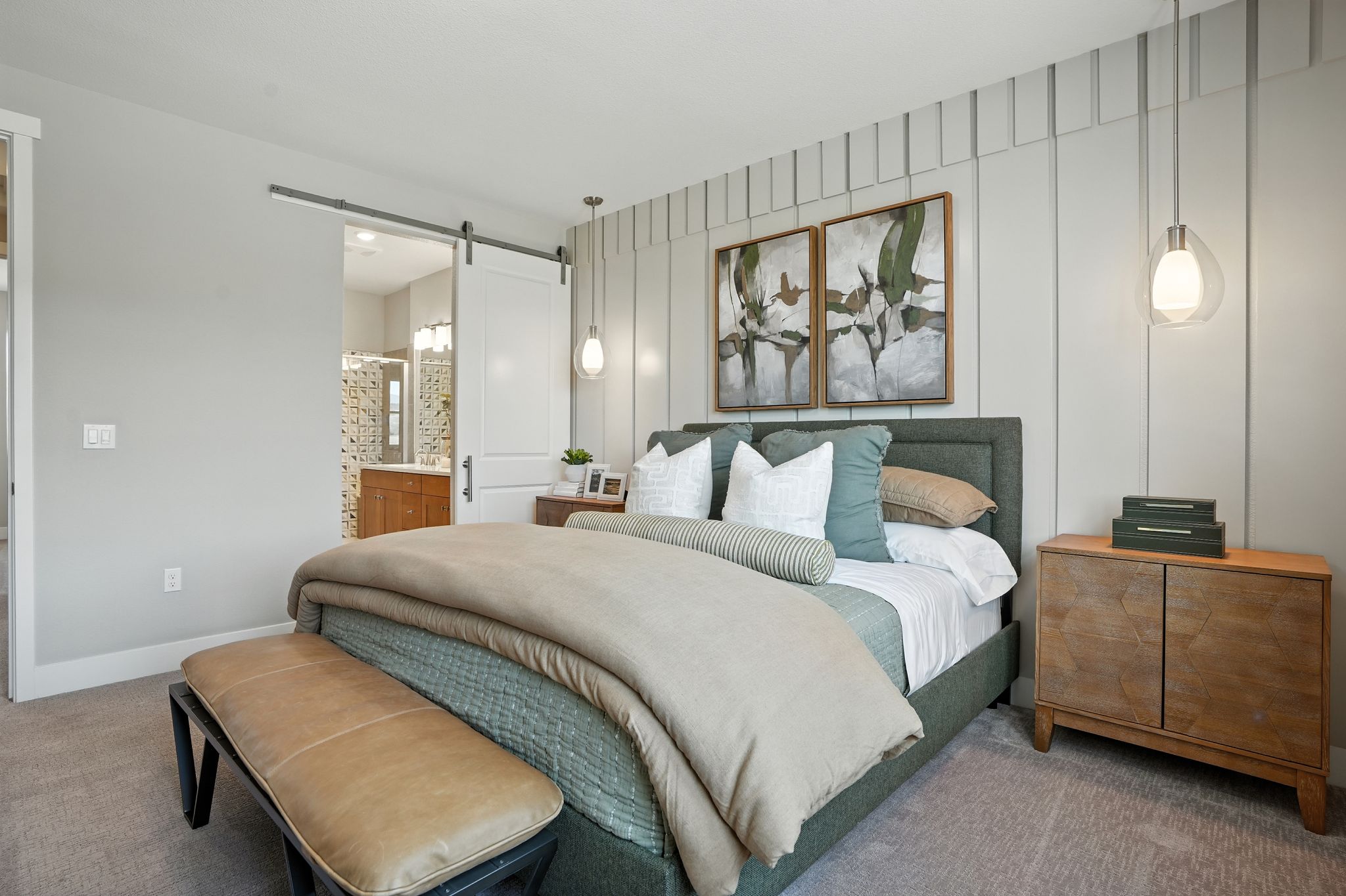 A rustic barn door adds character as it opens from the primary bedroom into the inviting en suite, complete with designer tile for that extra splash of style.