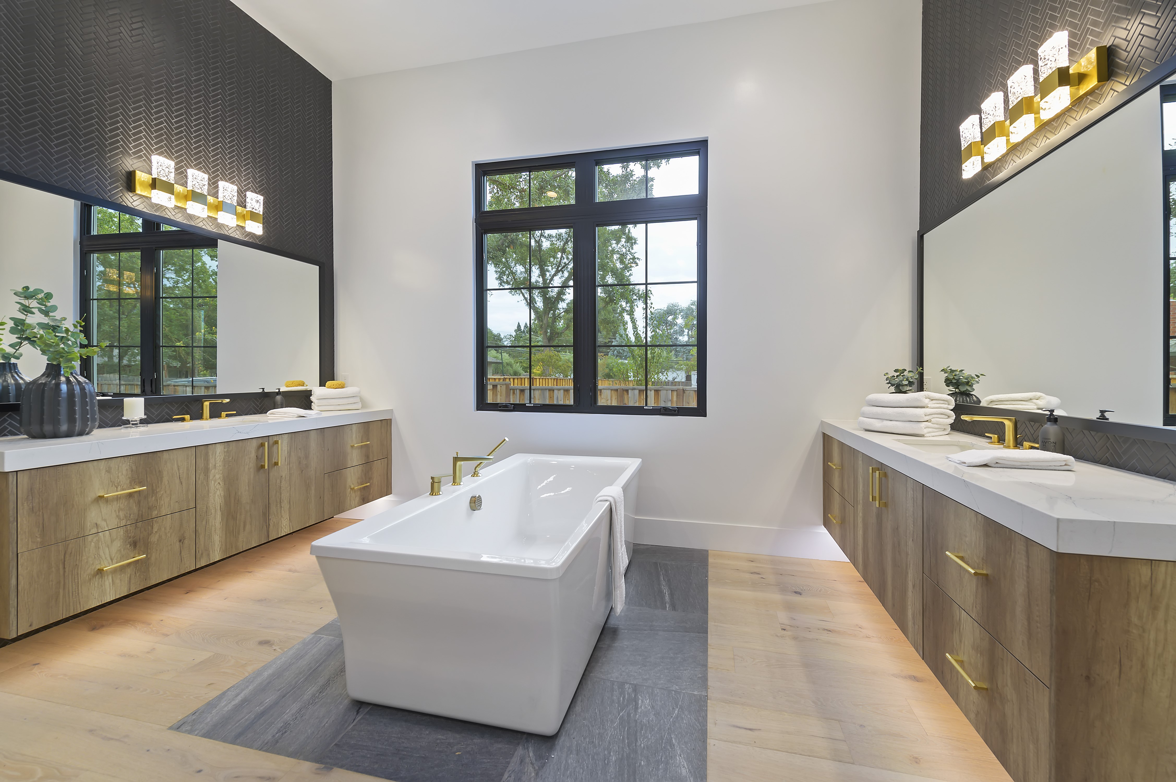 Spa-inspired primary bath with a freestanding soaking tub, dual vanities, and luxury finishes.