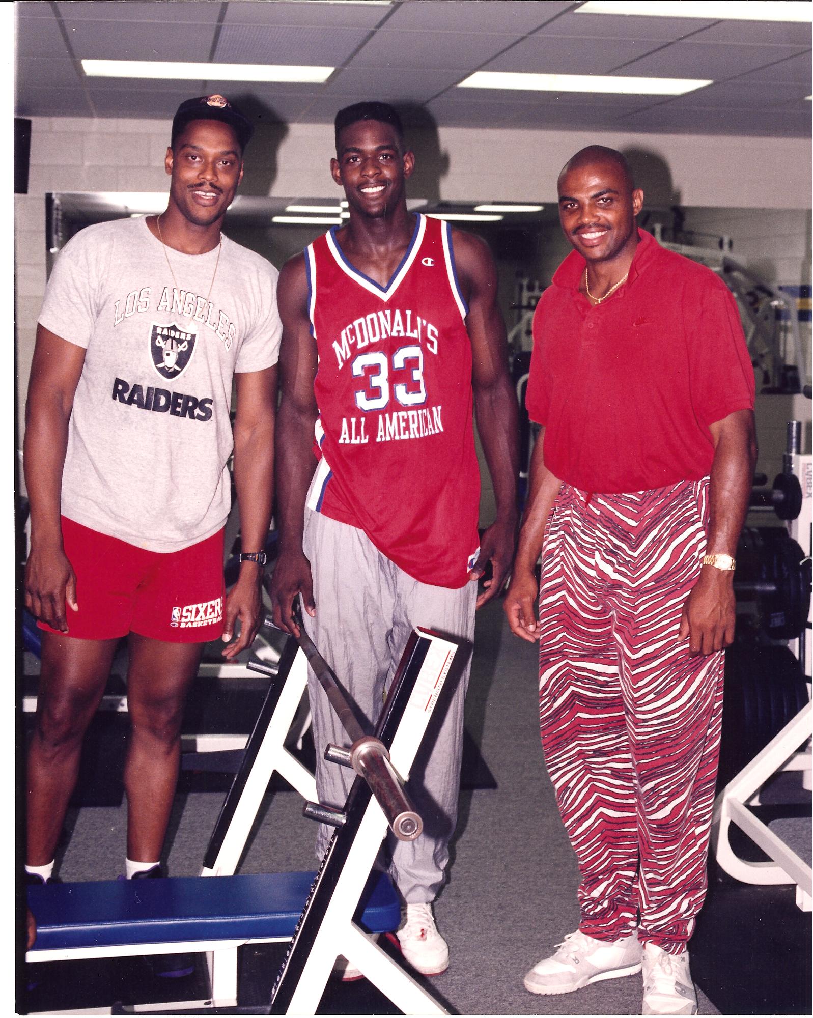 Chris poses with two NBA alums of the many he considered heroes, Rick Mayhorn (L) and Charles Barkley (R) during his senior year of high school.