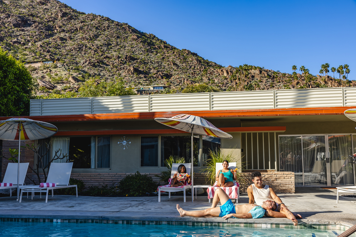 The Desert Riviera, built in 1950, pairs original Burns architecture with endless contemporary upgrades, including some of Palm Springs’ lushest garden landscaping: An abundance of flowering tropical plants attract jewel-toned hummingbirds to join guests at poolside.