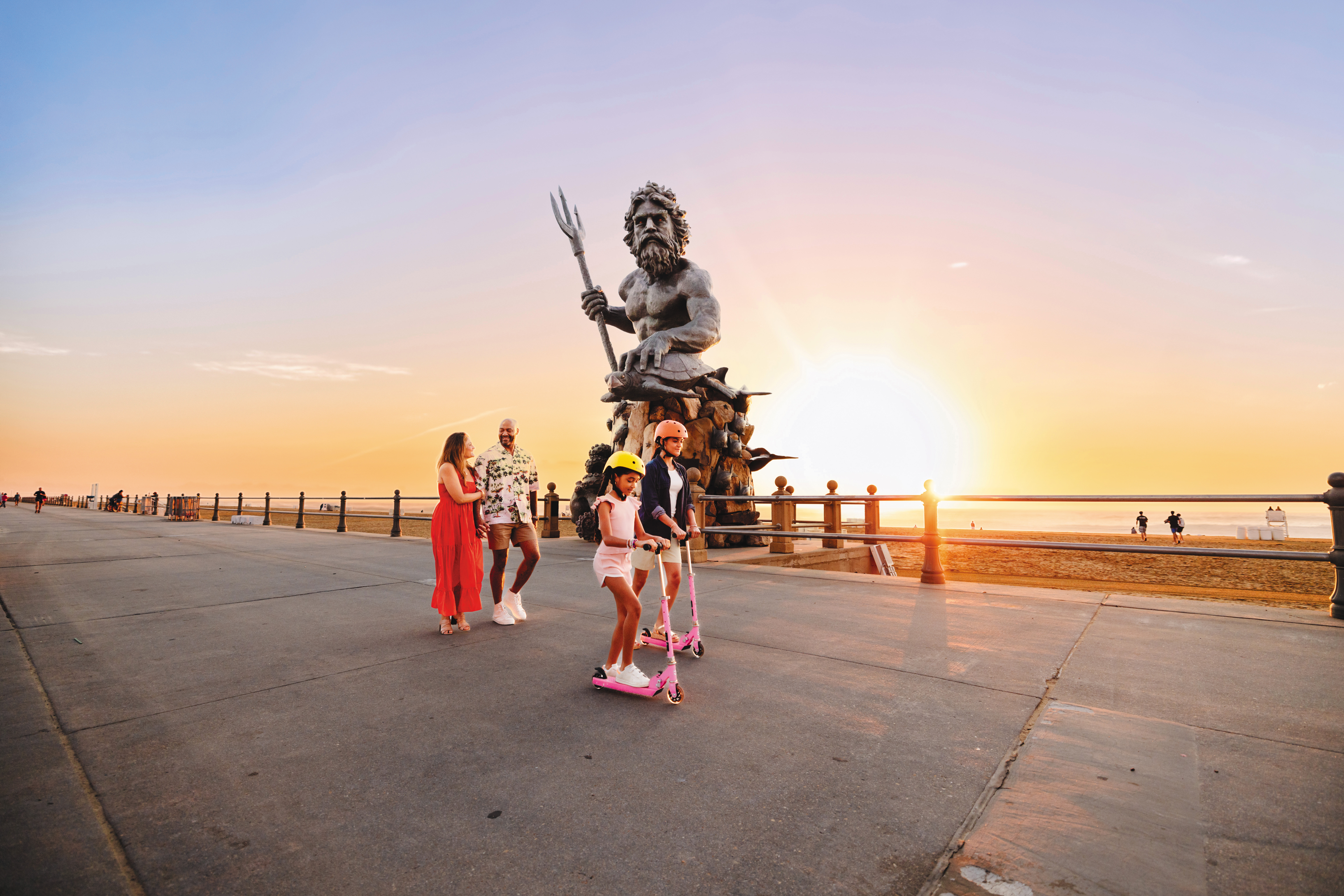 Three oceanfront miles of pure people-watching, sunrise glory, and salt-sweet breeze—crowned by the 24-foot King Neptune at 31st Street. Snap the pic, roll the dedicated bike lane, duck into a scoop shop, and catch free Oceanfront sets in season. Playgrounds, patios, street performers—it’s beach-town energy at full volume. Tip: cruise at daybreak for cotton-candy skies, then circle back after dark when marquee lights and surf turn the walk into a little movie.