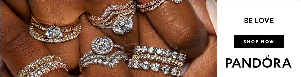 Timeless Pave Triple-row Ring, £115, Row of Hearts Eternity Ring, £80, Sparkling Overlapping Band Ring, £80, Crossover Pave Triple Band Ring £90, Sparkling Round & Square Drop Earrings, £70, all by Pandora; Rose-Applique Round Neck Cady Mini Dress in Pink, £1330.60 and Heart-Embellished Opera-Length Gloves in Pink, £383.70, both by NDS.