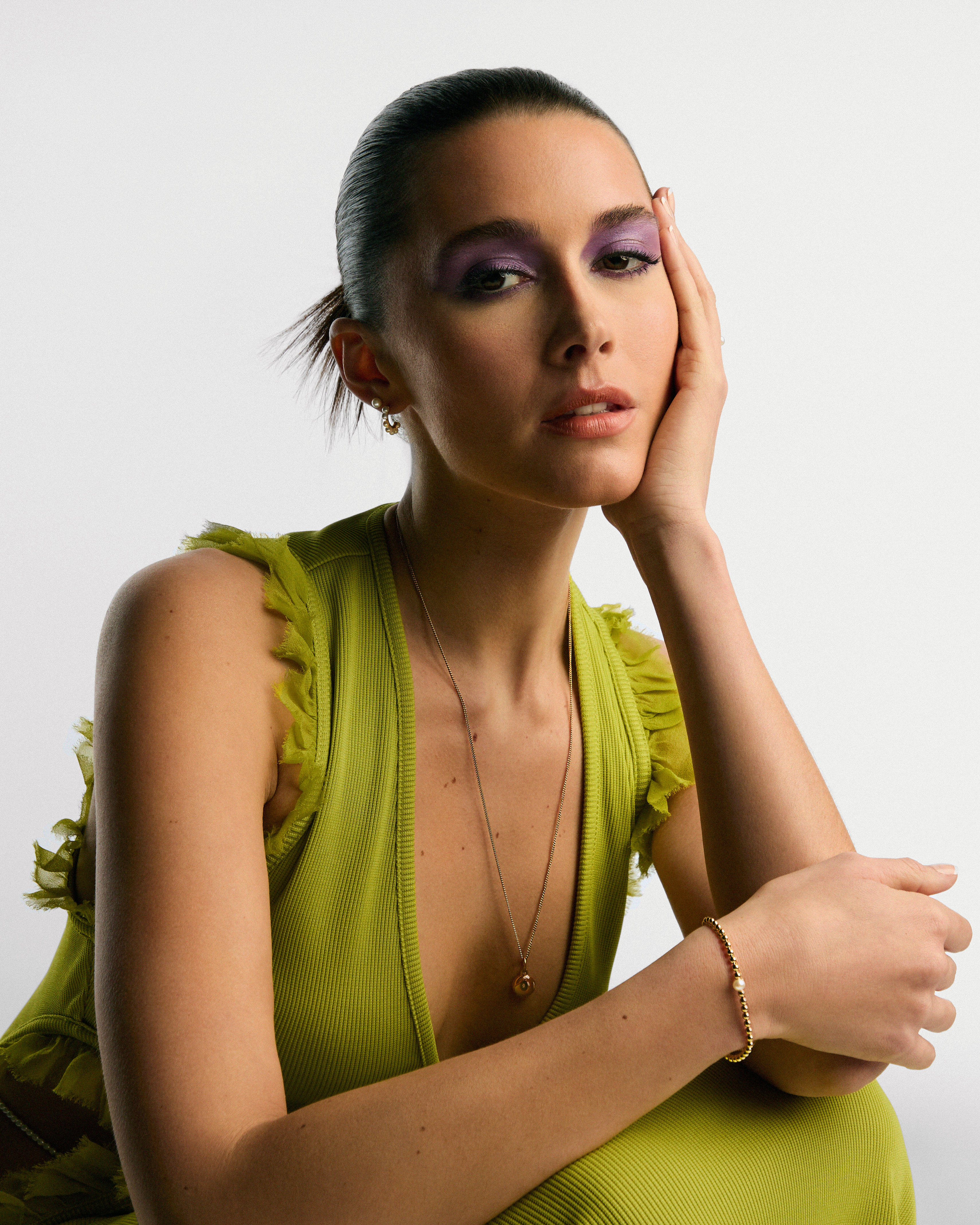 Sparkling Huggie Hoop Earrings, £45, Crossover Pave Hoop Earrings, £70, Moments Studded Chain Necklace, £115, ME Double Link Chain Necklace, £80, Radiant Heart Pave Signet Ring, £60, Sparkling Intertwined Wave Ring, £55, Crossover Pave Triple Band Ring, £90, Row of Hearts Eternity Ring, £80, Rectangular Bars Sparkling Pave Ring, £80, Sparkling Row Eternity Ring, £80, Timeless Pave Triple-Row Ring, £115, Sparkling Bang Ring, £35, Signature I-D Open Bangle, £70, all by Pandora; Long dress in Neon Green, £3,088 by Azzi & Osta.