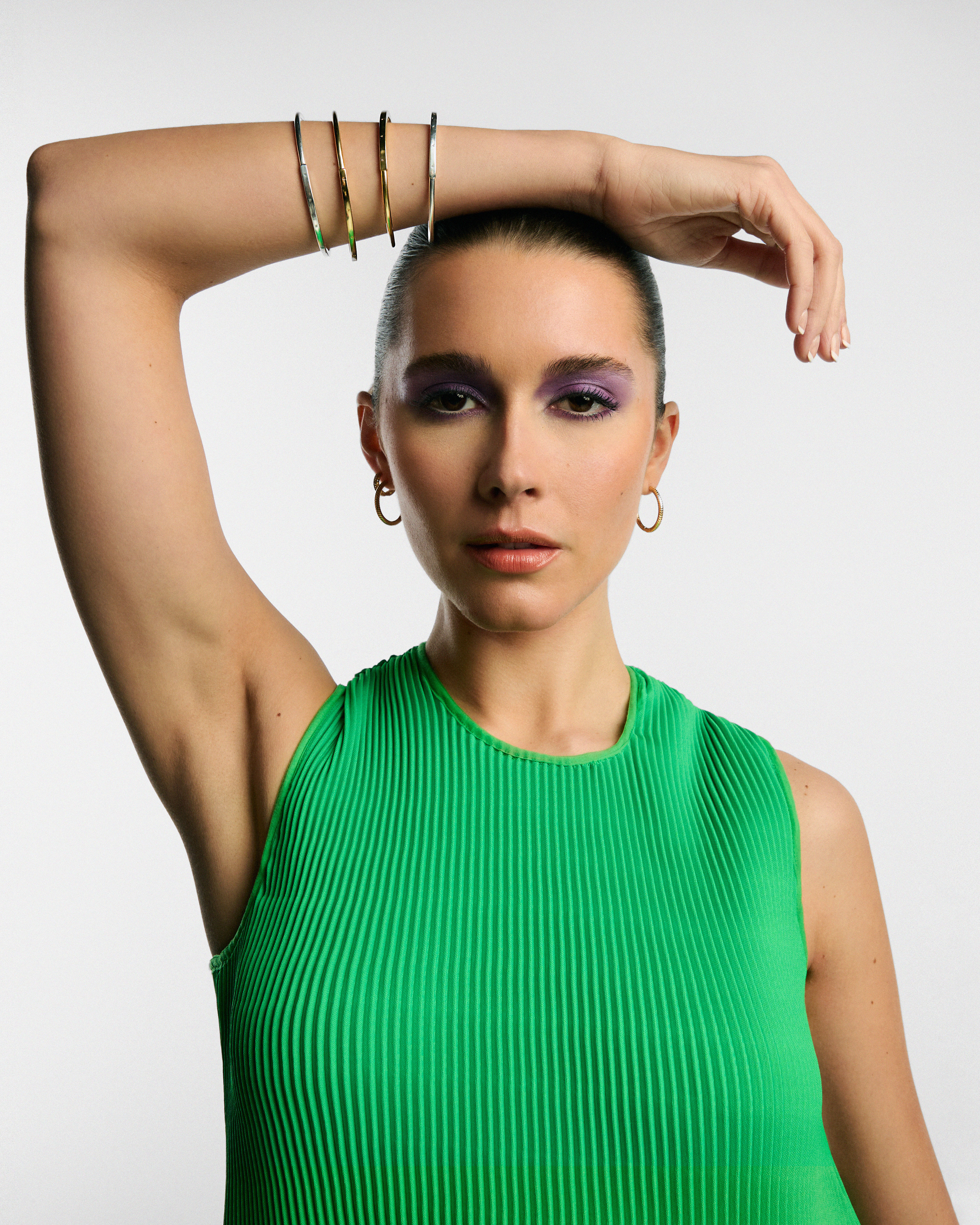 Signature I-D open Bangles, £70, Signature I-D open Bangles in gold, £125, Moments Charm Hoop Earrings, £60, all Pandora; Ripple Wavy Hem Tank, £625, Ripple Wavy Hem Skirt, £710, both Melitta Baumeister at Koibird.
