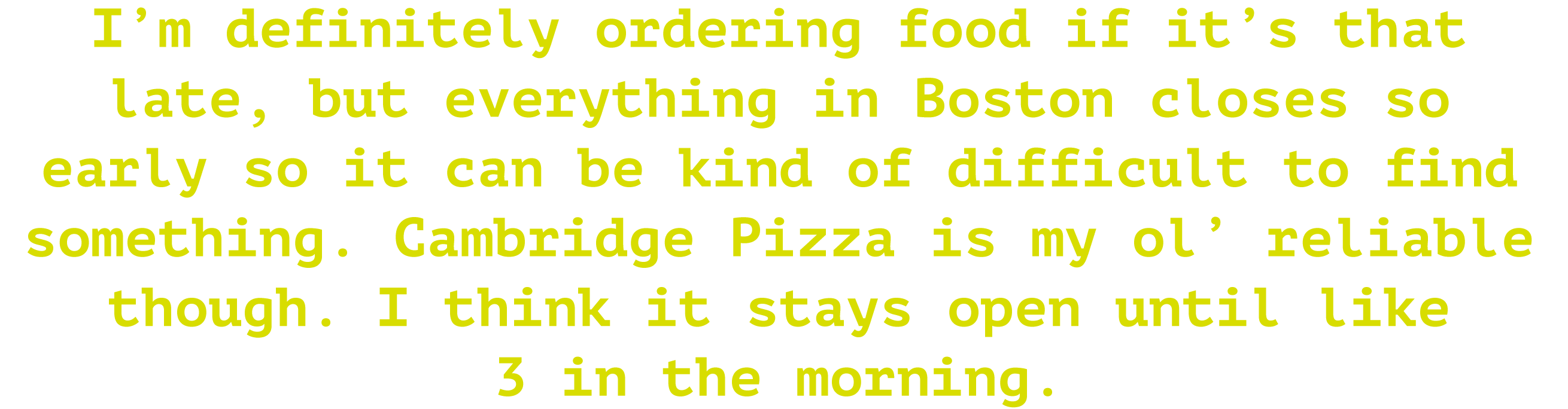 I’m definitely orderingfood if it’s that late,but everything in Boston closes so early so it canbe kind of difficult to find something. Cambridge Pizza is my ol’ reliable though.I think it stays open until like 3 in the morning.