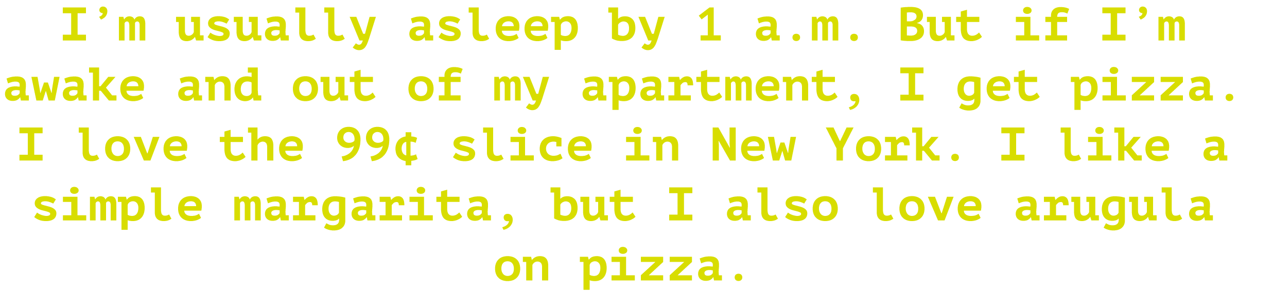 I’m usually asleep by 1 a.m. But if I’m awake and out ofmy apartment, I get pizza.I love the 99¢ slice inNew York. I like a simple margarita, but I alsolove arugula on pizza.