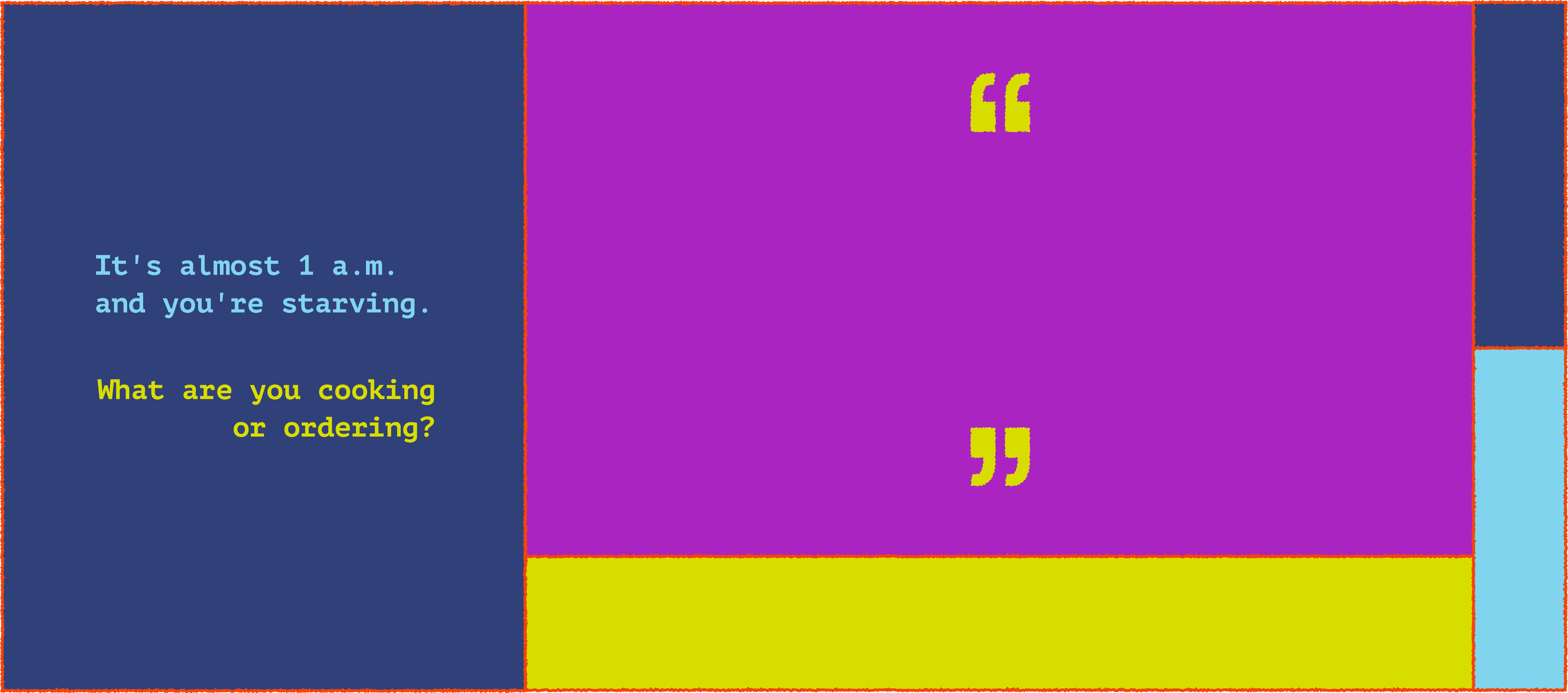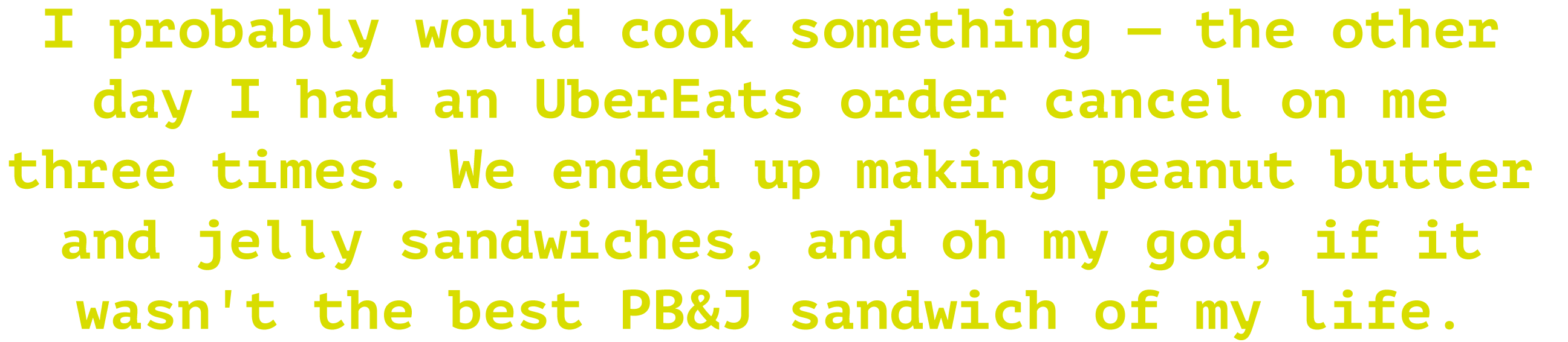 I probably would cook something — the other day I had an UberEats order cancel on me three times. We ended up making peanut butter and jelly sandwiches, and oh my god, if it wasn't the best PB&J sandwich of my life.