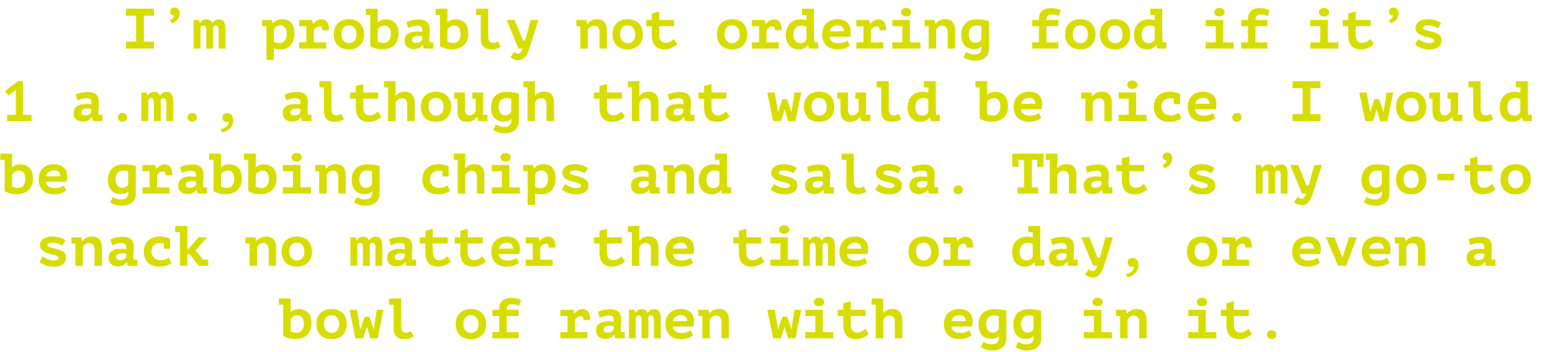 I’m probably not orderingfood if it’s 1 a.m., although that would be nice. I wouldbe grabbing chips and salsa. That’s my go-to snack no matter the time or day,or even a bowl of ramen