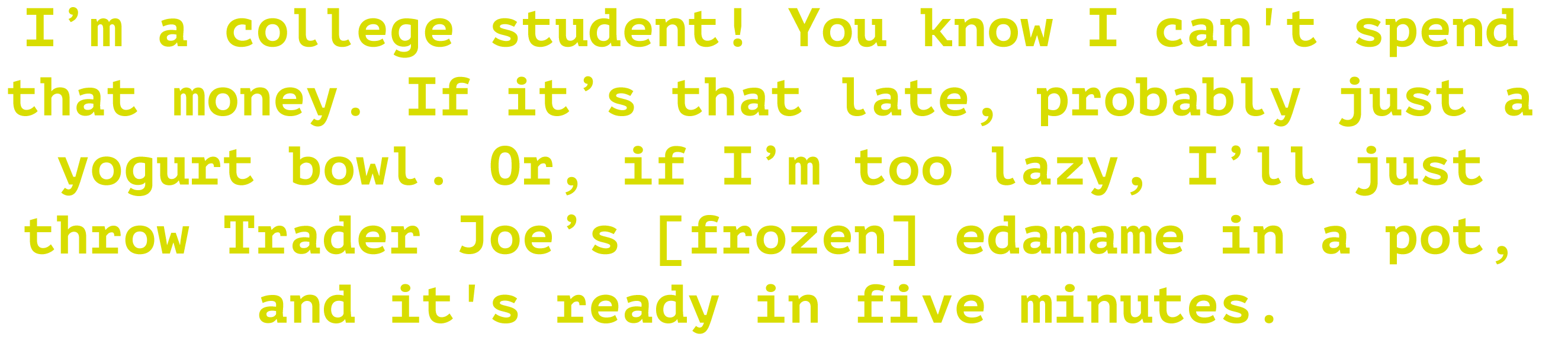 I’m a college student,you know, I can't spendthat money! If it’s that late, probably just a yogurt bowl. Or, if I’m too lazy, I’ll just throw Trader Joe’s [frozen] edamame in a pot, and it's ready in five minutes.