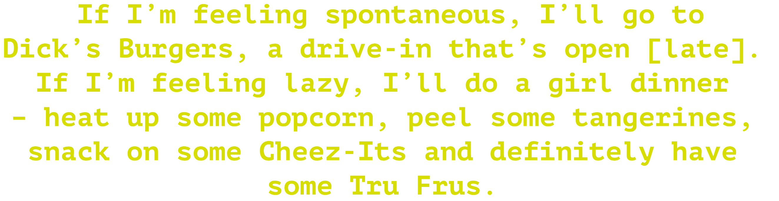 If I’m feeling spontaneous, I’ll go to Dick’s Burgers, a drive-in that’s open [late]. If I’m feeling lazy, I’lldo a girl dinner – heat up some popcorn, peel some tangerines, snack on some Cheez-Its and definitely have some Tru Frus.