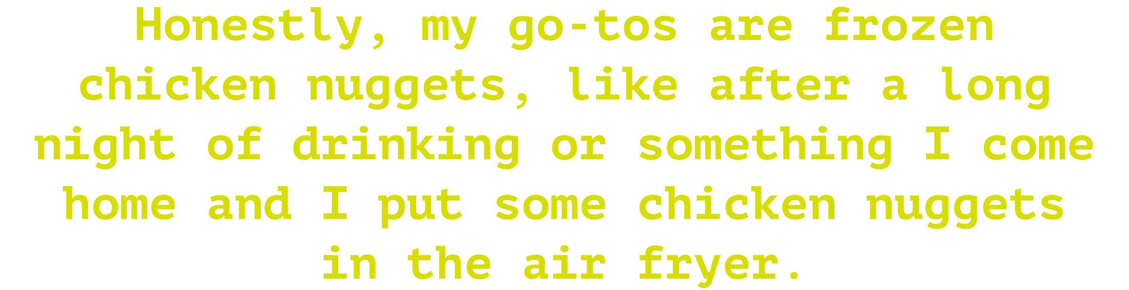 Honestly, my go-tosare frozen chicken nuggets, like after a long night of drinking or something I come home and I put some chicken nuggets in the air fryer.