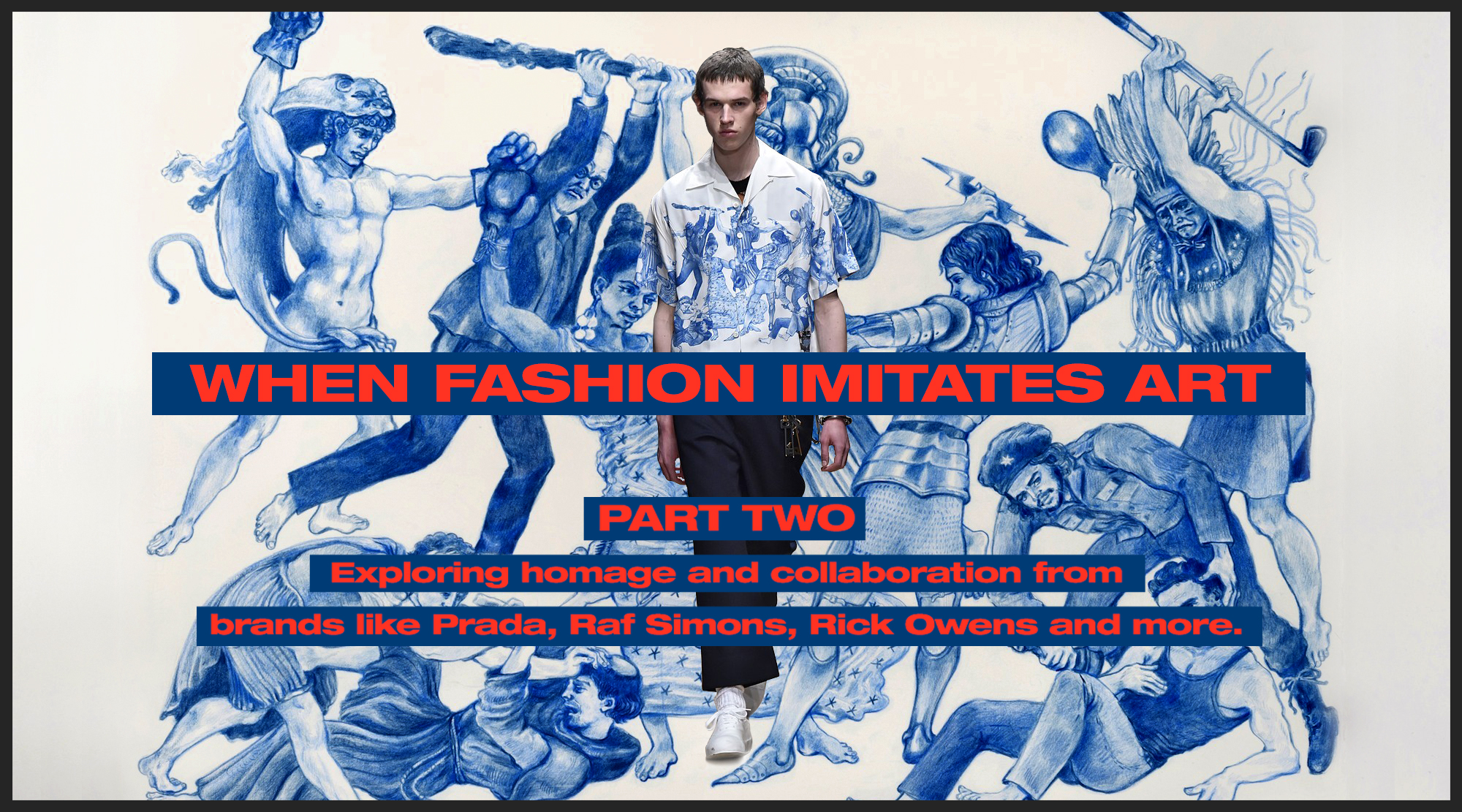 In the first segment of this article, we looked at brands like Maison Margiela, Louis Vuitton and Hood by Air to explore the uncanny similarities and references between art and fashion. Ahead, we take another look at the symbiotic relationship the two have managed to form through an interchange of aesthetic, symbolism, attitude and imagery. Among those are Prada's collaboration with Christophe Chemin, Raf Simons' work with the Robert Mapplethorpe Foundation, Rick Owens' homage to sculptor, Allen Jones and more.