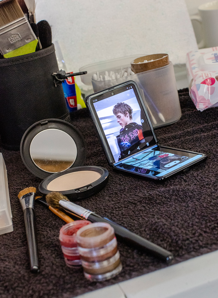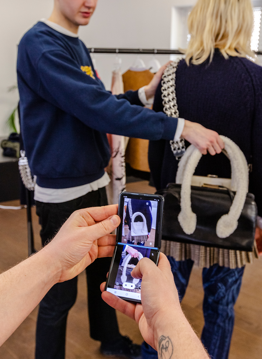 While sourcing and reconstruction are at the heart of every design, visually capturing a collection's quintessence is equally important. Visiting Cooke and Burt on set at their studio, they gave HYPEBEAST a behind-the-scenes look at what goes into shooting the images for a collection, from fittings and styling to hair and makeup and creative direction. With the help of the versatile Galaxy Z Flip, Cooke brings the production together using features like the device's dual screen capabilities and video calls. Cooke and Burt sat down to share where they find inspiration, the role technology plays in their process and how they work together.