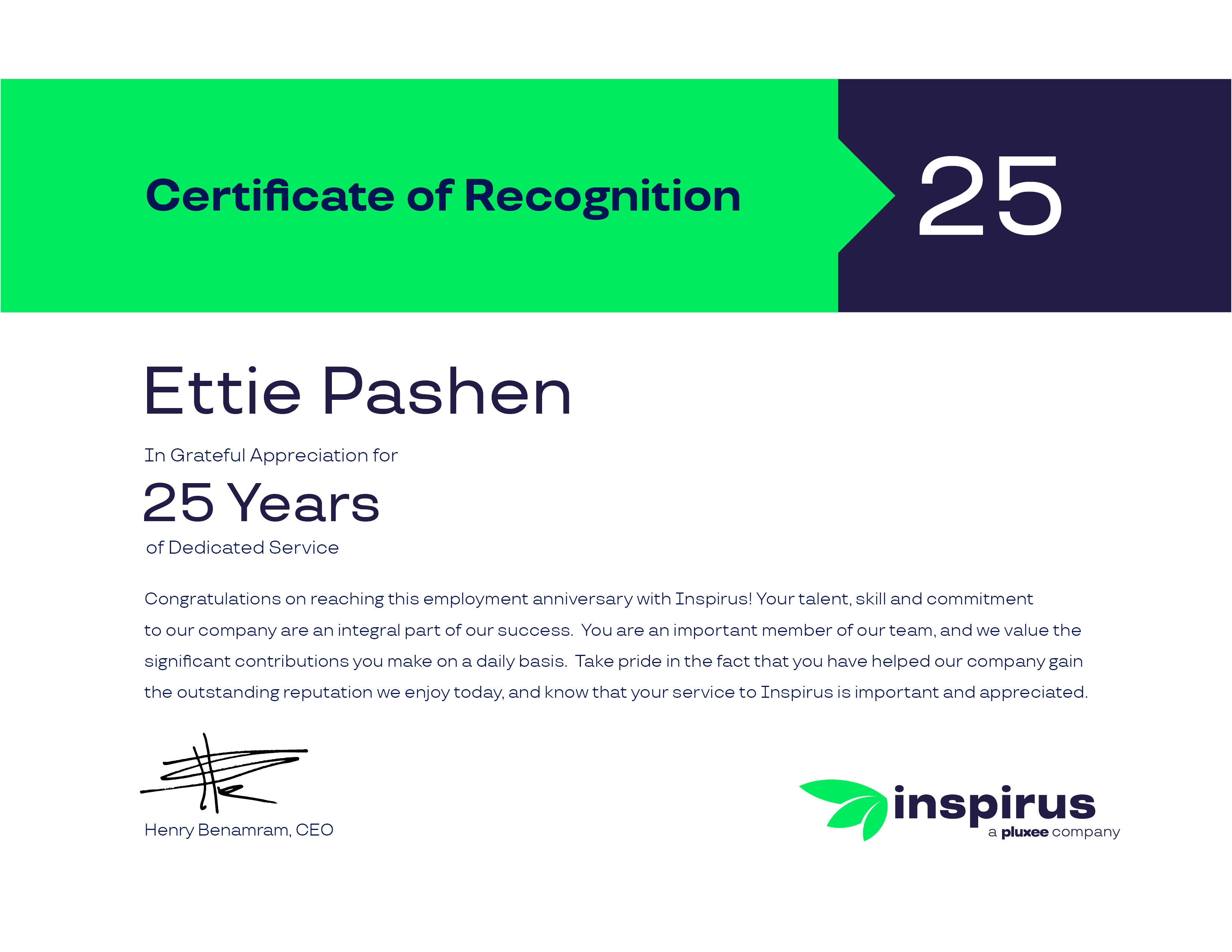 On March 21, 2024, Ettie Pashen will be celebrating their 25th service anniversary at Inspirus. This is a wonderful opportunity to appropriately recognize Ettie for their hard work over the past years.