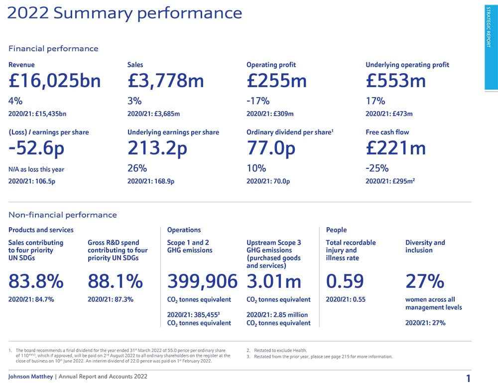 We took important and necessary strategic decisions with regard to the business portfolio, with the exit from Battery Materials and divestment of Health. I know many of our stakeholders were very disappointed, but these were essential actions to enable us to focus on attractive, high-growth opportunities that have a vital role to play in the acceleration towards net zero. I, the rest of the board and the executive team are determined that we will restore value to our shareholders.”
