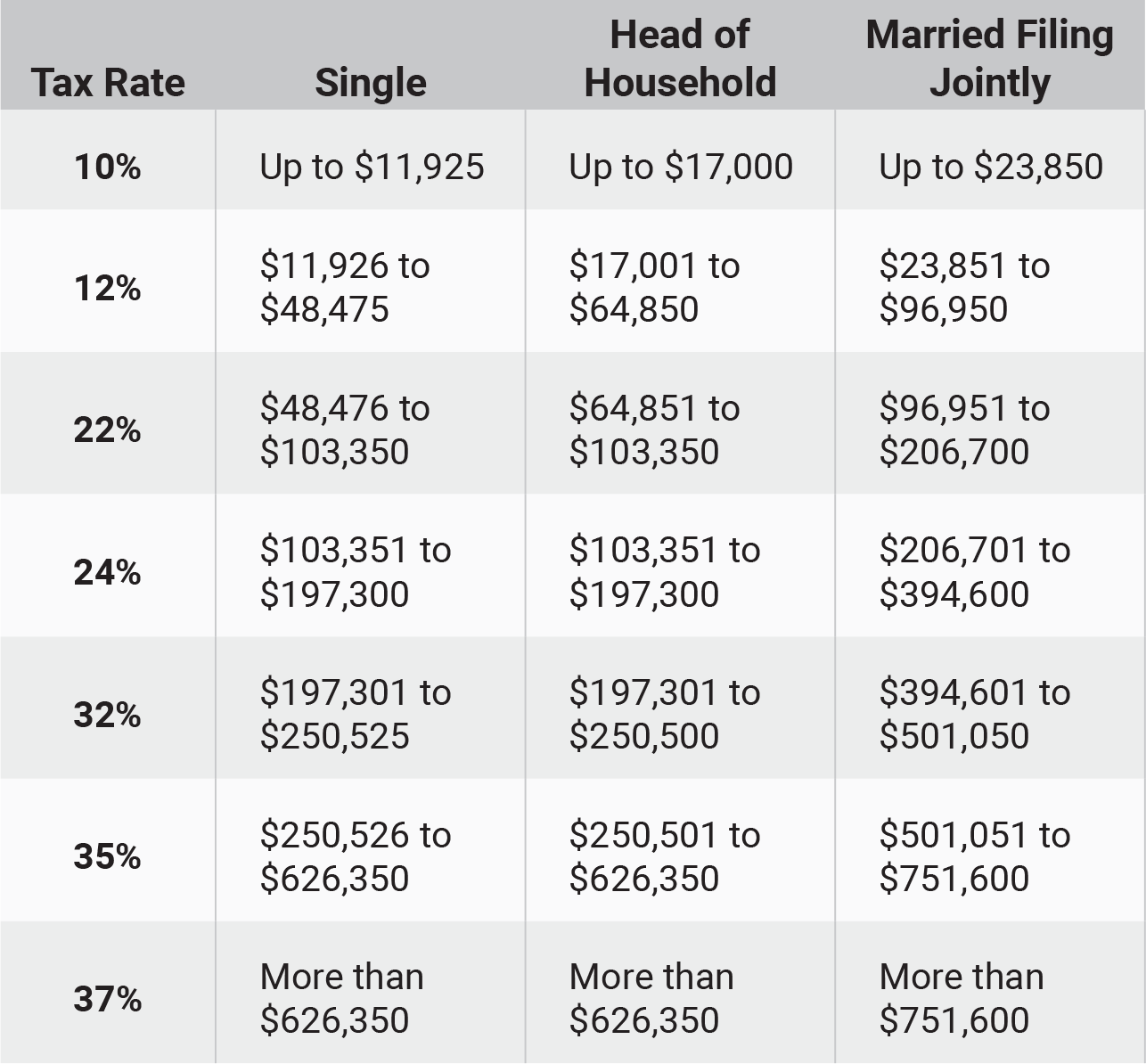 Here are the federal marginal tax rates for the 2025 tax year (for taxes filed in early 2026).