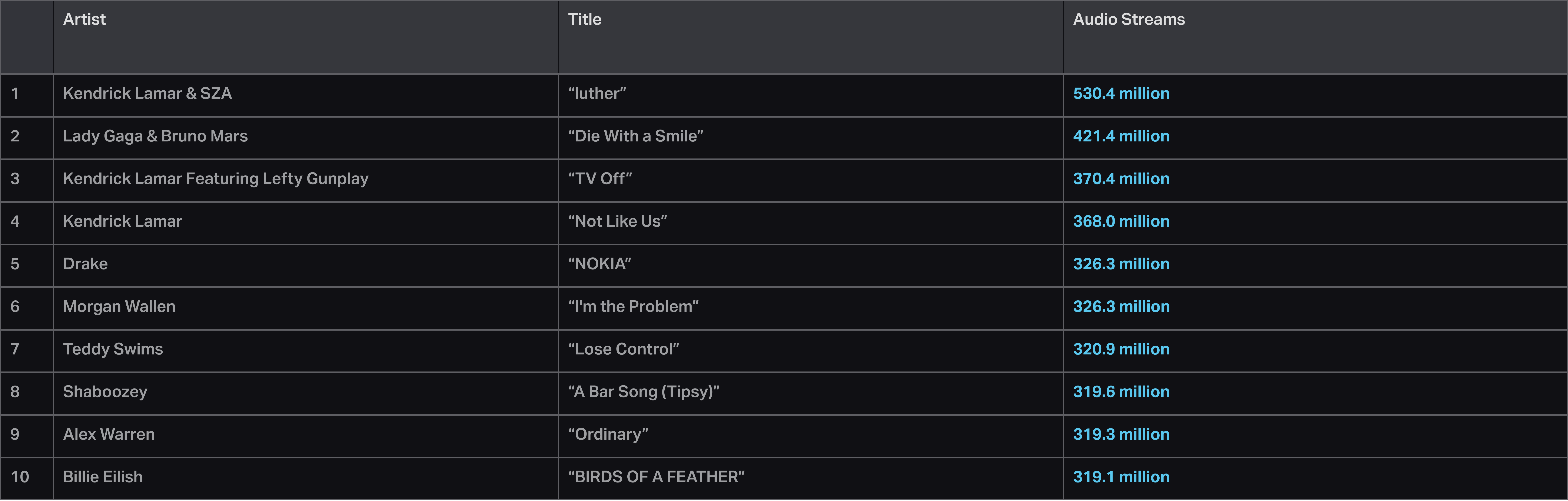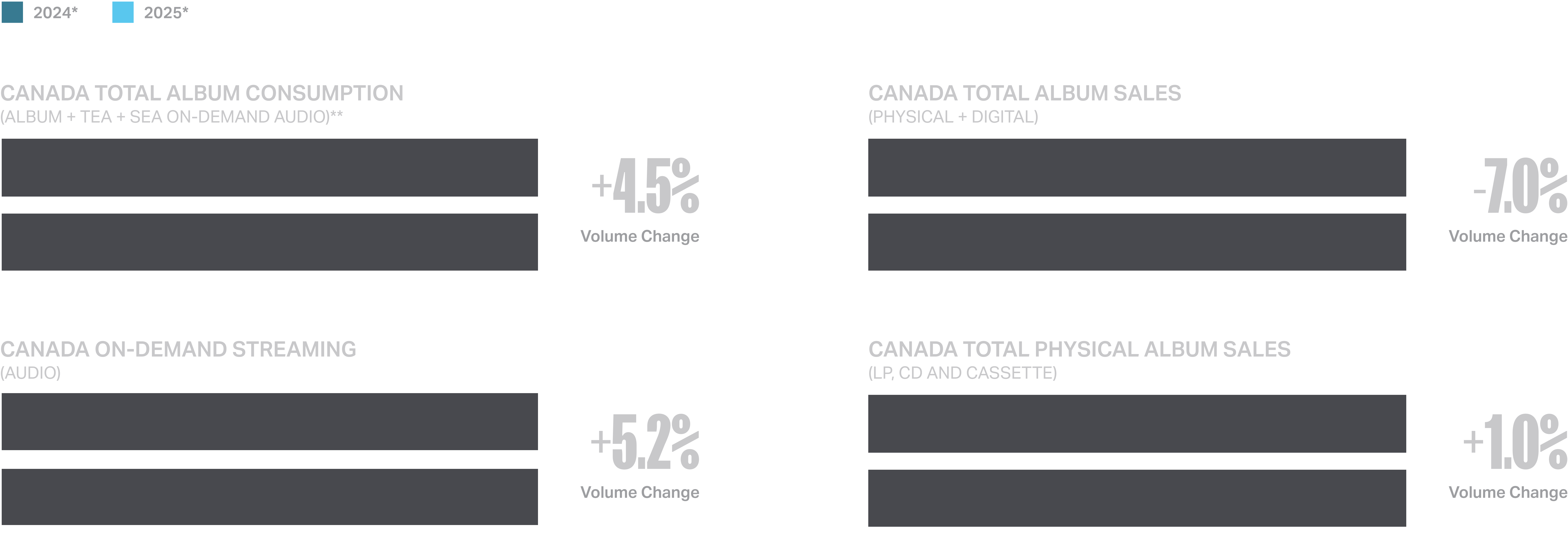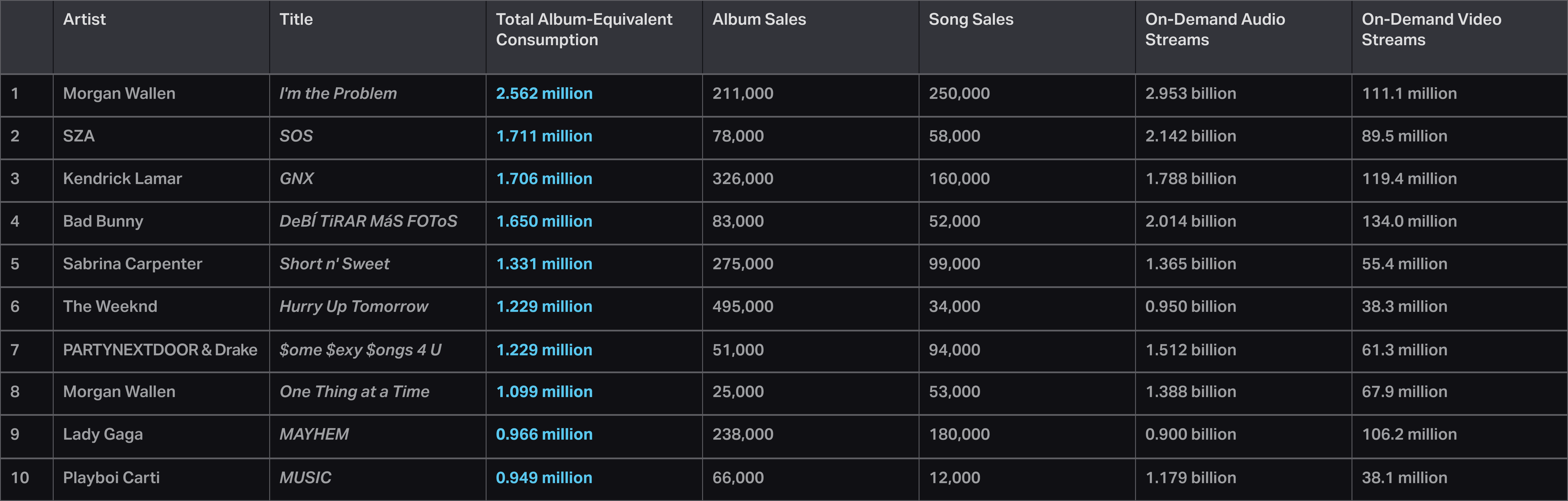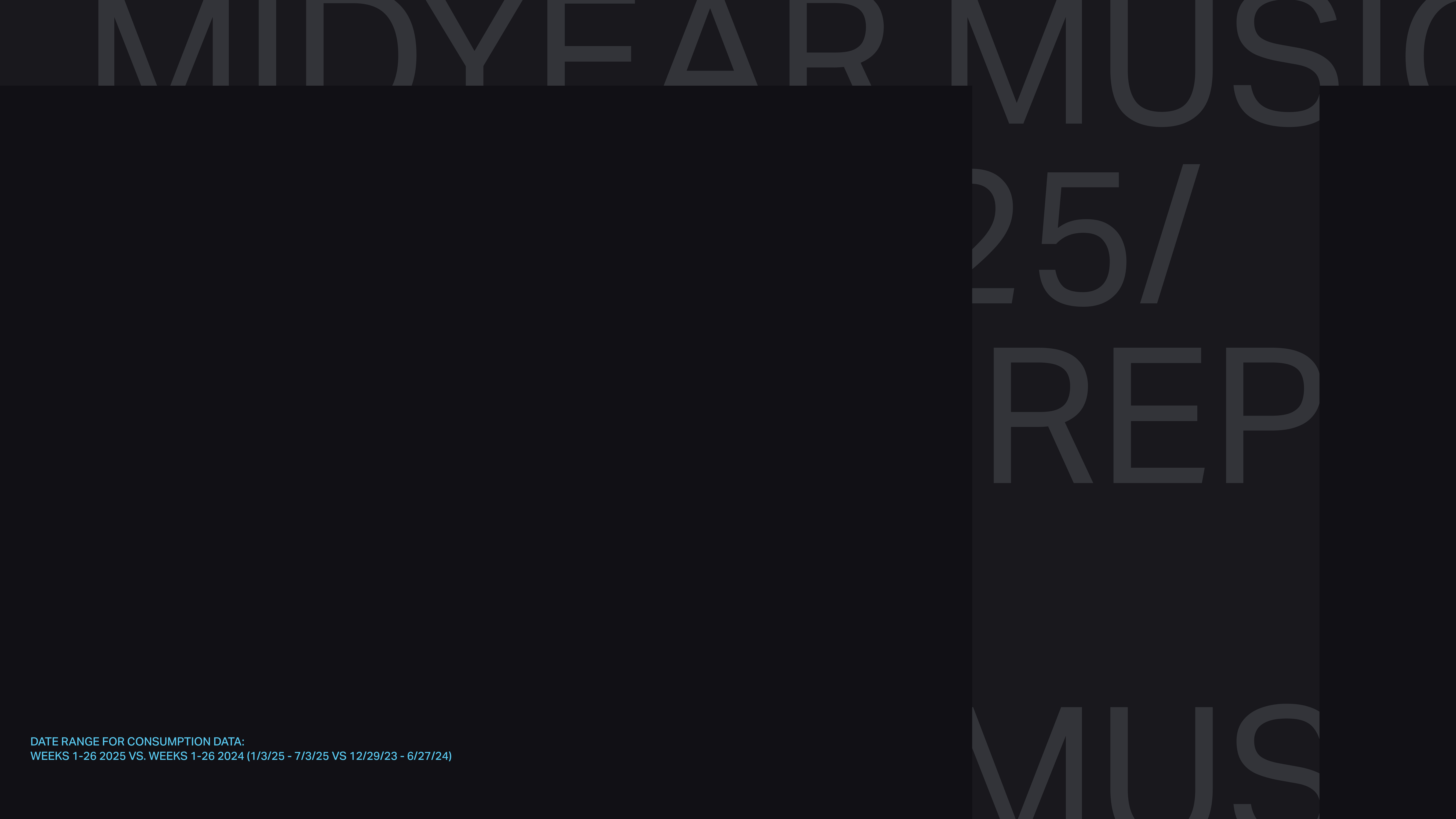 *1/3/25 - 7/3/25 (As compared to 12/29/23 - 6/27/24)** SEA (STREAM-EQUIVALENT ALBUMS): 1250 PREMIUM STREAMS = ONE ALBUM // 3750 AD-SUPPORTED STREAMS = ONE ALBUM; TEA (TRACK-EQUIVALENT ALBUMS): 10 DIGITAL TRACKS = ONE ALBUM SOURCE: LUMINATE CONSUMPTION DATA