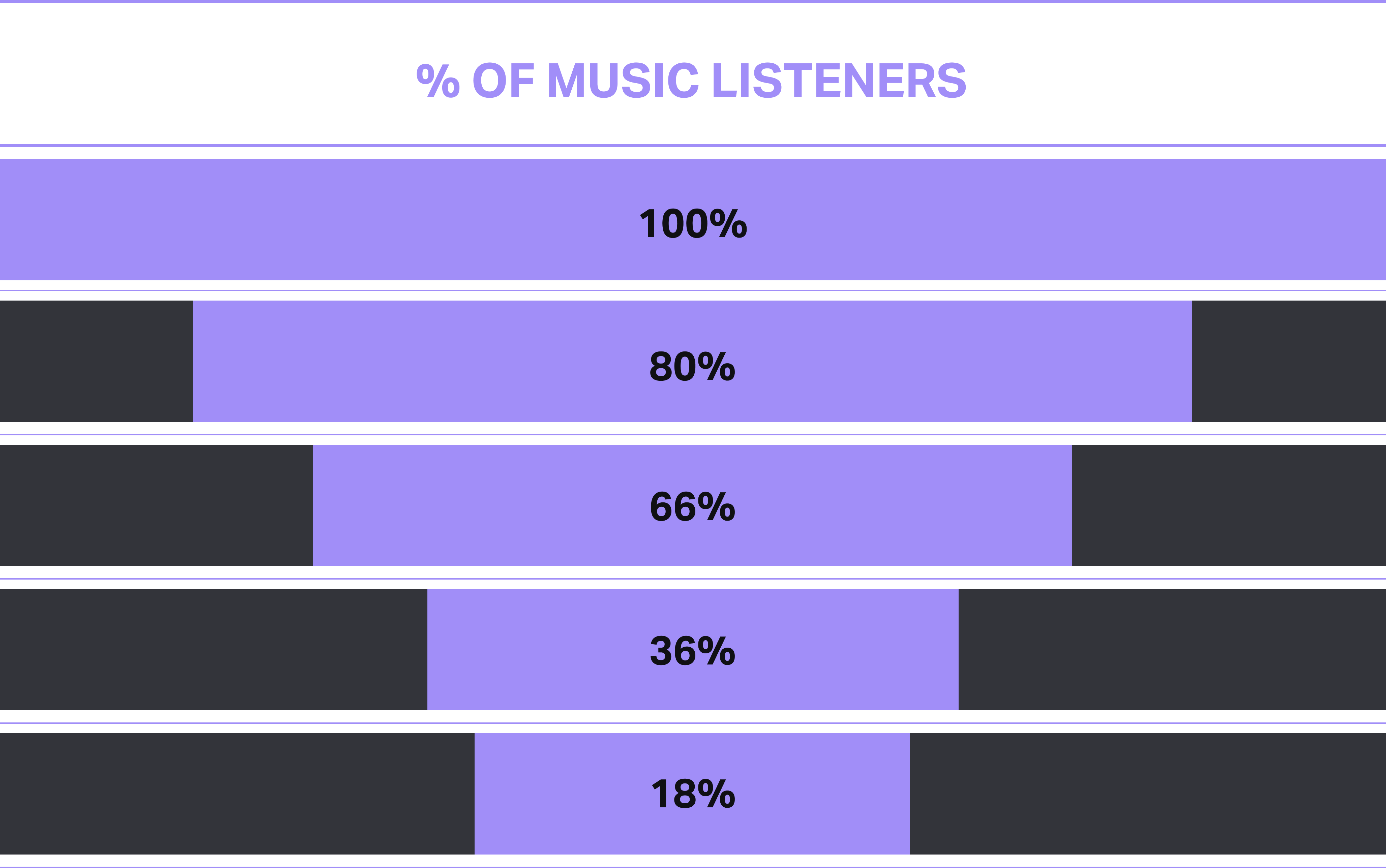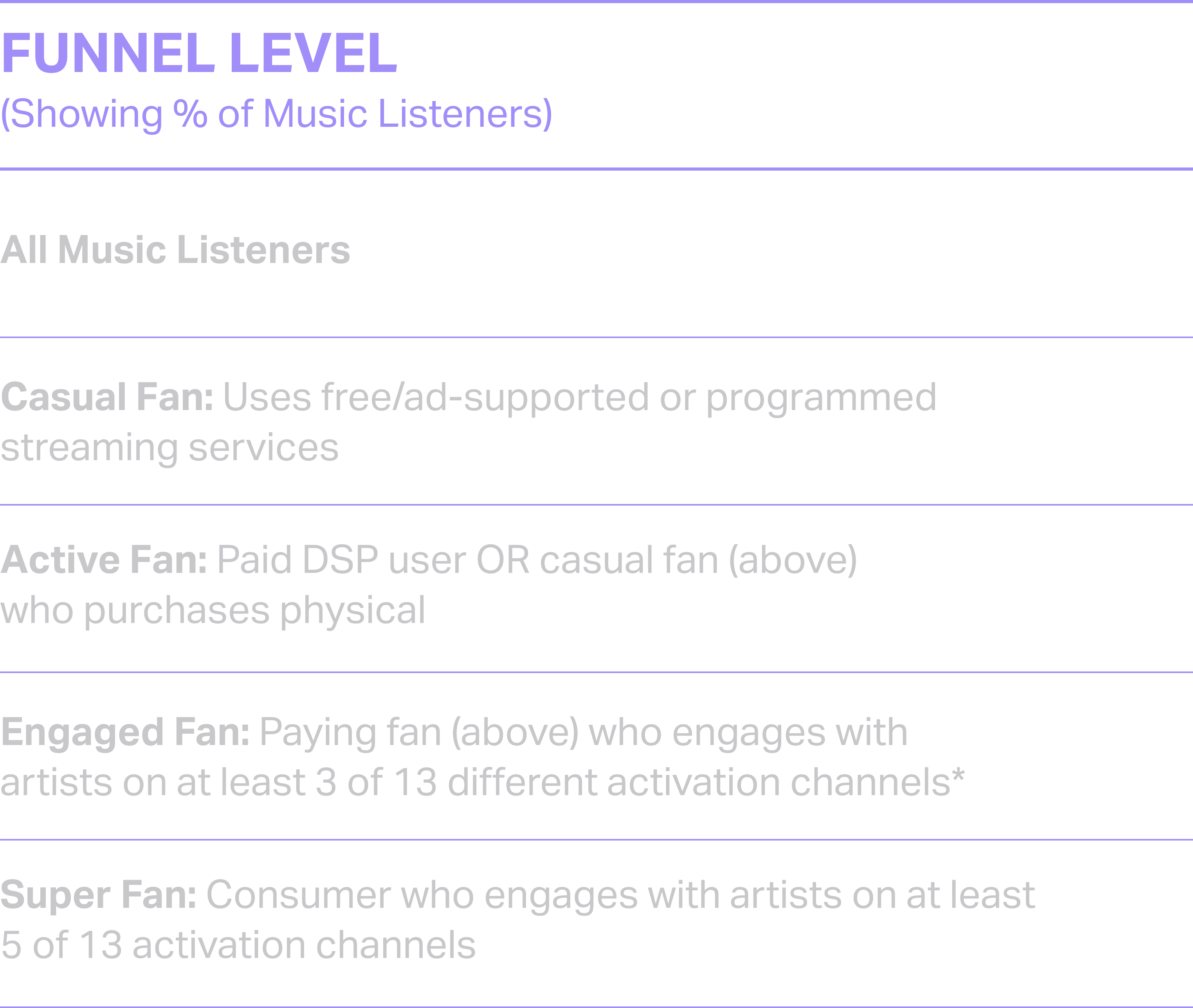 In Luminate’s most recent audience response data, 18% of U.S. music listeners are considered super fans, meaning they engage with artists and music in 5 or more ways. However, there are different levels of fandom, and understanding where specific fan groups fit into the Fan Engagement Funnel helps marketers tailor activations and devise strategies to move fans closer to super fan status.
