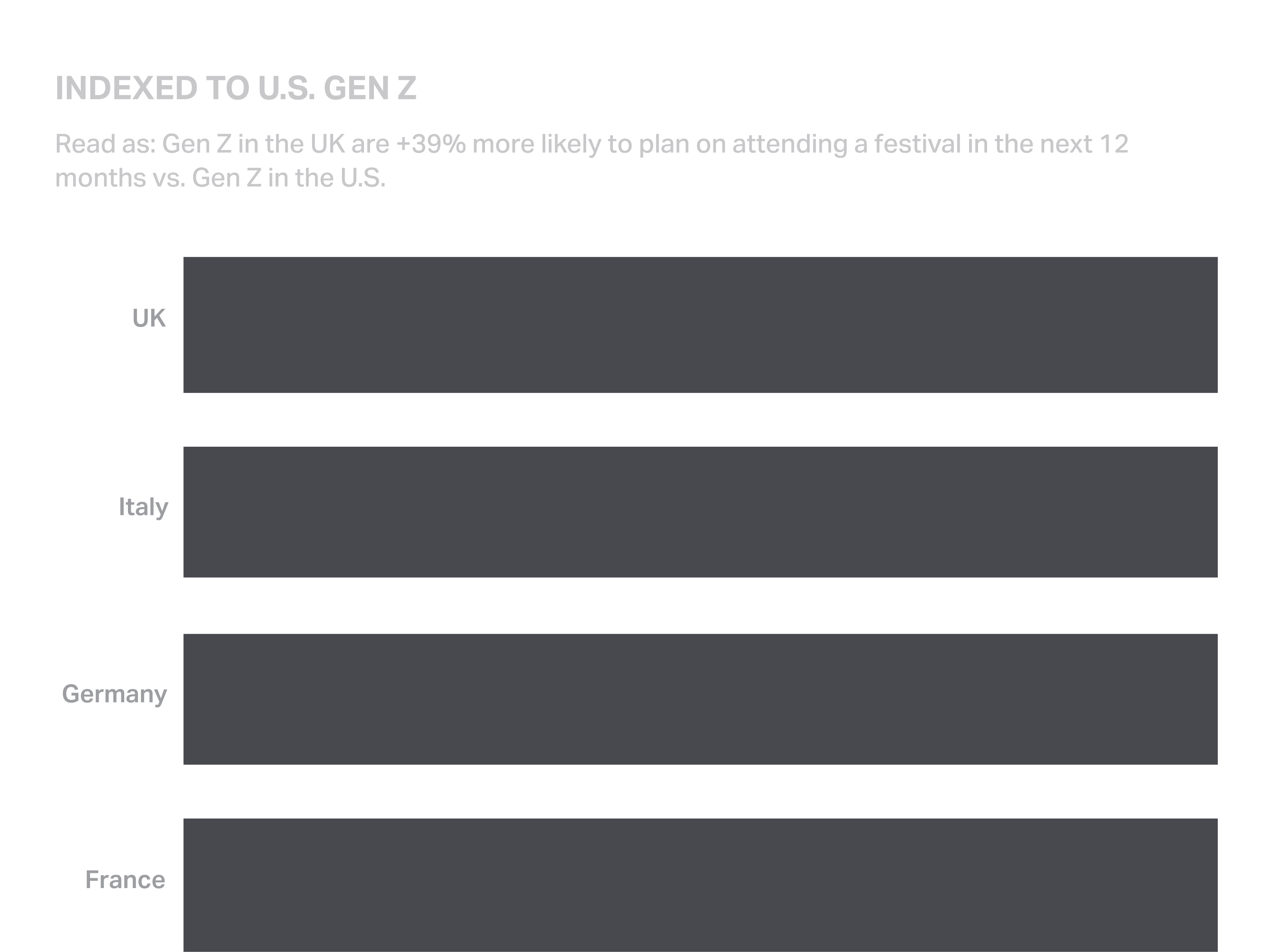 Gen Z in the UK, Italy, Germany and France are more likely to attend festivals than the average consumer in their own country, with UK Gen Z in particular more interested than their fellow citizens. Additionally, compared with their U.S. counterparts, these fans are more likely to plan on attending a festival in the next 12 months, indicating the continued strength of the European festival market.