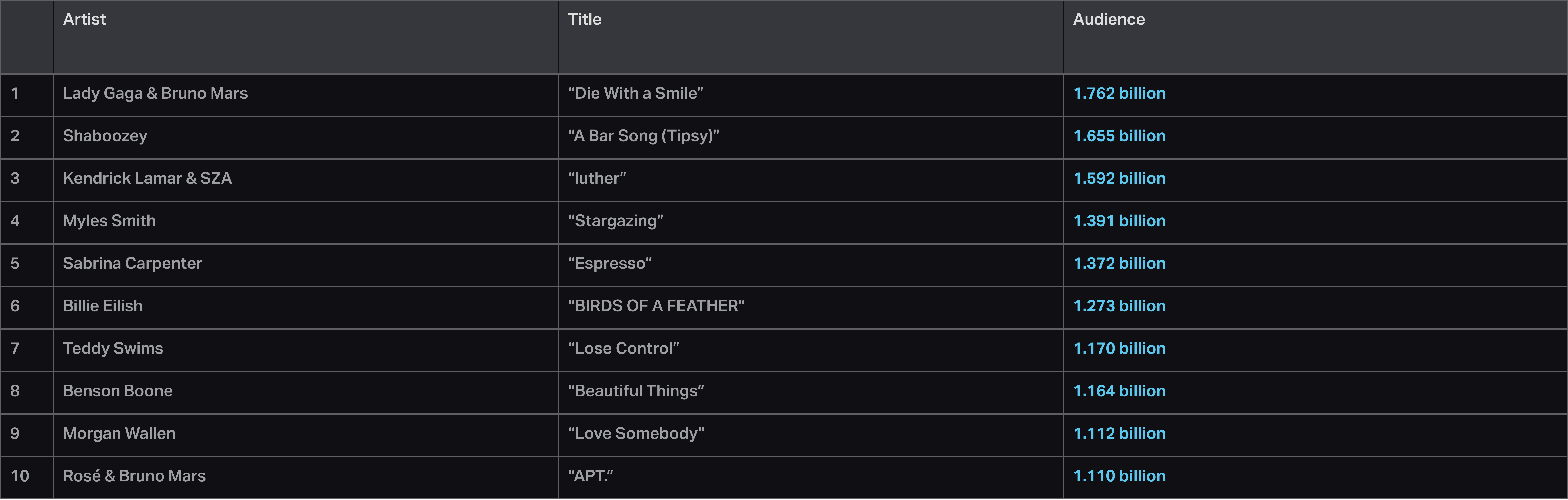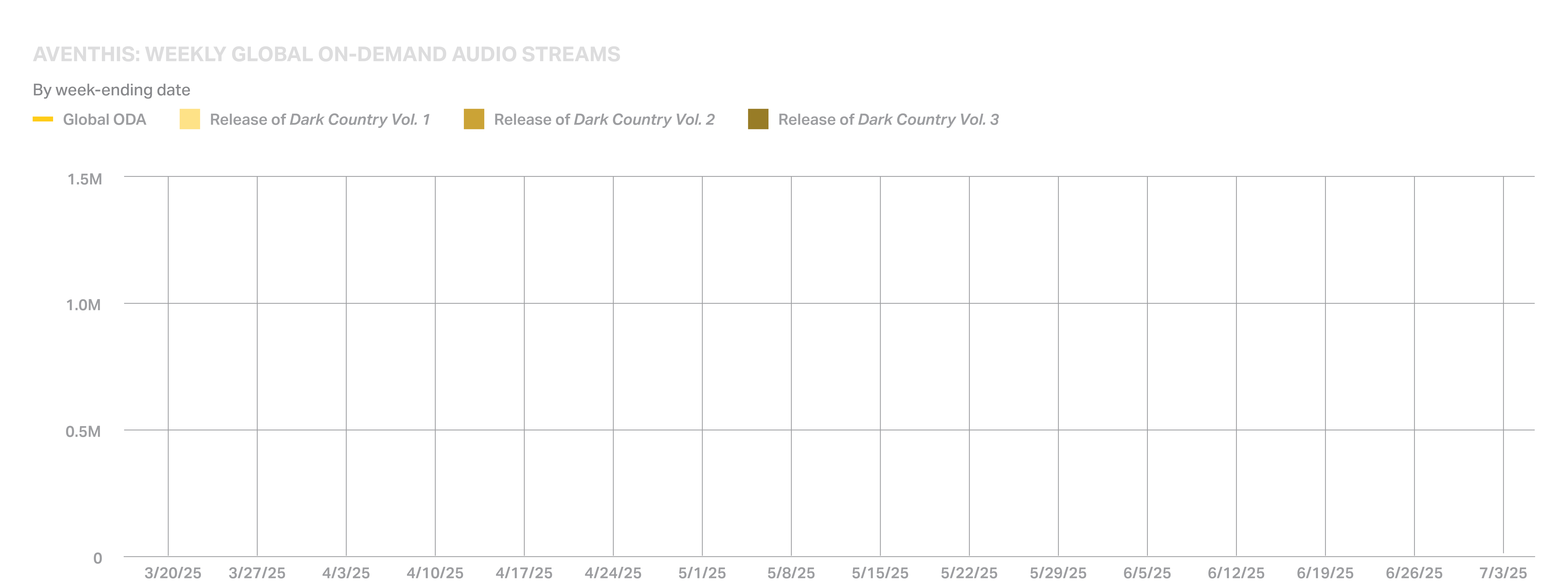 News headlines regarding the use of AI by some artists have circulated broadly in recent weeks. Aventhis has disclosed the use of AI in public creator descriptions while driving over 5M Global On-Demand Audio streams since April 18, 2025. As such, Aventhis’ YouTube channel describes his work as “a dark country project rising in the scene with gritty melodies, outlaw storytelling and a dark, cinematic tone ... Harnessing the creative power of AI as part of his artistic process, Aventhis brings a bold new edge to the genre ...” Learn more about the music industry's most important trends and current challenges in an upcoming Luminate special report; check out the back of this report for more details.