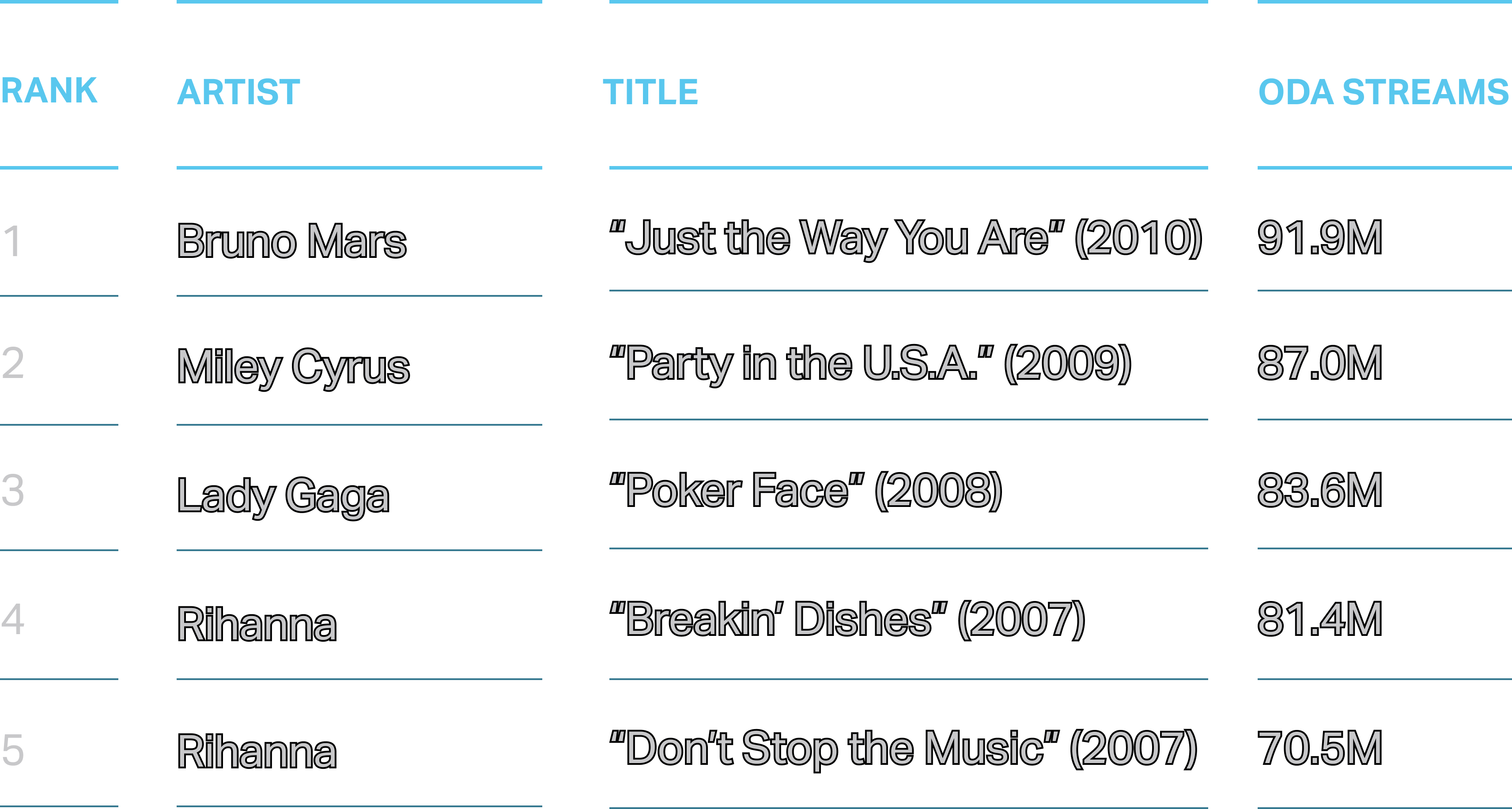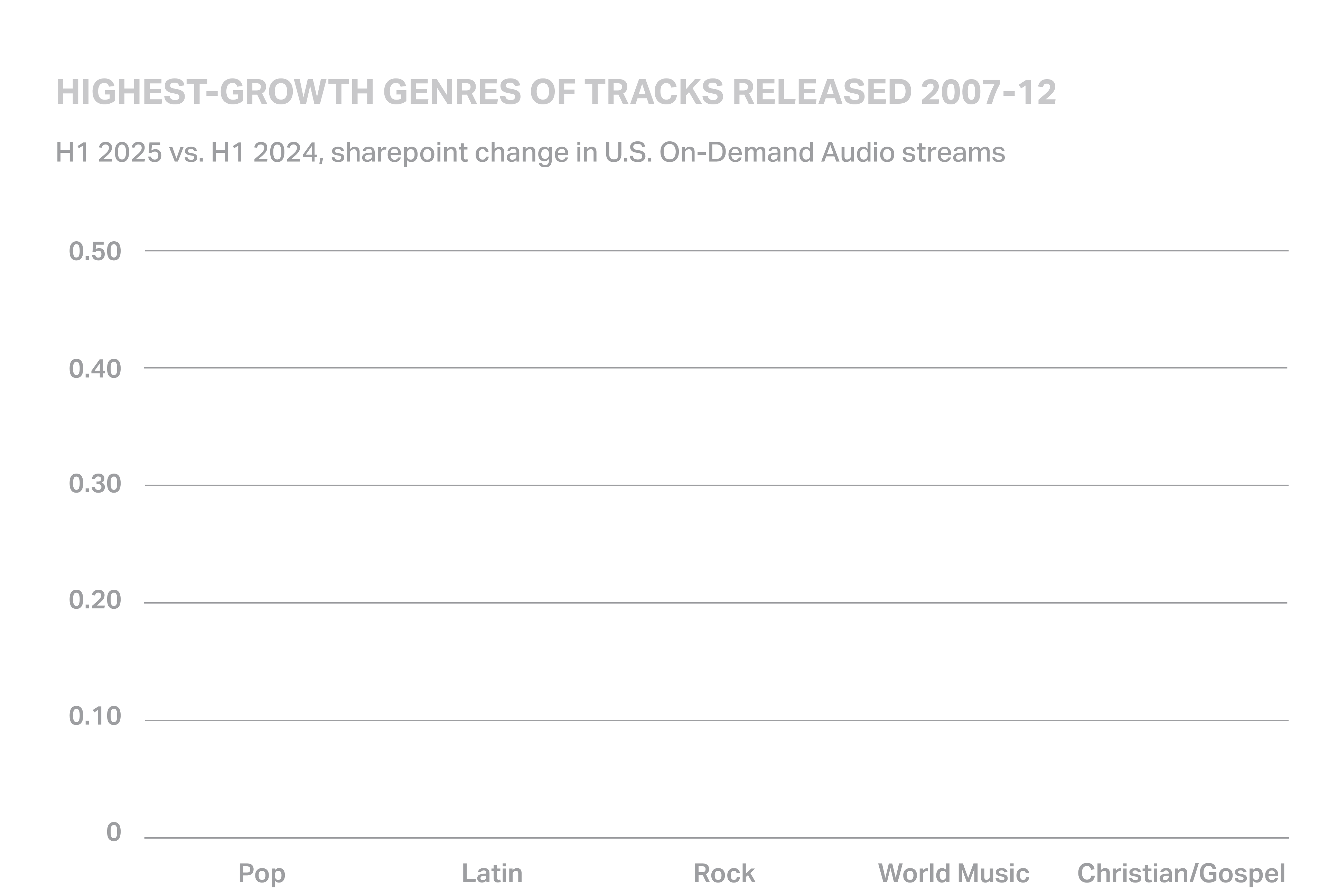 When analyzing the growth of U.S. tracks released in the Great Recession of 2007-12, Pop songs from those years grew 6.4% in On-Demand Audio volume in 2025, outpacing the U.S. industry’s rate of 4.6%. The corresponding Pop share point increase of all tracks released 2007-12 is also more than 2x that of the next closest genre, showing 2025 audiences are gravitating to the Pop genre from this period.