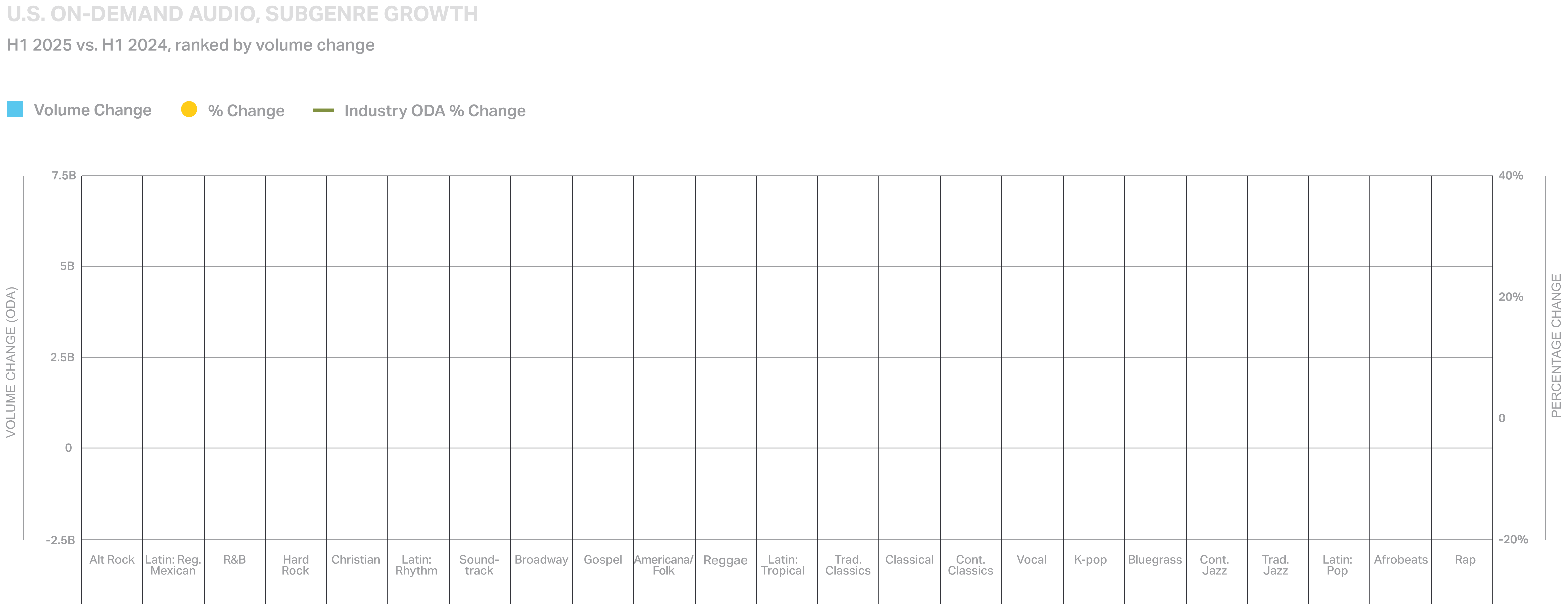 Alt Rock leads all subgenres in volume change, while Regional Mexican, R&B, Hard Rock and Christian round out the top 5 in growth.