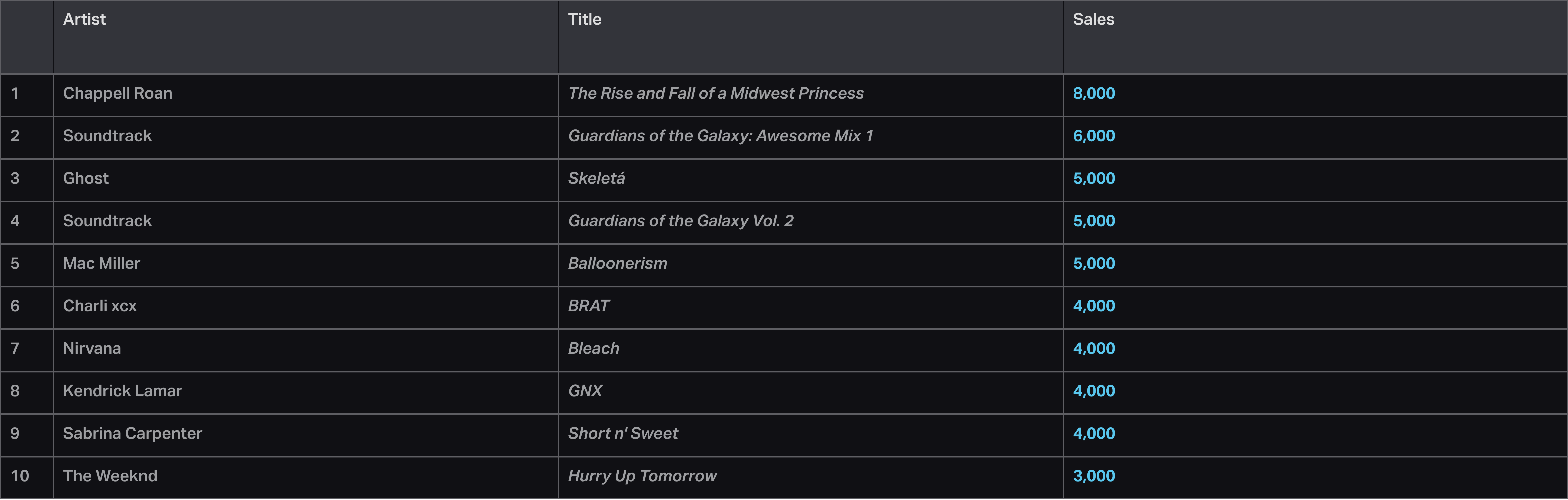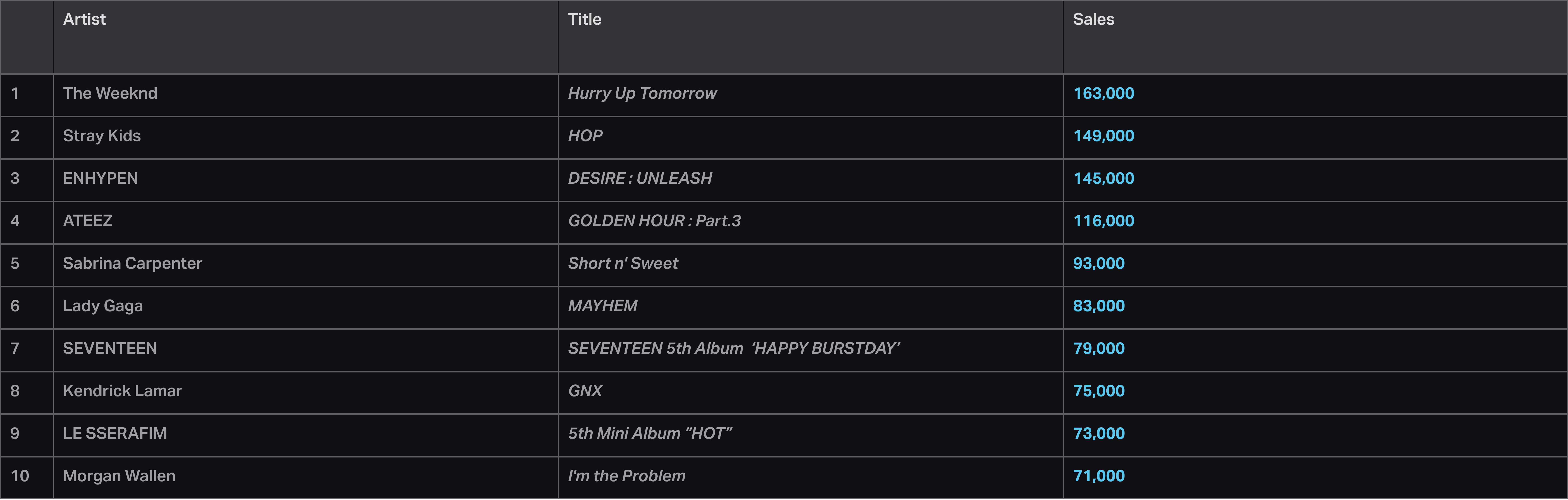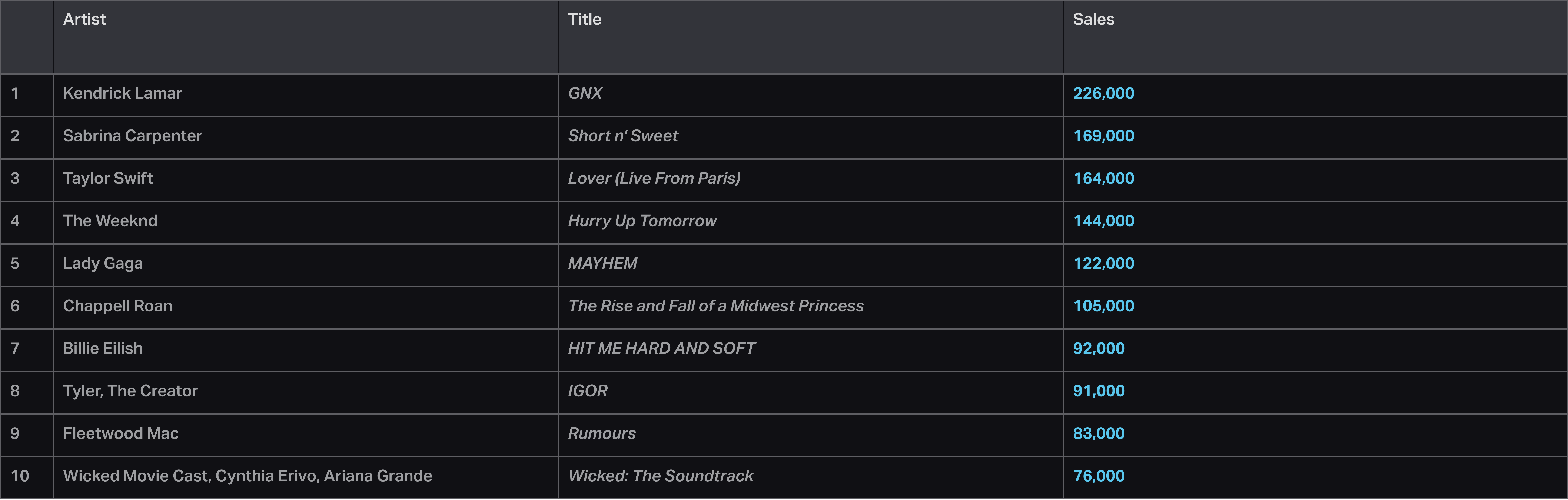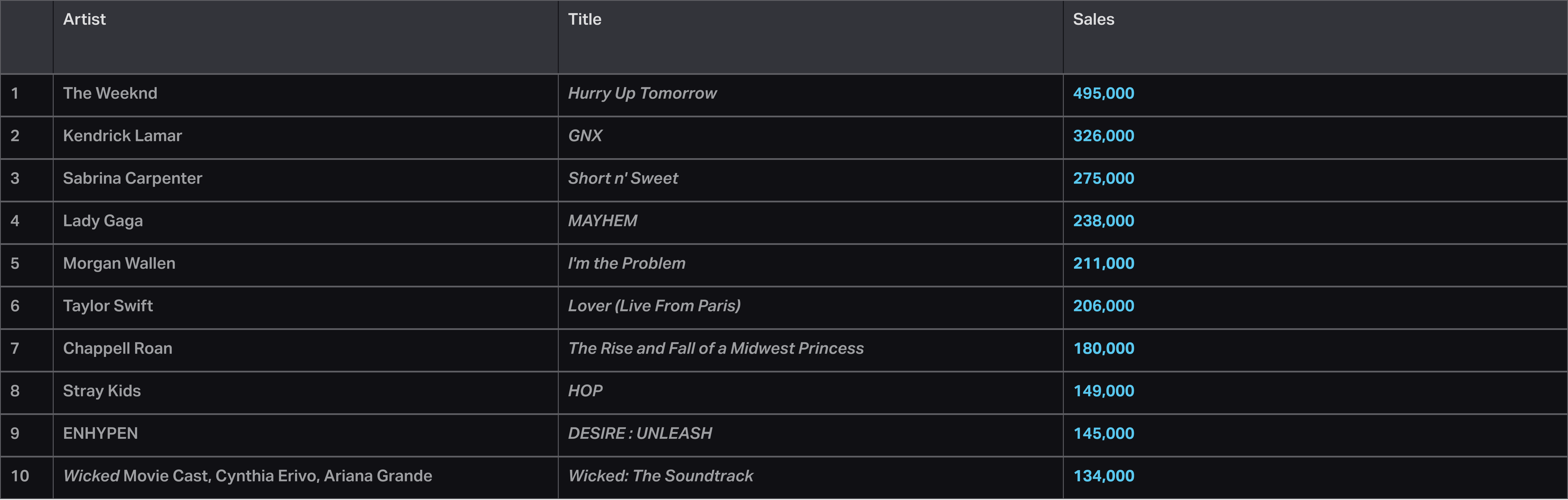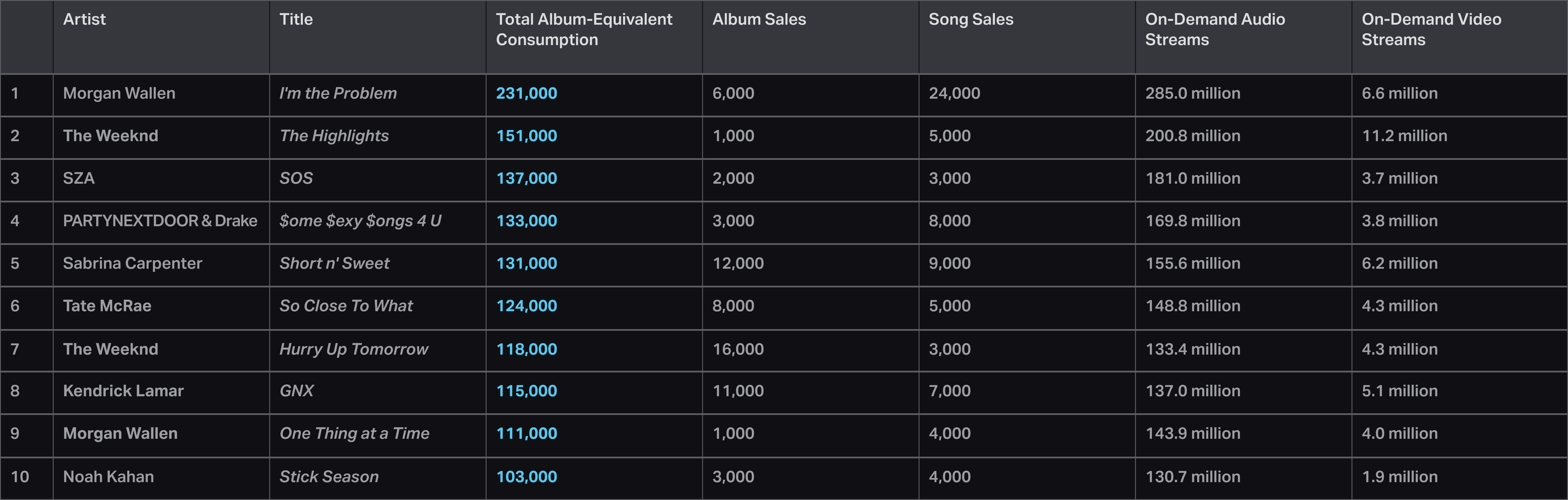 Top 10 Albums (Album Sales + TEA + on-demand SEA): Ranked by equivalent album units, comprising album sales, track equivalent albums (TEA) and streaming equivalent albums (SEA). Each unit = one album sale, or 10 tracks sold from an album, or 1,250 PREMIUM ON-DEMAND OFFICIAL STREAMS // 3,750 AD-SUPPORTED ON-DEMAND OFFICIAL STREAMS BY SONGS FROM AN ALBUM (UGC ON-DEMAND STREAMS NOT INCLUDEd)
