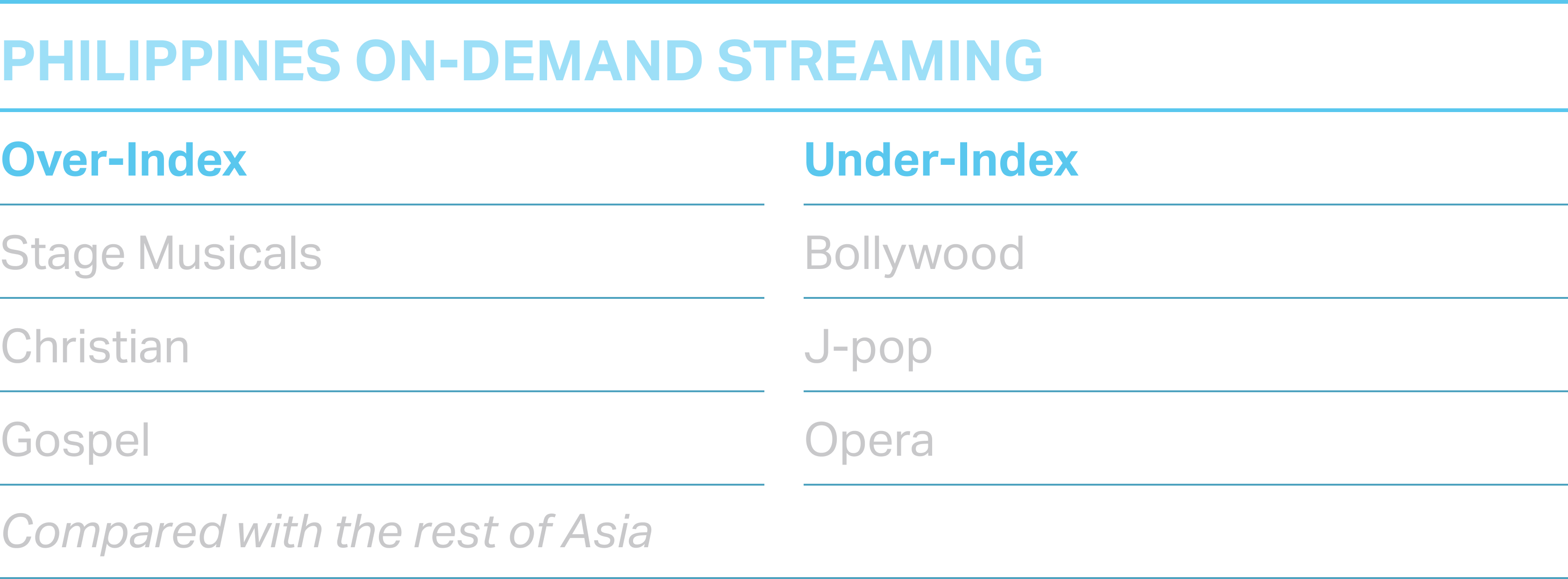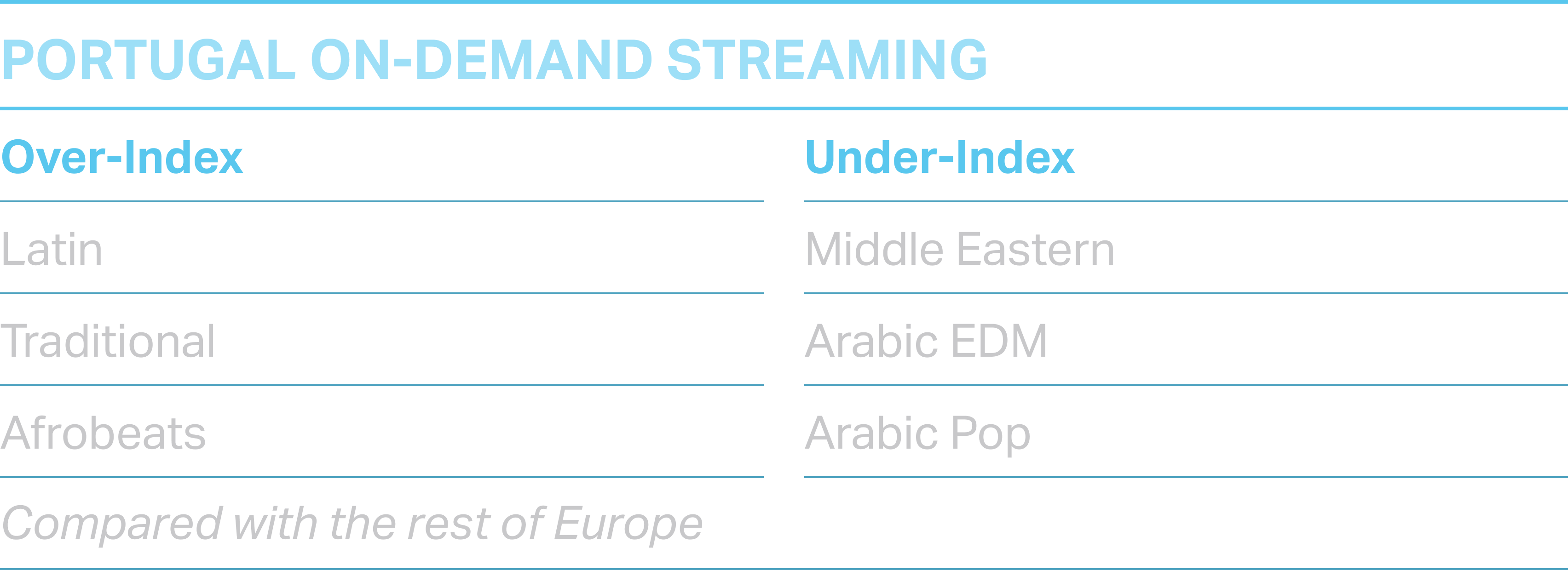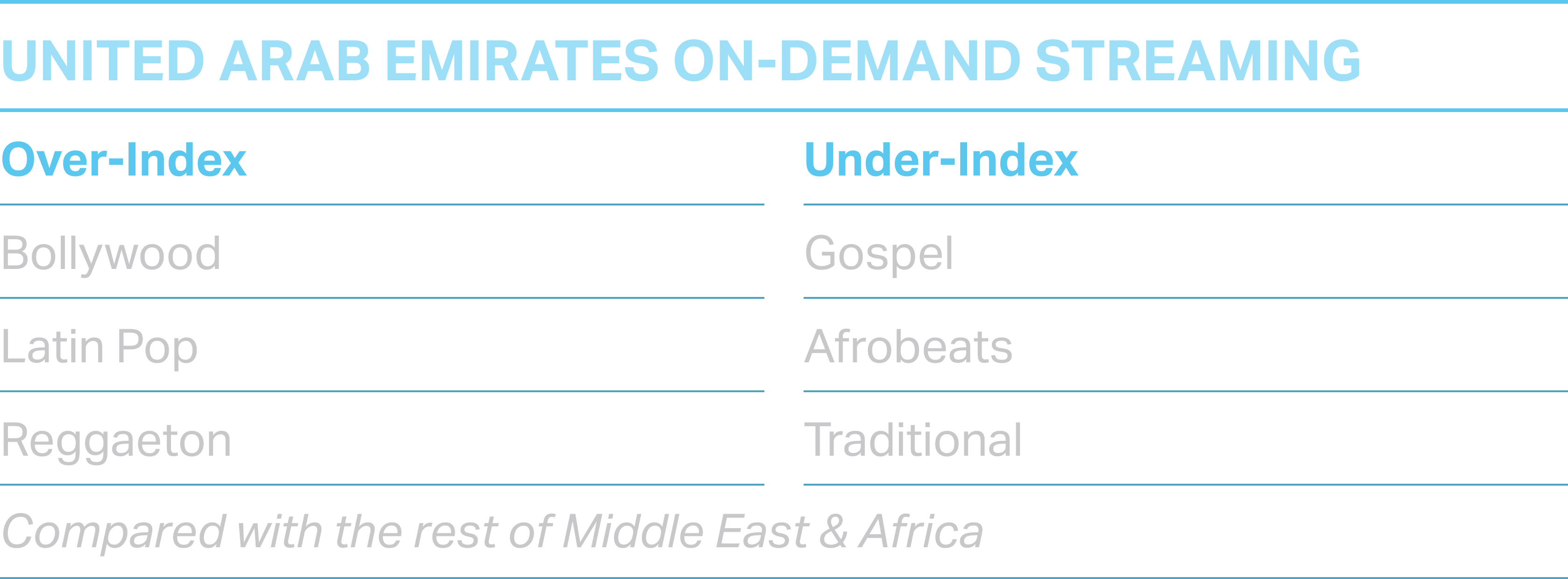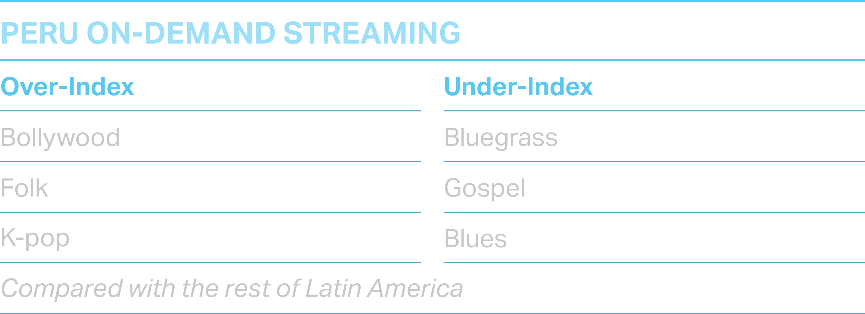 In those countries that import the most music from outside their home region, these genres over- or under-index compared with their neighboring markets.