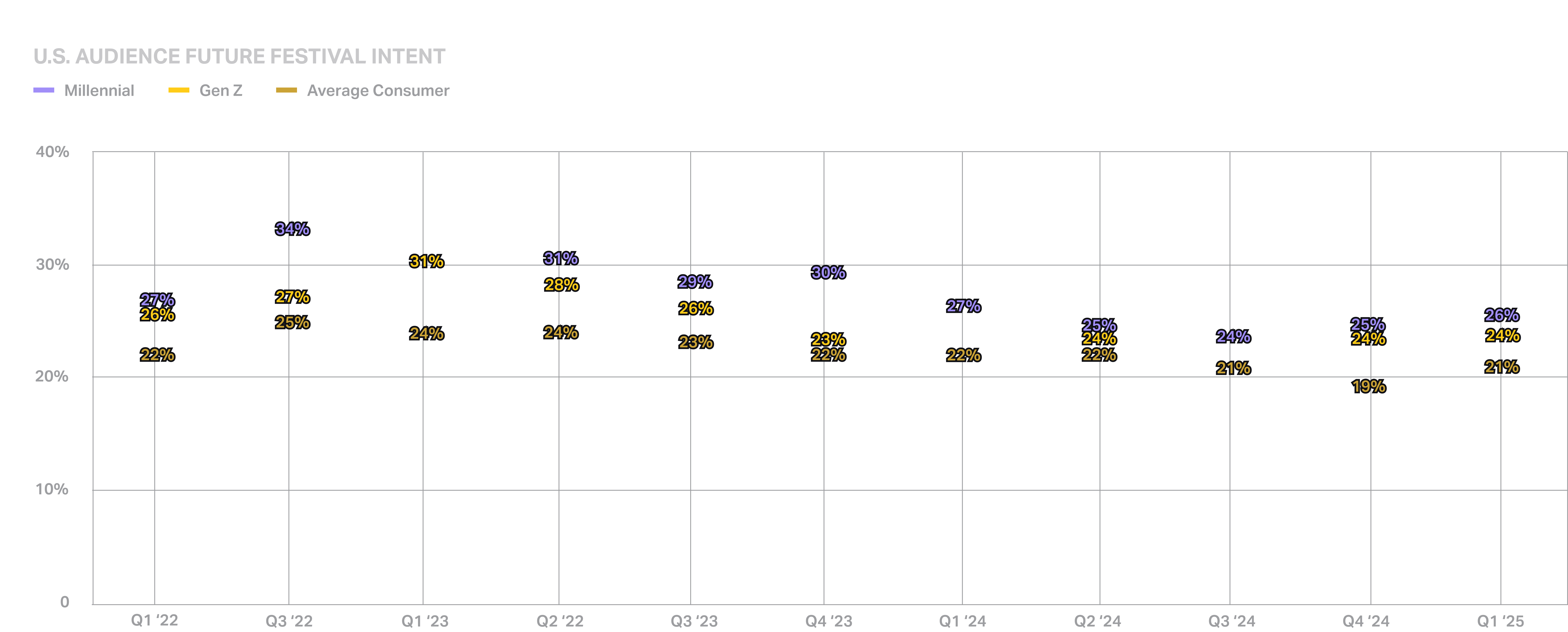 In Q1 2025, intention to attend festivals was lower than it has been historically in the U.S., especially among Millennials. This aligns with industry news of challenges for U.S. festivals over the past 18 months. The upshot: Q1 2025 marks the first instance in several years where future festival intent actually improved vs. the previous quarter among the average consumer.