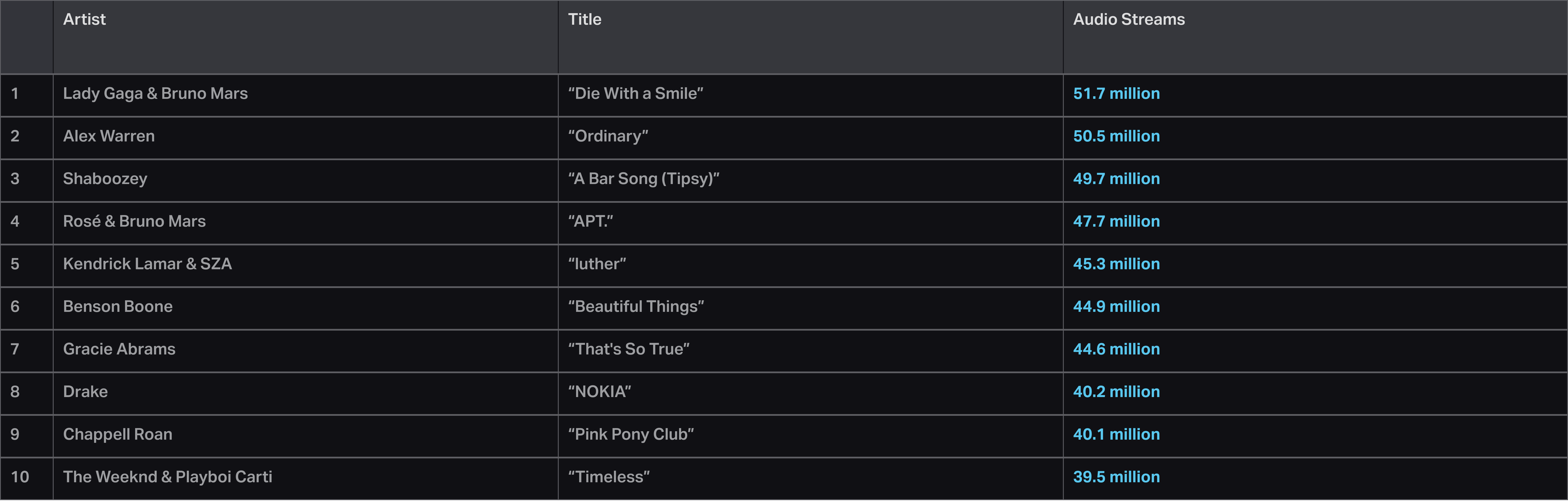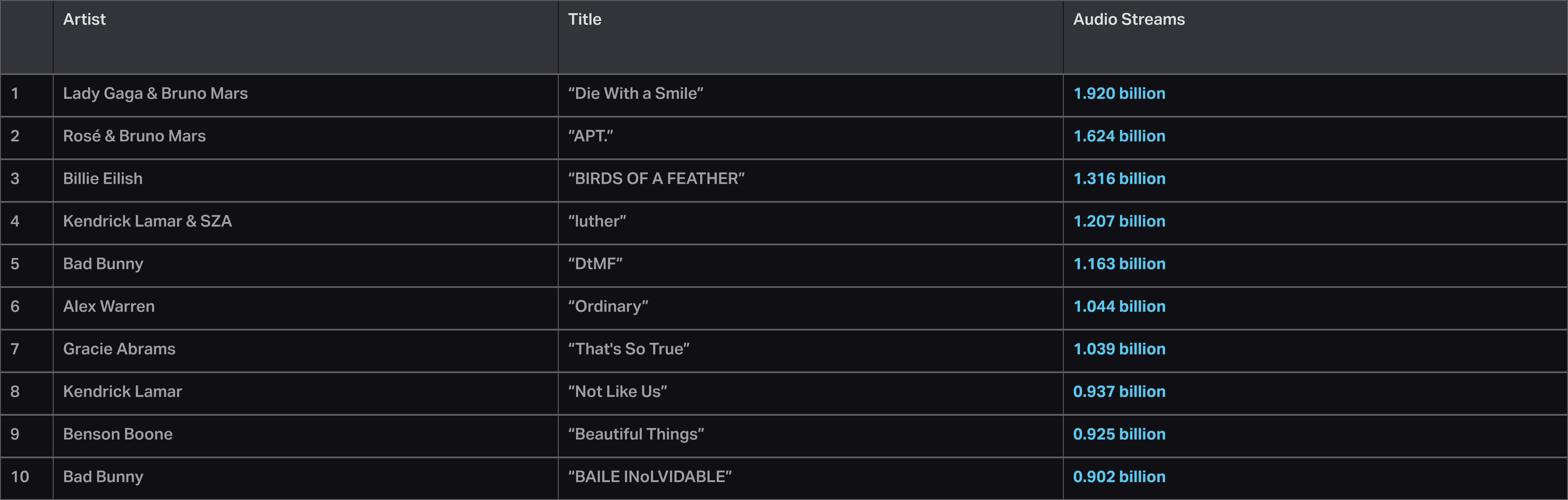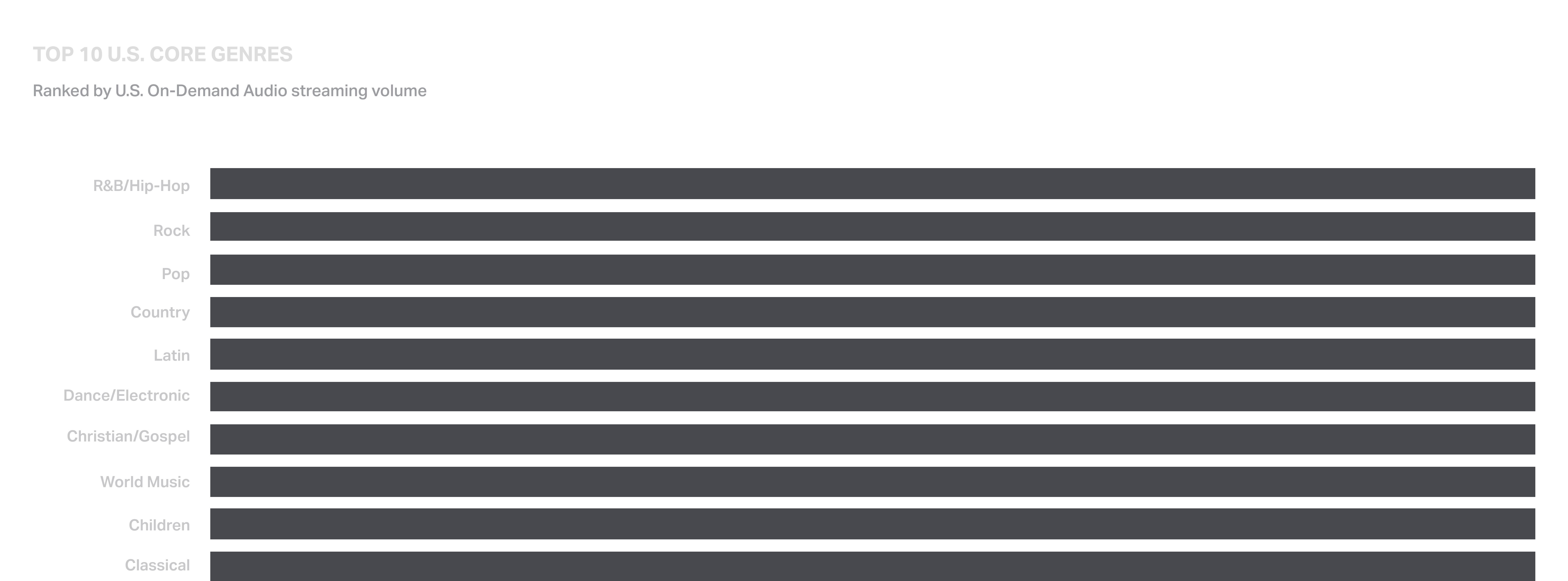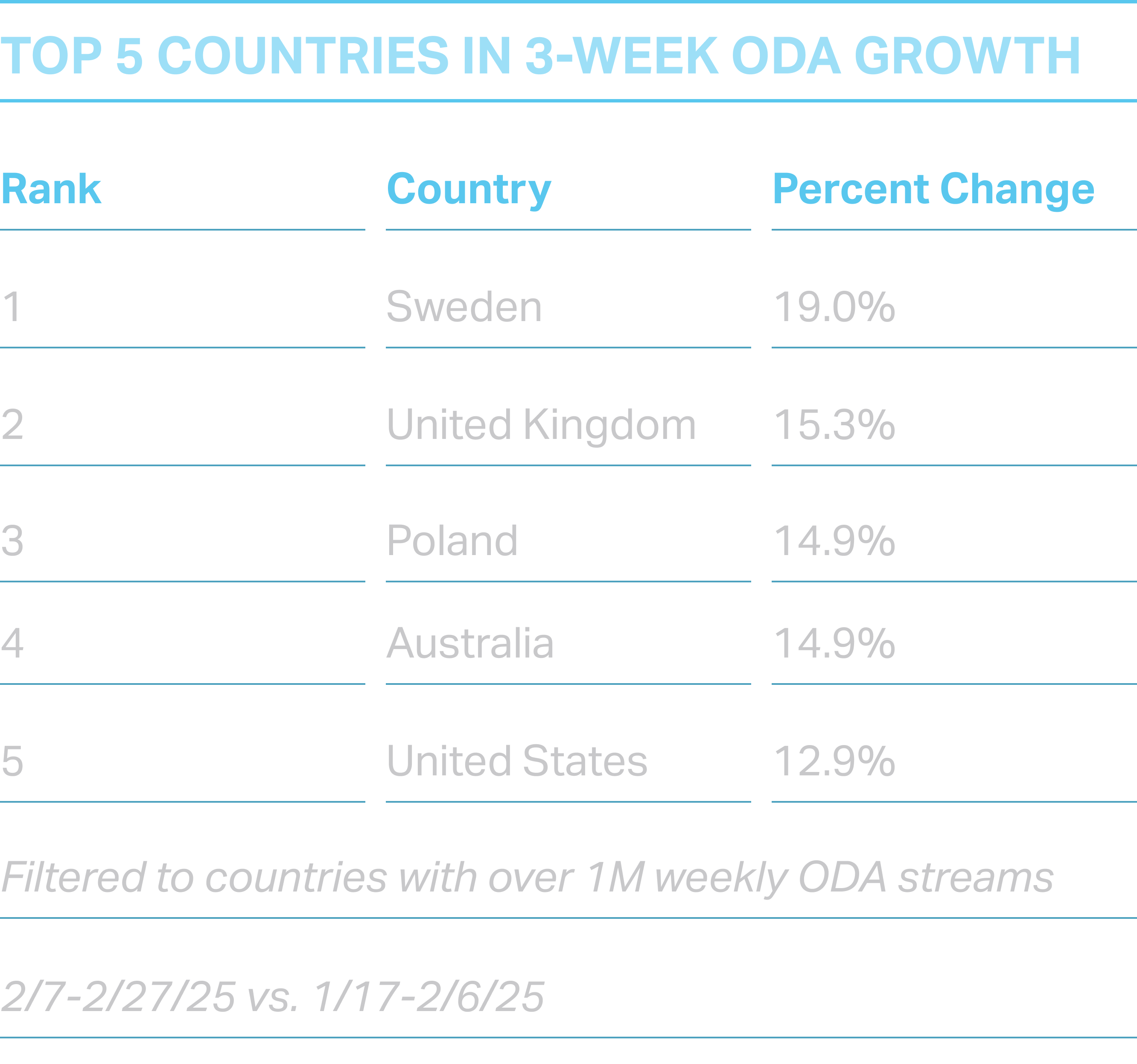 While the top 10 U.S. core genres remain the same as in 2024, Christian/Gospel passes World Music to place 7th in On-Demand Audio (ODA) volume, while Rock leads in growth and the Sinners Original Motion Picture Soundtrack and the adjacent activity of featured artists helps drive Blues.