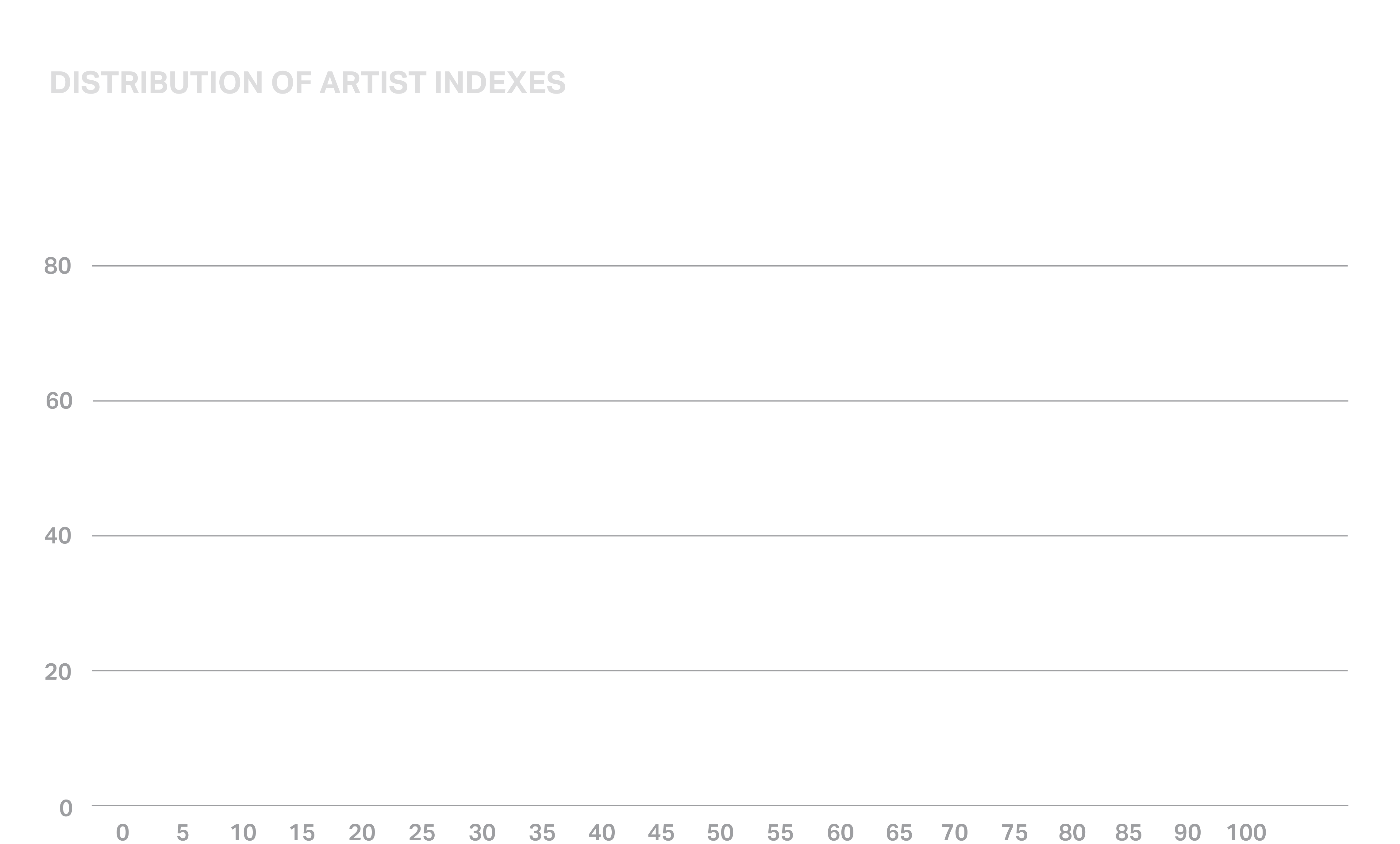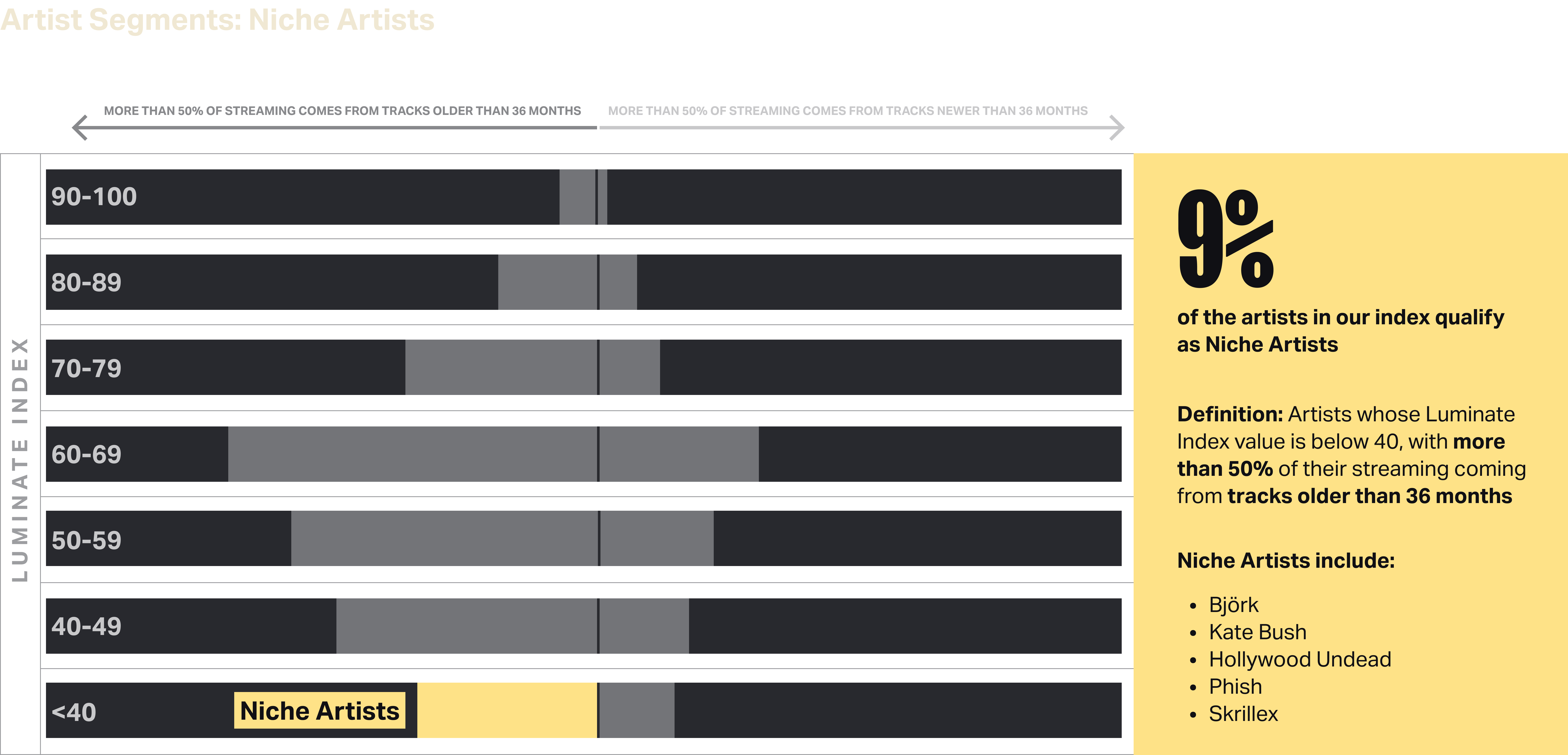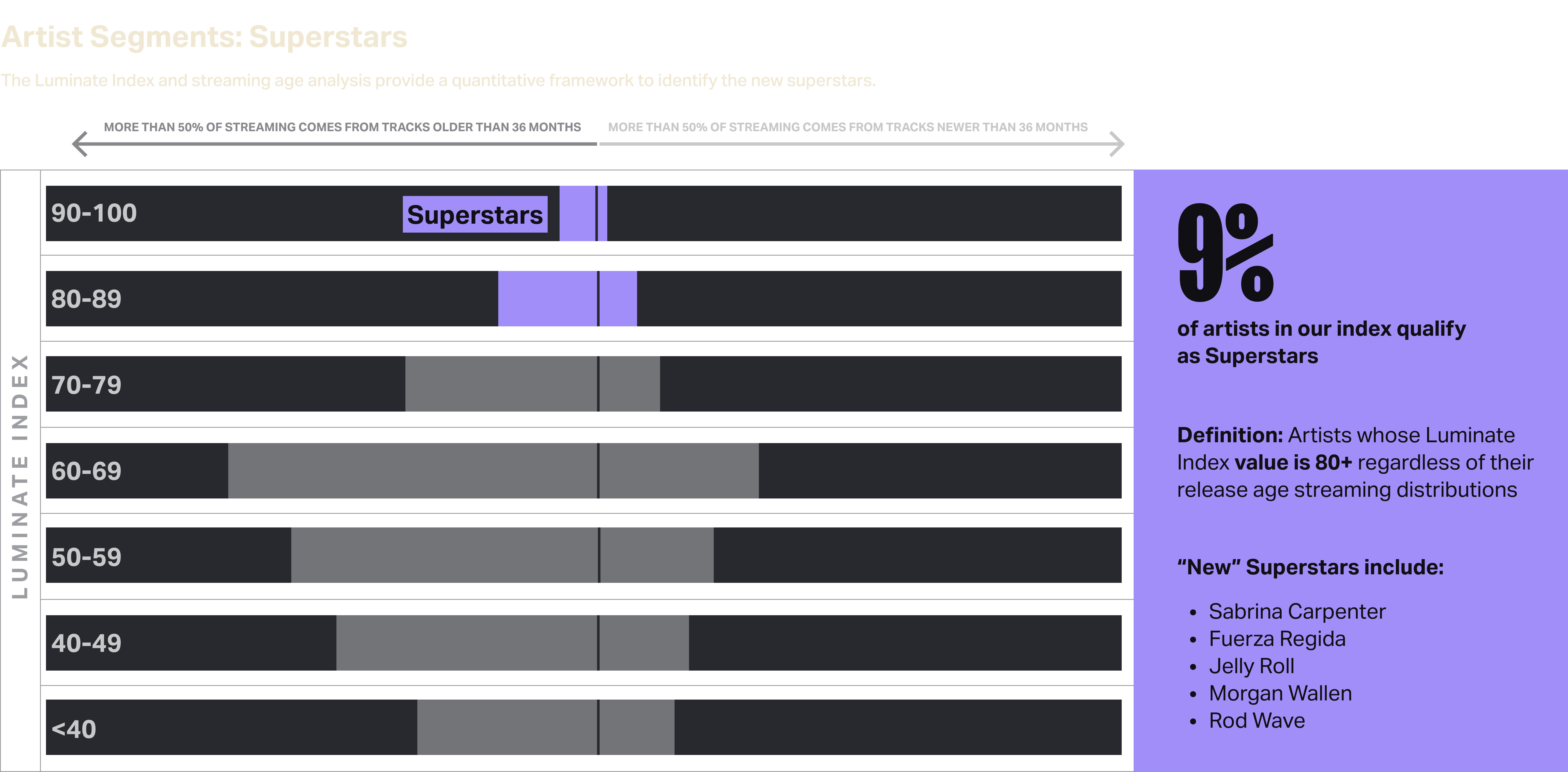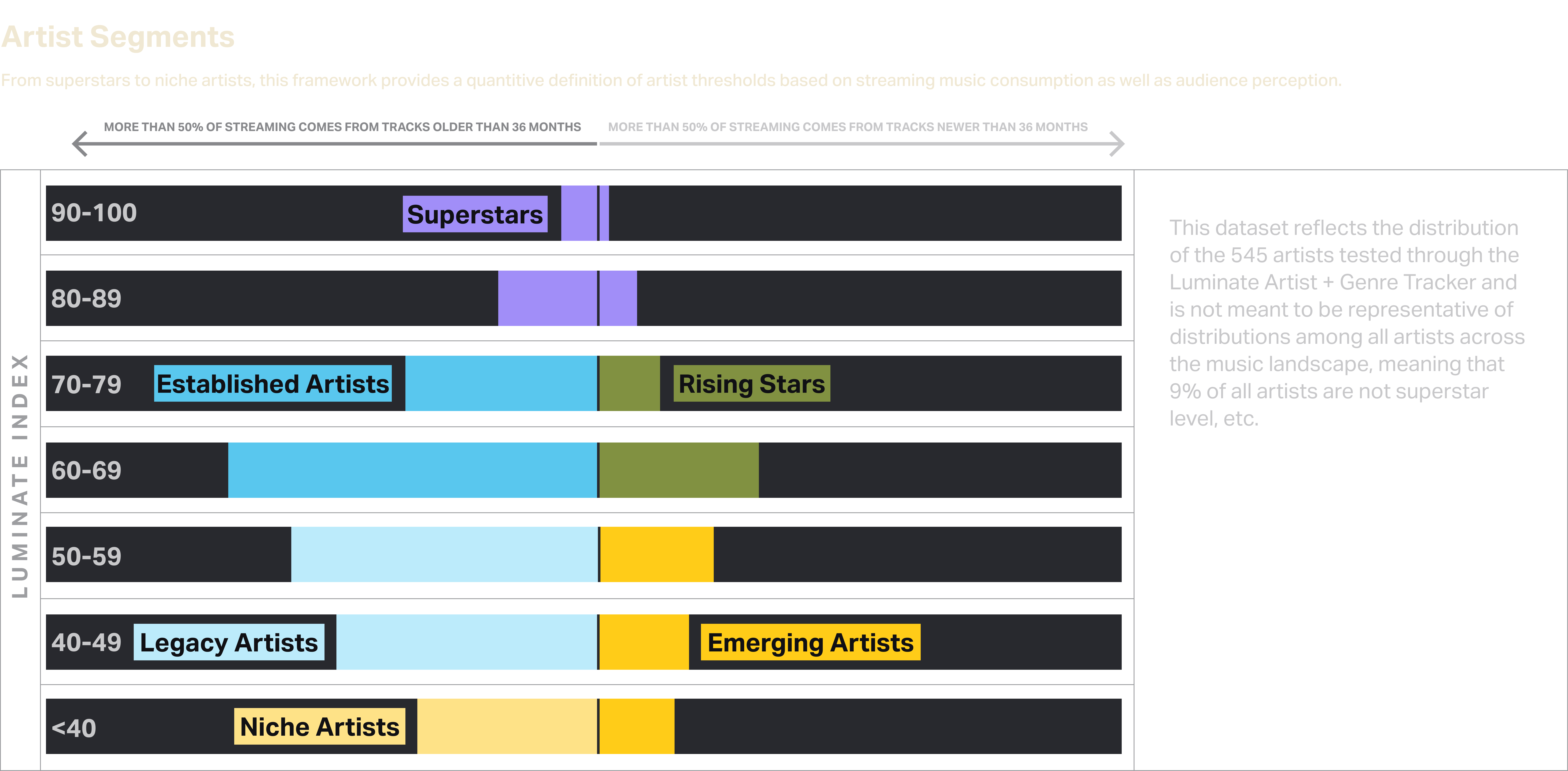 This dataset reflects the distribution of the 545 artists tested through the Luminate Artist + Genre Tracker and is not meant to be representative of distributions among all artists across the music landscape, meaning that 9% of all artists are not superstar level, etc.