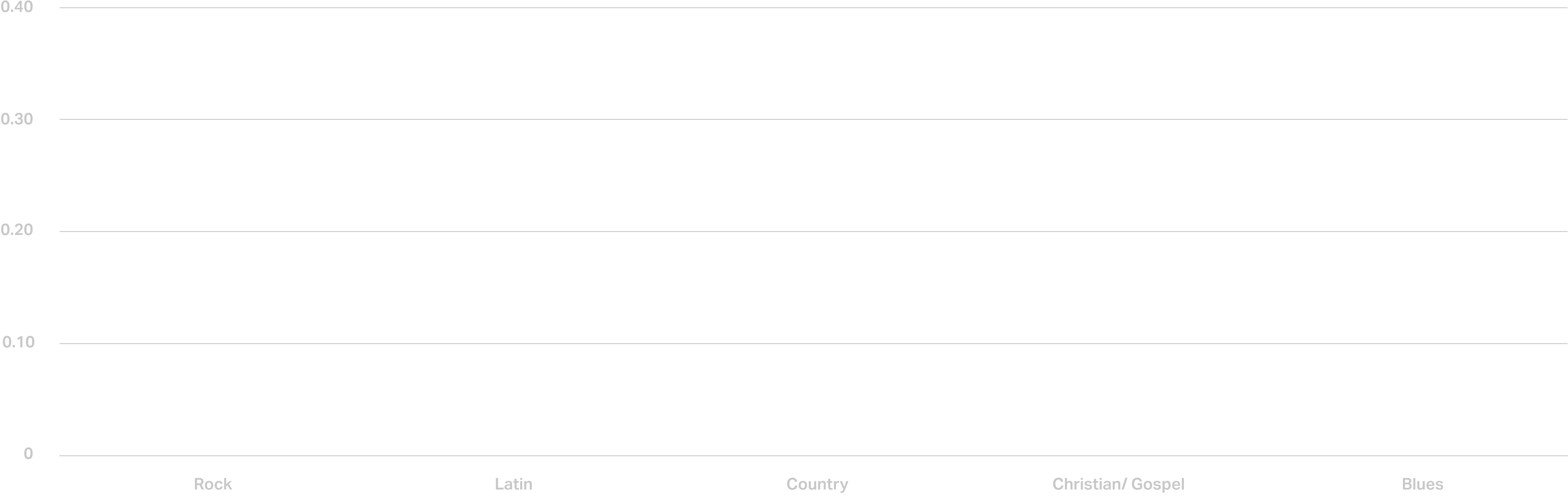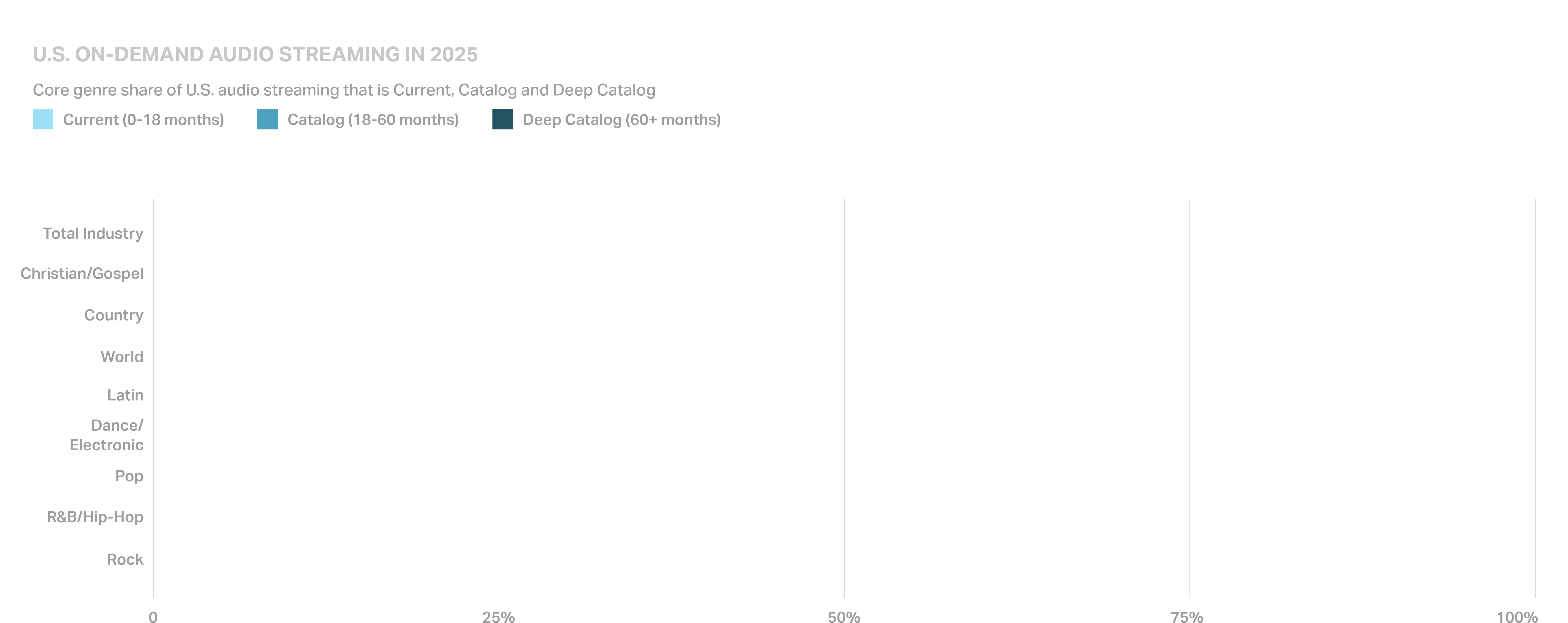Christian/Gospel streaming leans the most Current, at 33%; 35% of World Music streaming is from tracks 18-60 months old, while 69% of Rock streaming is from music older than 60 months.