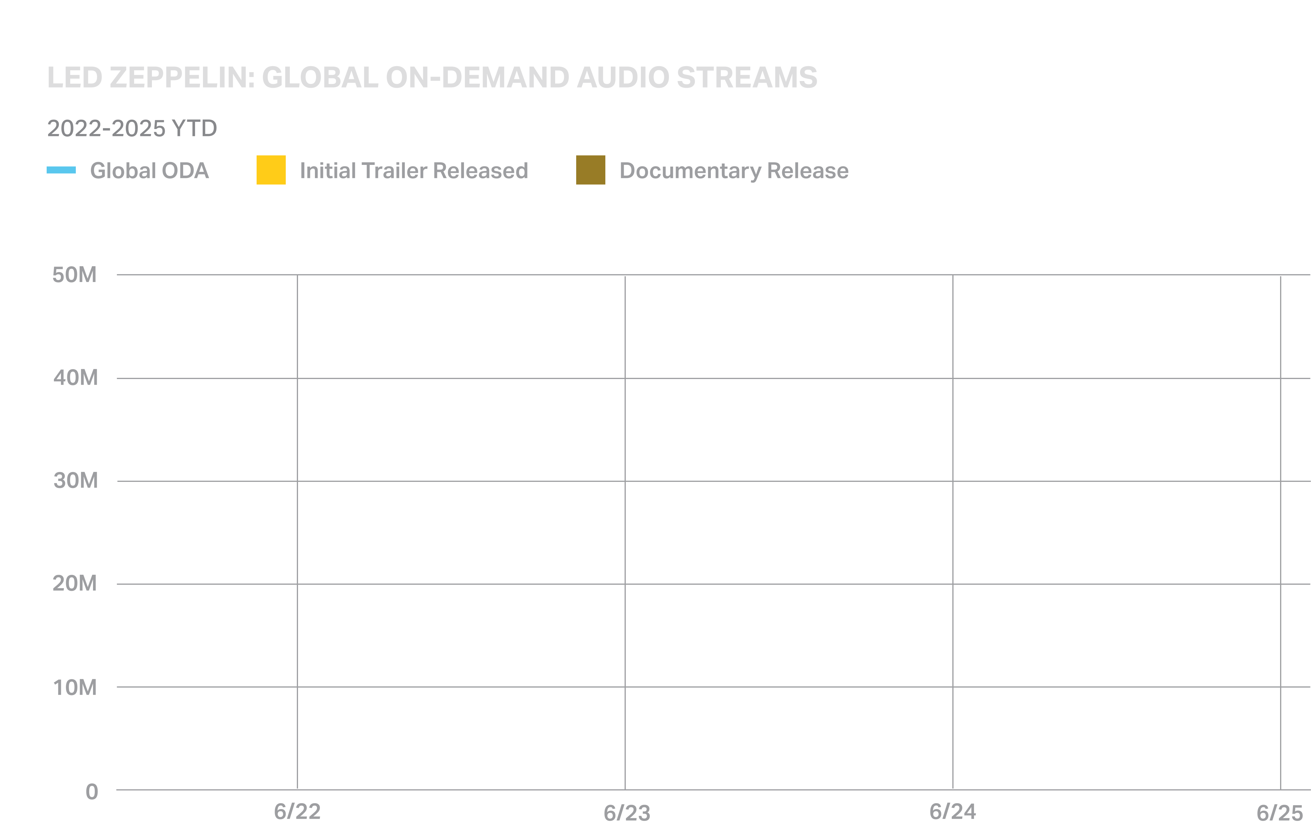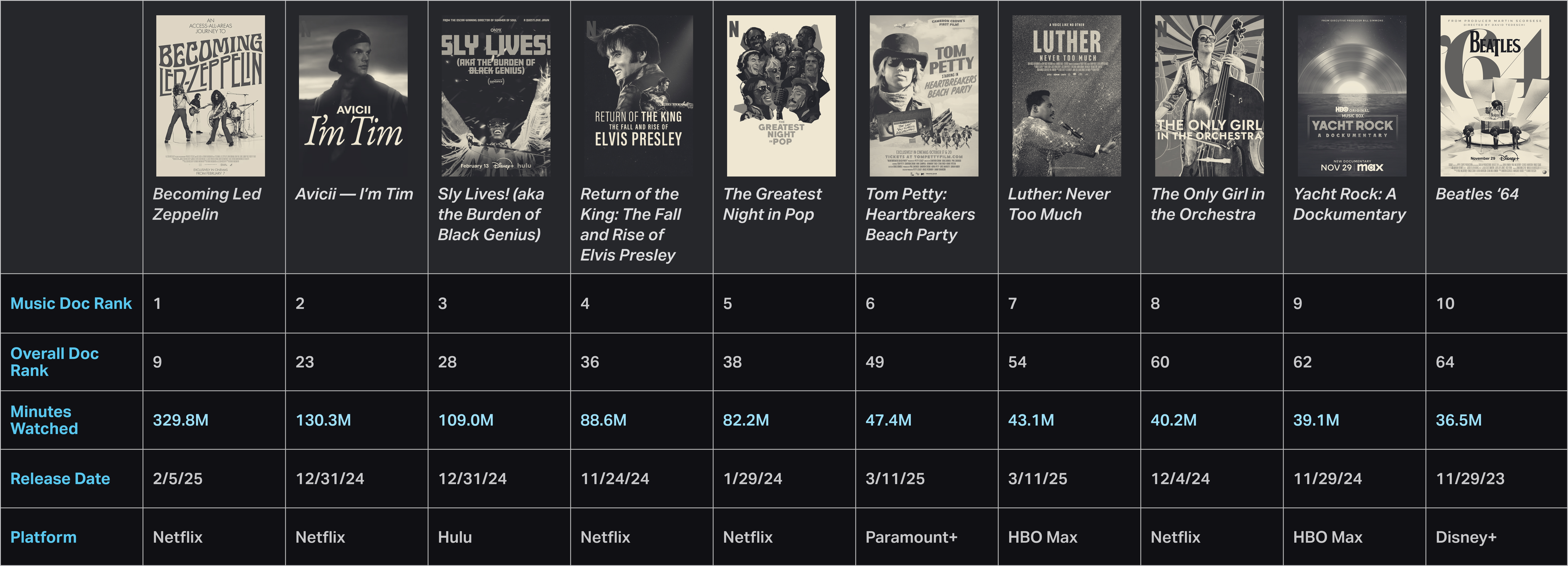 Becoming Led Zeppelin ranks #1 in minutes watched, driving the iconic rock band’s Global On-Demand Audio streams to their highest-ever weekly peak: 40.4M for the week ending 2/27/25. Led Zeppelin’s streams have also sustained a new baseline average of 39M per week through 7/03/25, which is +23% over the previous period.