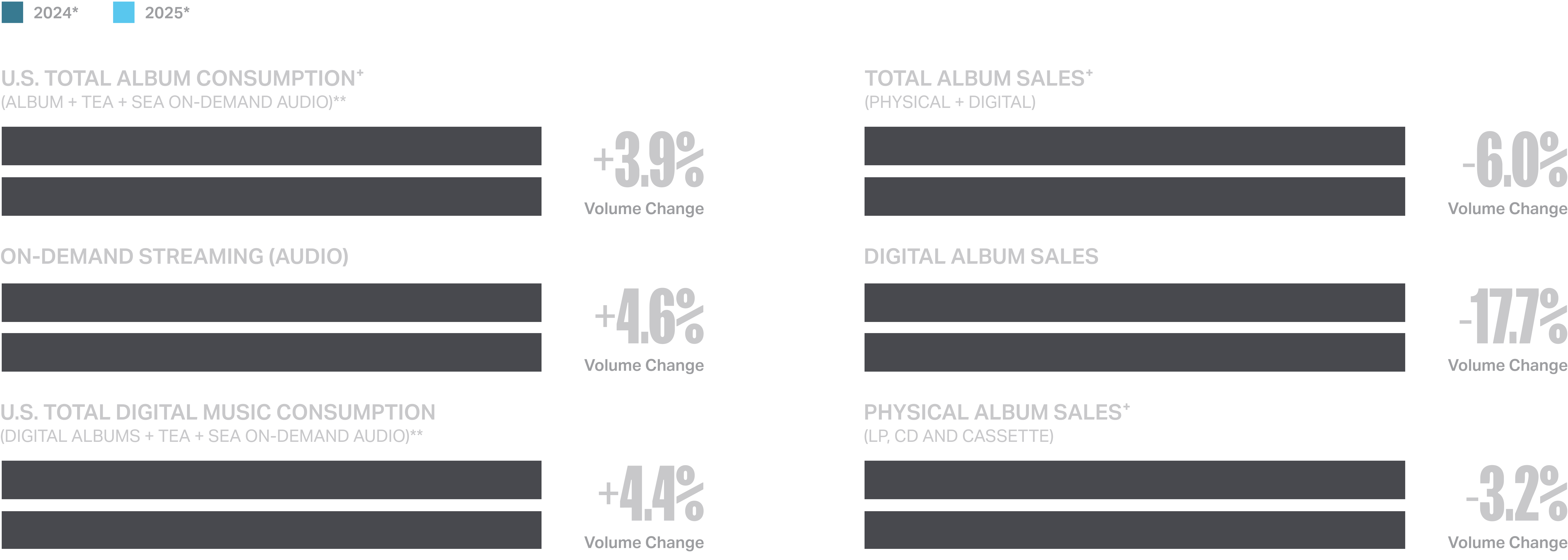 *1/3/25 - 7/3/25 (As compared to 12/29/23 - 6/27/24)** SEA (STREAM-EQUIVALENT ALBUMS): 1250 PREMIUM STREAMS = ONE ALBUM // 3750 AD-SUPPORTED STREAMS = ONE ALBUM; TEA (TRACK-EQUIVALENT ALBUMS): 10 DIGITAL TRACKS = ONE ALBUM+U.S. physical sales metrics include modeled independent retail numbers. See Methodology and FAQ section at the back of this report for moreSOURCE: LUMINATE CONSUMPTION DATA