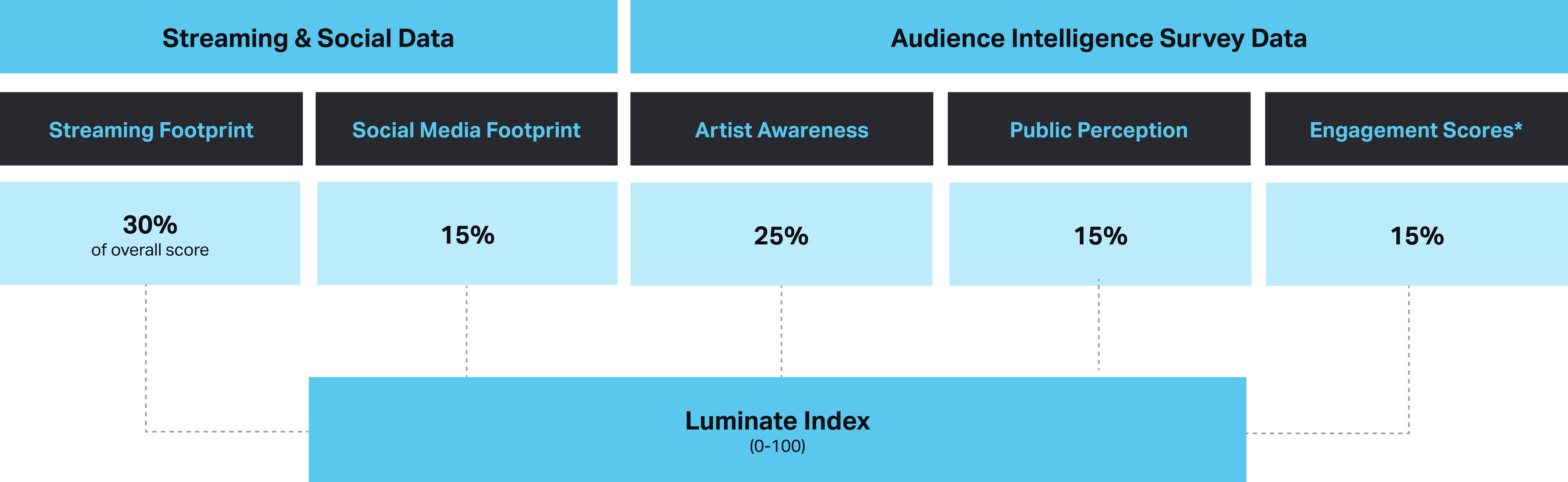 The Luminate Index is a composite metric meant to provide labels, brands and agencies with an understanding of the depth, breadth and affinity of an artist’s fandom among U.S. consumers.