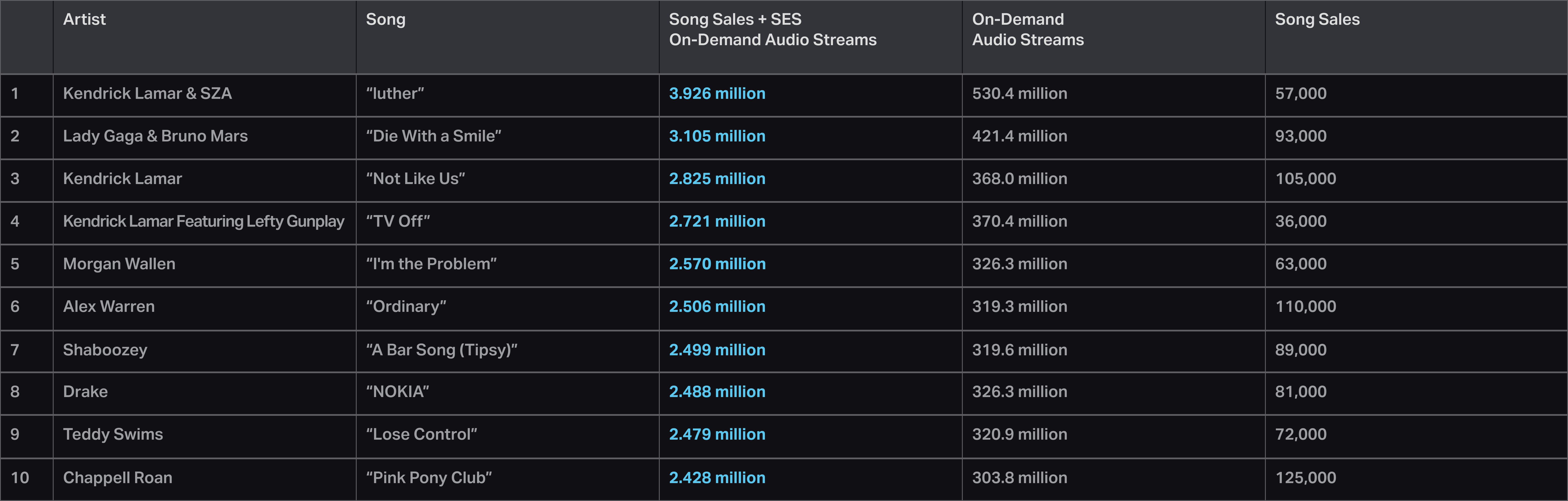 * Top 10 Digital Song Consumption: Ranked by traditional digital song sales + SES units, where 125 premium streams = one song // 375 ad-supported streams = one song;ON-DEMAND VIDEO SONG STREAMING INCLUDES OFFICIAL, SONG UGC AND NON-SONG UGC