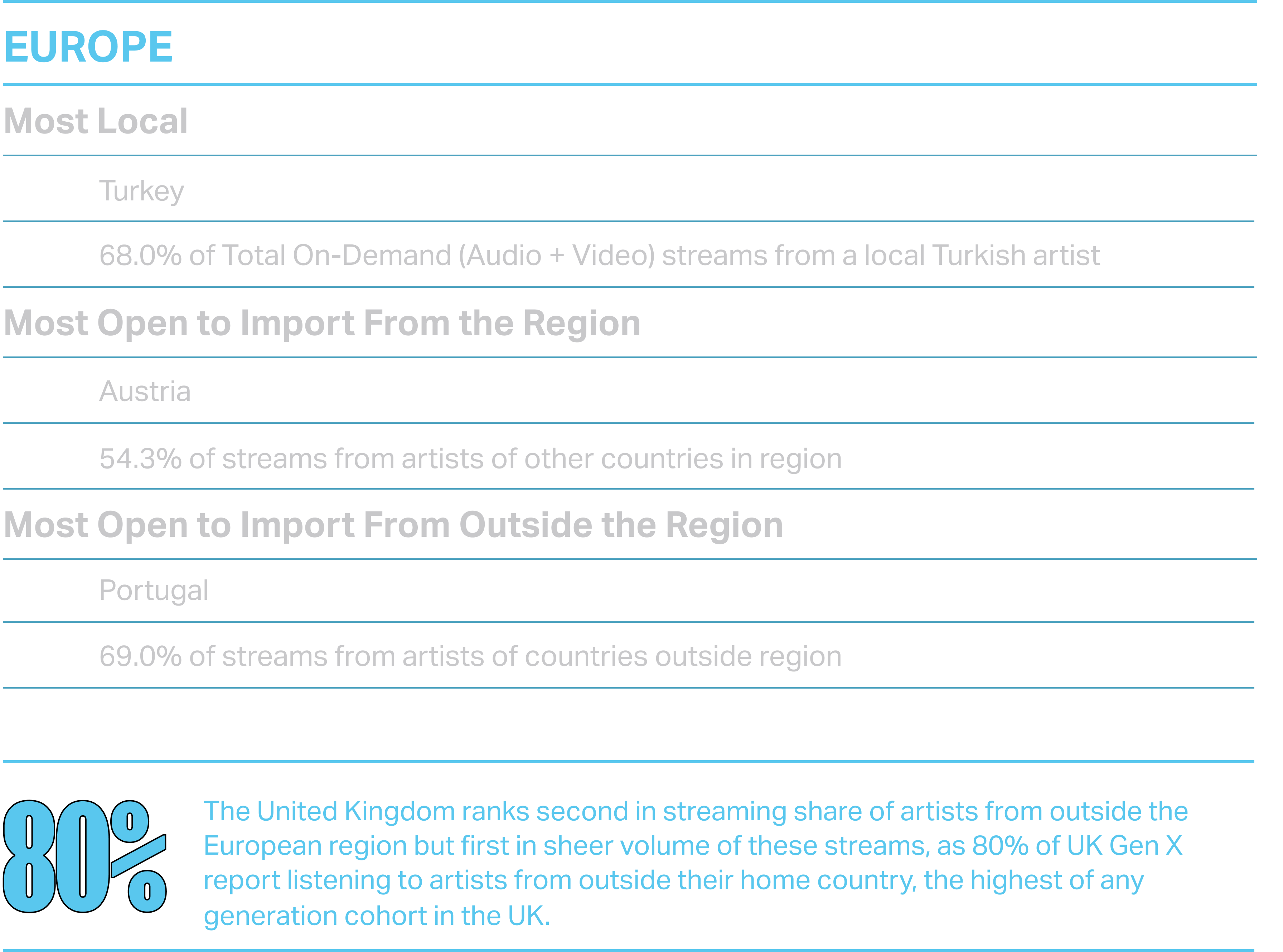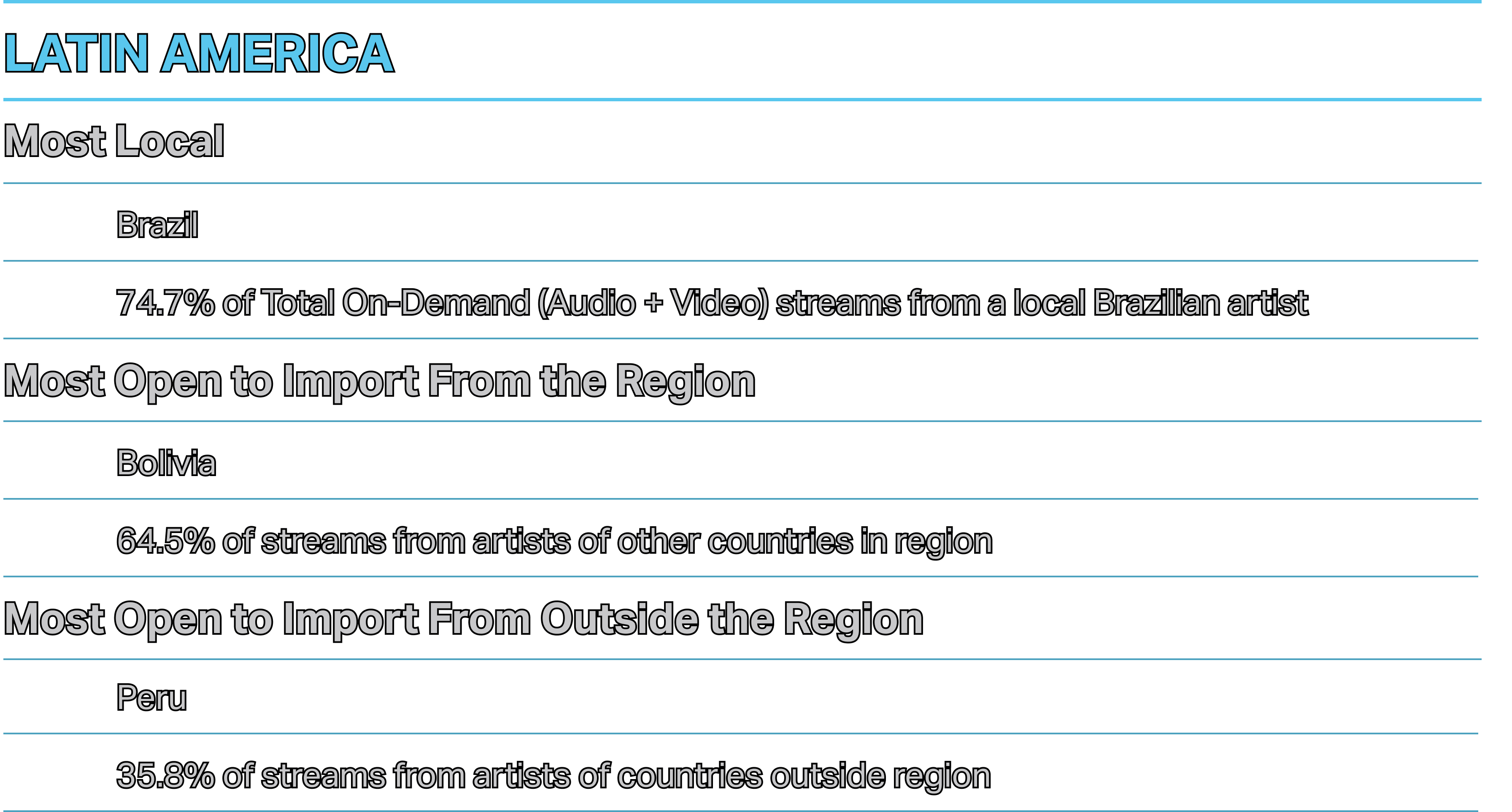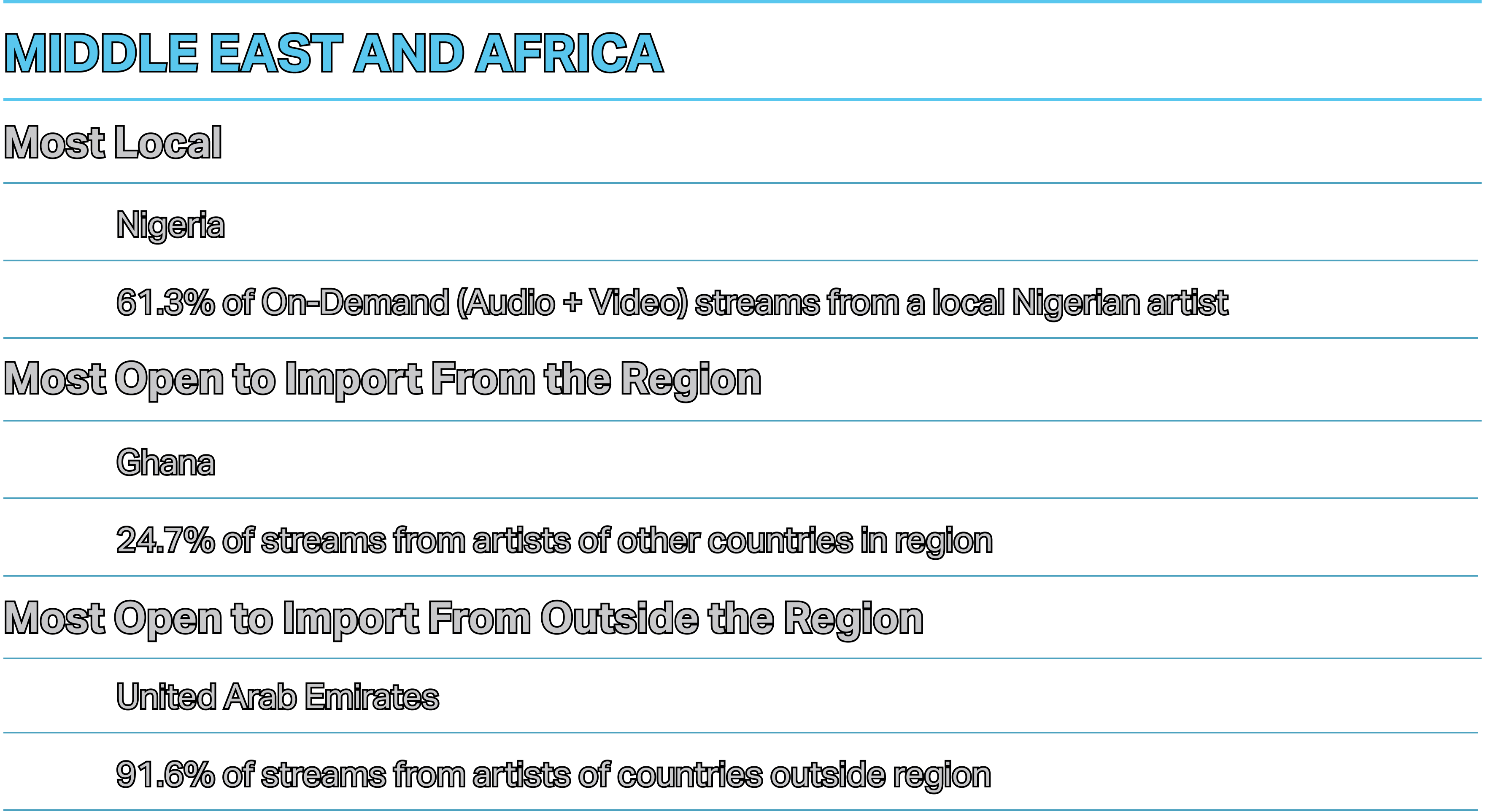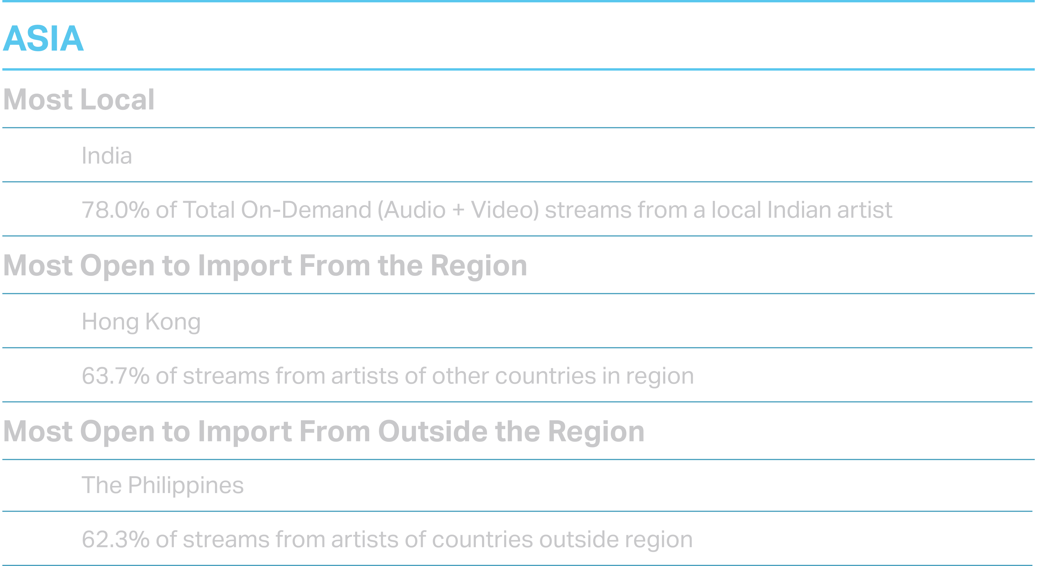 An analysis of streaming share that is local, regional and ex-regional artists helps to identify countries that are importers and exporters throughout specific regions. This aids in understanding how music spreads globally, helps businesses identify relevant joint-venture relationships and answers such questions as which markets are the most insulated or native in their streaming behavior.