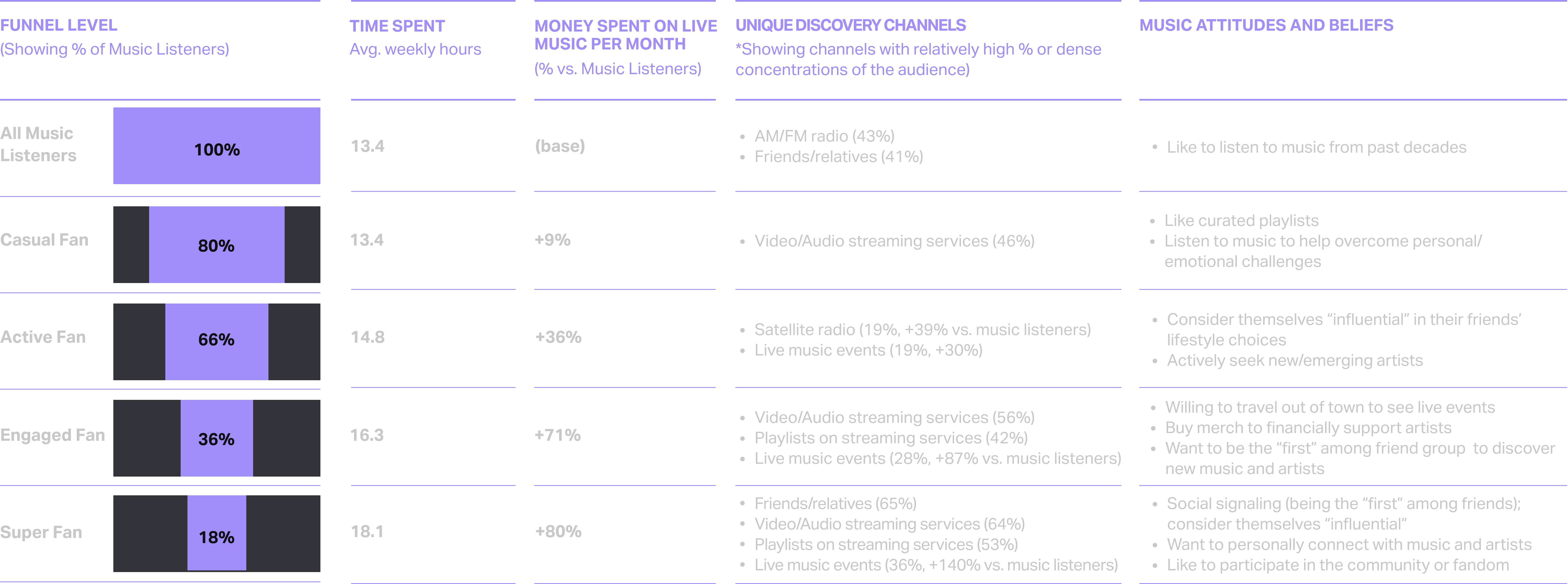 Different behaviors are evident at each level of fandom. For instance, Active Fans spend 14.8 hours with music weekly, but Engaged Fans spend not only more time with music but money